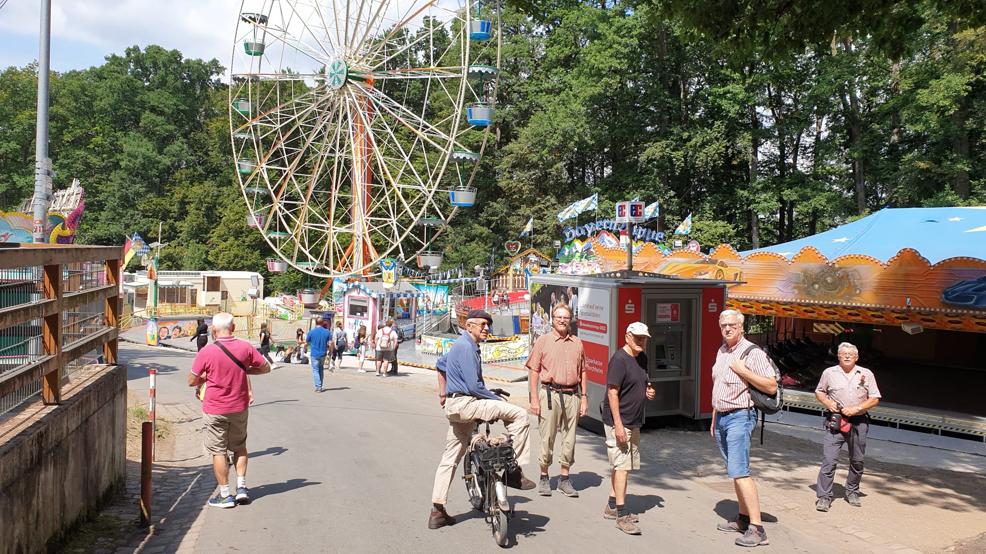Wir besuchen das Annafest Da wir mit hohen Temperaturen gerechnet hatten, haben wir uns heute eine kurze Strecke für unsere Wanderung zum Annafest ausgesucht. Allerdings durften wir dann doch bei angenehmem Wanderwetter starten. Und das war gut so, denn die Teerstrecke bis Reuth und der "Anstieg" dort, wäre bei höheren Temperaturen sicherlich unangenehm gewesen. So waren wir frisch und voller Tatendrang und konnten Dank Willis fundiertem Wissen schon während der Durchquerung des Tales die wichtigsten weltpolitischen Probleme lösen, bis dann im Ort das muntere Plaudern in leises Schnaufen über ging. Wir starteten heute also am Bahnhof von Wiesenthau (wohin uns natürlich unser 9,- Euro Ticket brachte), überquerten das Wiesenttal und erklommen über die Kindergartenstraße schon Kellerwaldhöhe. Auf der Hut waren wir, als wir in der Straße mit selbigem Namen nach links in den Wald einbogen. Ab hier liefen wir in einem wirklich sehr schönen Laubwald mit anfangs urigen, wurzeldurchzogenen Pfaden. Den Wurzelweg hatte Henry extra für Achim ausgesucht, damit der sich mehr auf den Weg als auf seine noch zu erfindenden selbstständig das Ziel findenden Panzergranaten konzentrieren musste. Nach knapp einer Stunde wurden die Wege breiter, die ersten Hinweisschilder zum Annafest tauchten auf und dann waren wir auch schon im Kellerwald. Beim Winterbauer stärkten