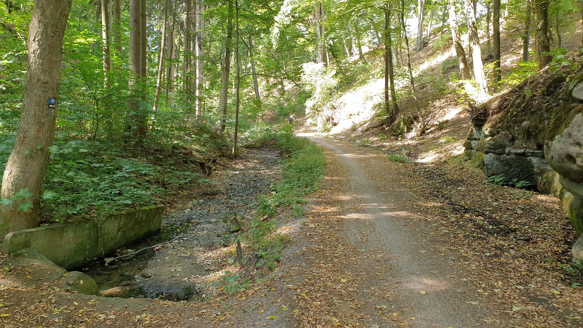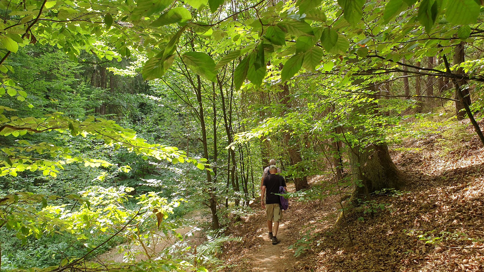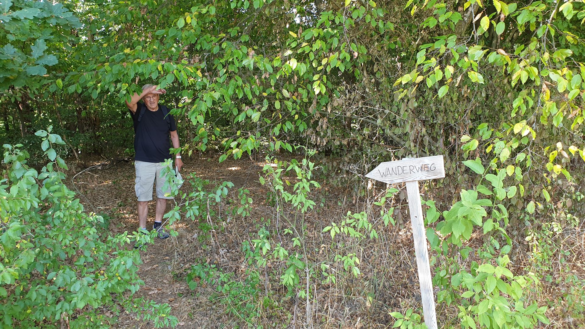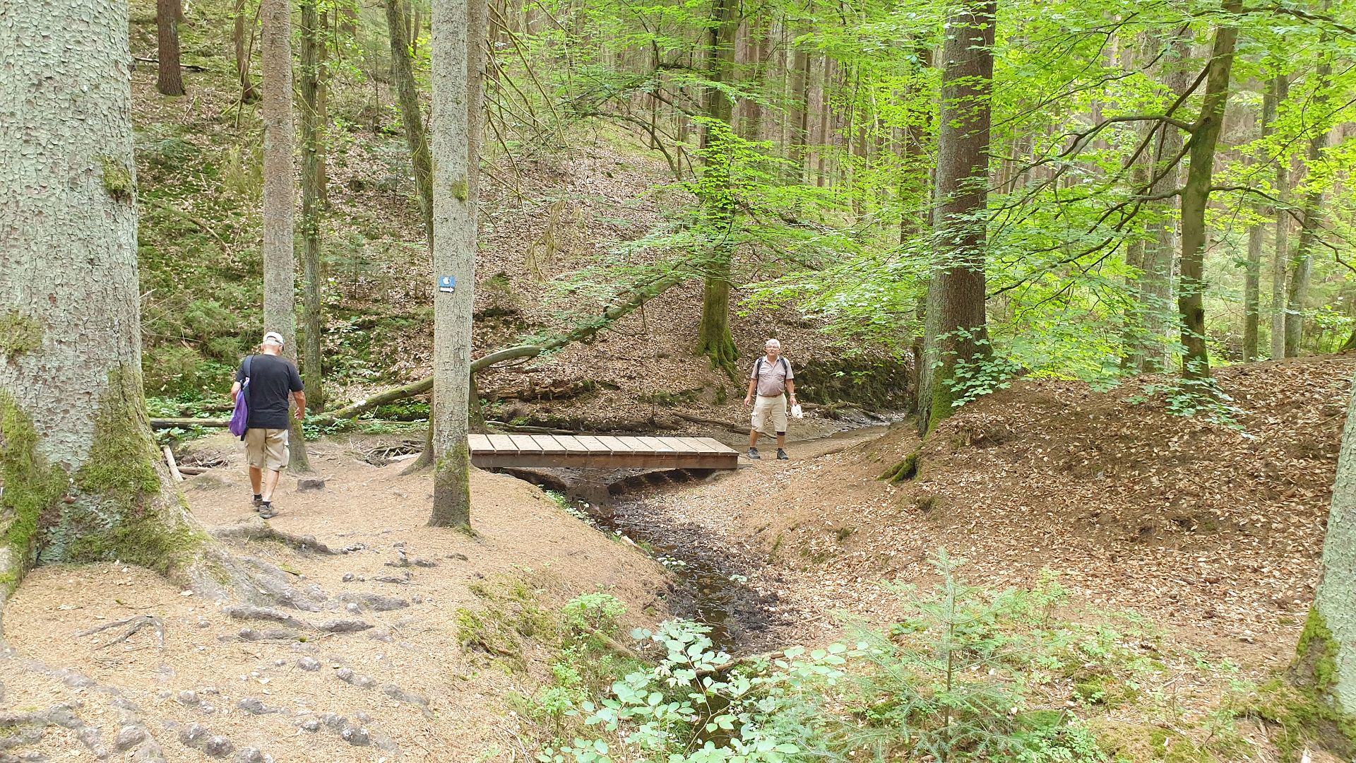 wieder zu verlassen. Wir nahmen also nach einem knappen Kilometer den kürzesten Weg in den kühlen Wald. Wegen einer Baustelle mussten wir noch einen kleinen Umweg durch Unterholz in kauf nehmen, bevor wir bei jetzt angenehmen Temperaturen am Fröschauer Weiher entlang liefen. Nach dem Überqueren der Straße am Ende der Weiher heißt es aufgepasst: Der Weg in den Wald auf der gegenüberliegenden Seite ist nur schwer zu finden. Und er führt - ohne besonderen Hinweis und auch schlecht zu erkennen - gleich rechts steil bergan. Oben, am Ende des Waldes, erfährt man dann durch ein Hinweisschild, dass das wirklich sehr schlecht gekennzeichnete rutschige Steilstück tatsächlich ein Wanderweg war! Wir überqueren ein (in der Hitze als sehr lang empfundenes) Brachstück und gelangen an dessen Ende in einen schönen Wald und nach einer Weile in eine "Kathedrale" aus jungen Buchen: schön anzusehen und schön kühl. Dann folgt noch ein kurzes Wegstück in der prallen Sonne, bevor wir uns im Gasthaus "Weißes Kreuz" im Schatten niederlassen. Hier werden hervorragend verpflegt. Nach einer entspannenden