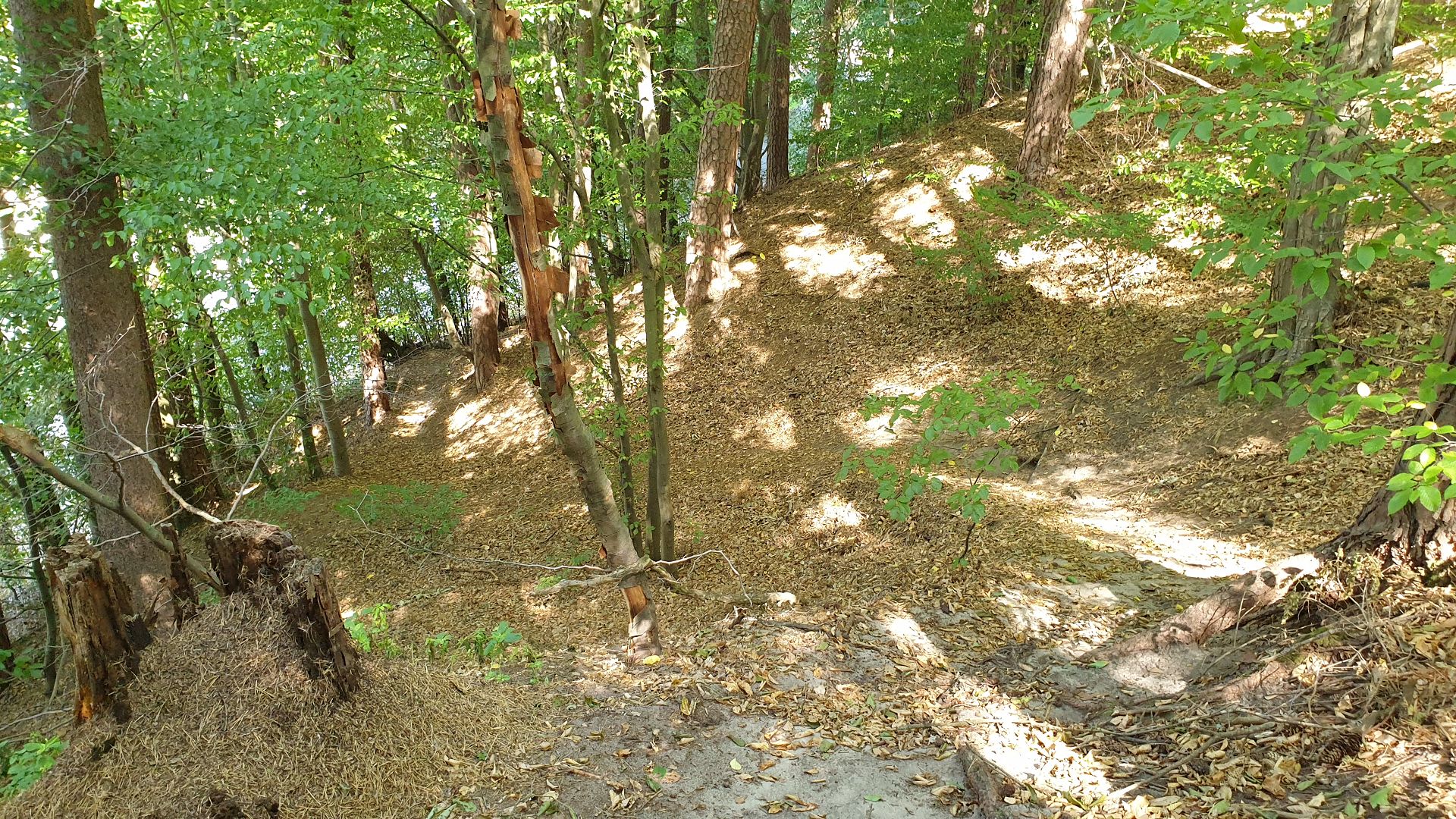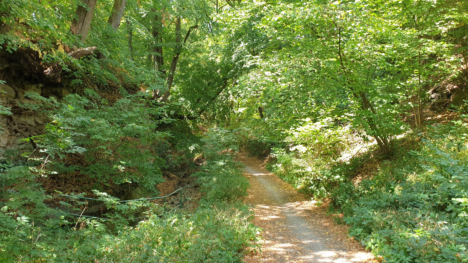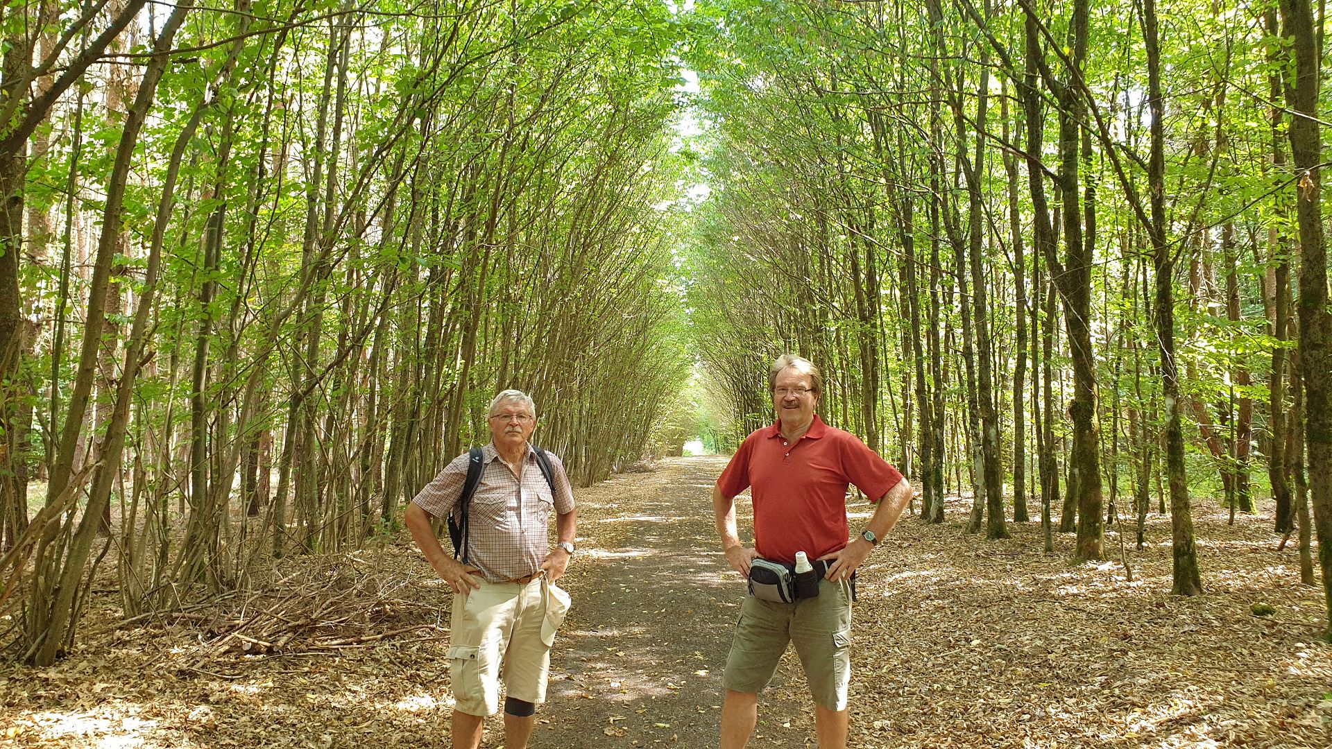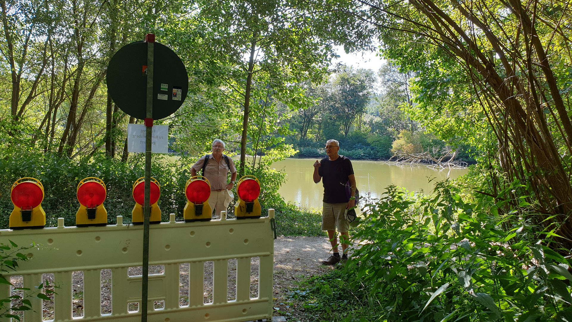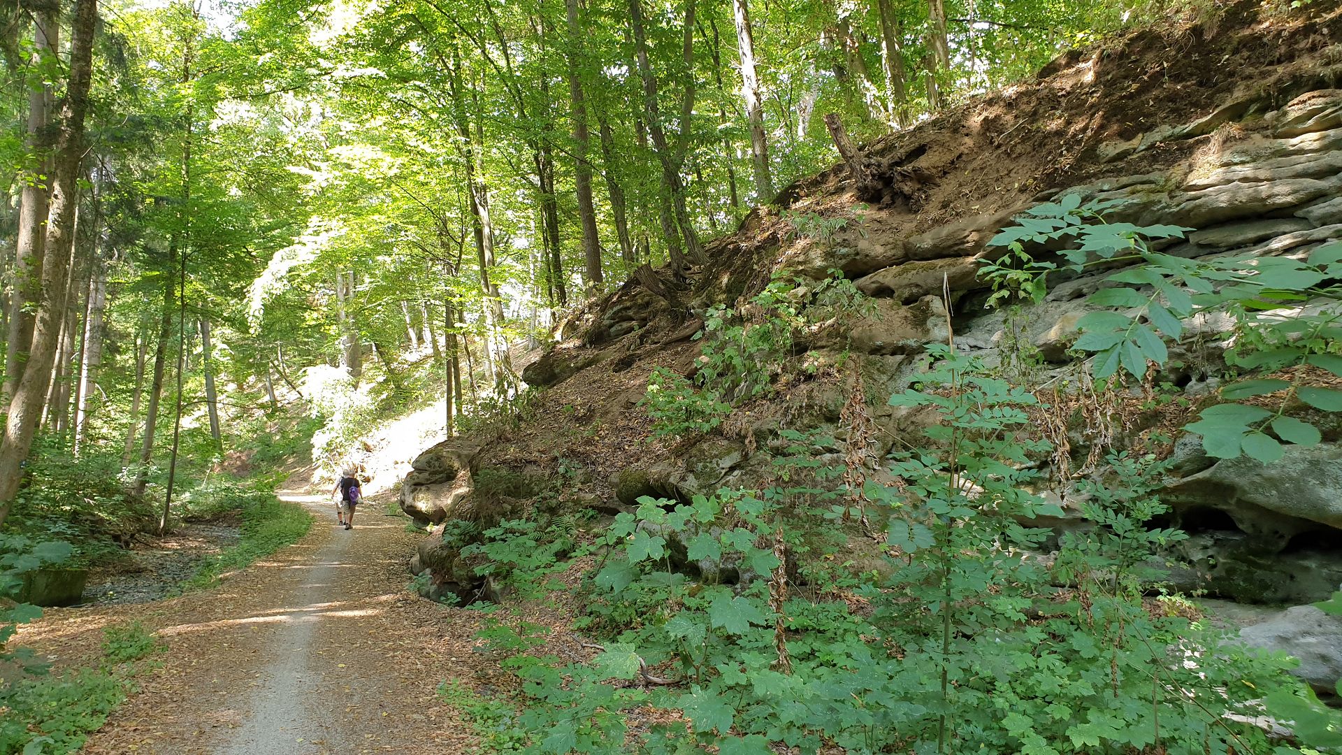 wieder zu verlassen. Wir nahmen also nach einem knappen Kilometer den kürzesten Weg in den kühlen Wald. Wegen einer Baustelle mussten wir noch einen kleinen Umweg durch Unterholz in kauf nehmen, bevor wir bei jetzt angenehmen Temperaturen am Fröschauer Weiher entlang liefen. Nach dem Überqueren der Straße am Ende der Weiher heißt es aufgepasst: Der Weg in den Wald auf der gegenüberliegenden Seite ist nur schwer zu finden. Und er führt - ohne besonderen Hinweis und auch schlecht zu erkennen - gleich rechts steil bergan. Oben, am Ende des Waldes, erfährt man dann durch ein Hinweisschild, dass das wirklich sehr schlecht gekennzeichnete rutschige Steilstück tatsächlich ein Wanderweg war! Wir überqueren ein (in der Hitze als sehr lang empfundenes) Brachstück und gelangen an dessen Ende in einen schönen Wald und nach einer Weile in eine "Kathedrale" aus jungen Buchen: schön anzusehen und schön kühl. Dann folgt noch ein kurzes Wegstück in der prallen Sonne, bevor wir uns im Gasthaus "Weißes Kreuz" im Schatten niederlassen. Hier werden hervorragend verpflegt. Nach einer entspannenden