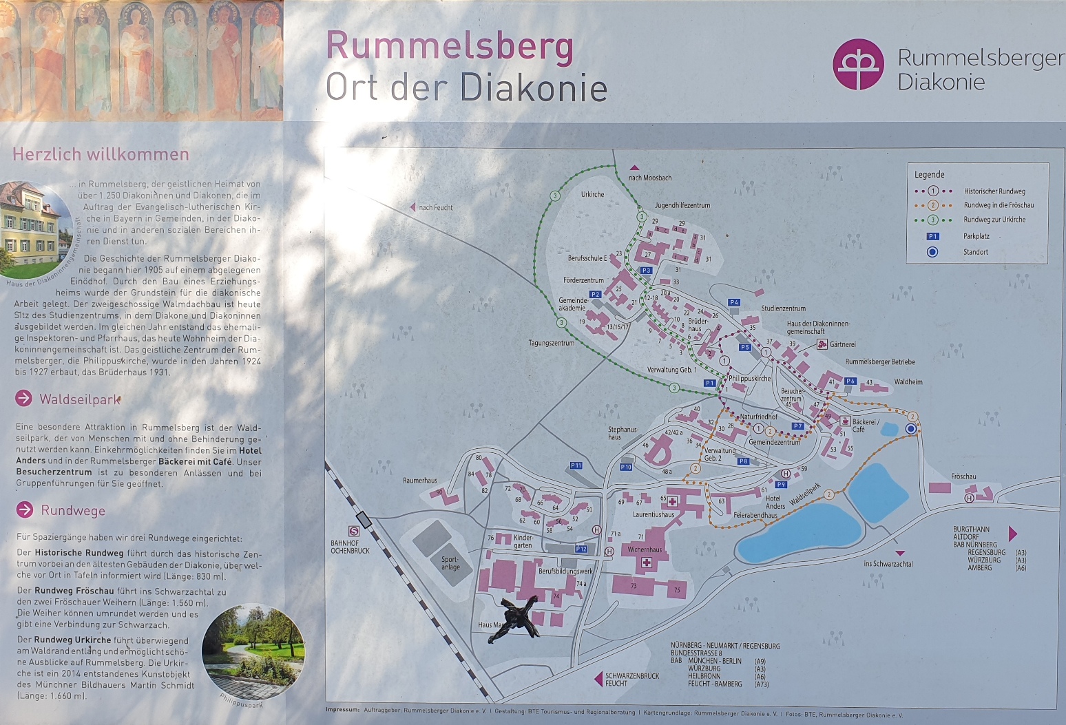 nach links ins Tannbachtal einzubiegen. Dieser Genussweg endet dann an der Teerstraße vor Rummelsberg (bei den Fröschauer Weihern). Wir gehen nach rechts, dem Jakobusweg folgend - und wieder heißt es aufpassen: Der Wanderweg verlässt die Teerstraße schon nach wenigen Metern wieder nach rechts. Nach einem etwas steileren Anstieg erreichen wir über eine Brücke das Rummelsberger Gelände am Museum/ Cafe. Die Hitze hat uns geschafft, Cafe und Restaurant sind geschlossen, also verschieben wir Besichtigungen, weitere Erkundungen, den Besuch der Kirche und deren Umgebung in die Zukunft. Wir erholen uns kurz auf einer schattigen Bank etwa 200 m vor dem Bahnhof, bevor es wieder Richtung Heimat geht. Fazit: schön und warm