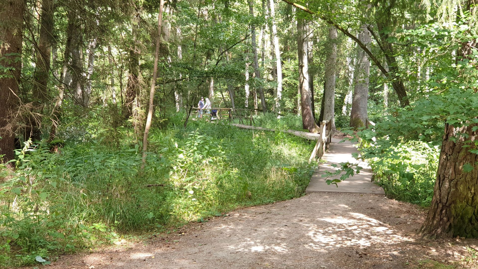 Moorbrücke: Etwa 1300 m hinter dem Holzweiher (ca. 400 m vor dem Valznerweiher) führt eine Holzbrücke durch das Feuchtgebiet des Hutgrabens. Ein Abstecher lohnt.