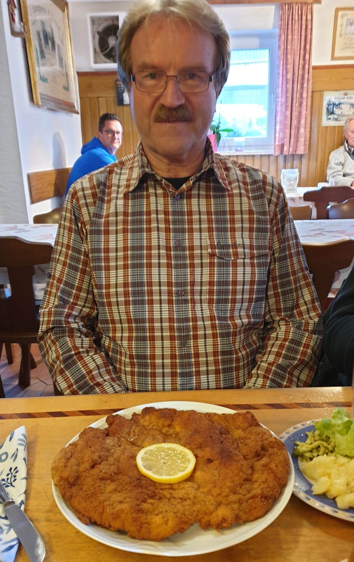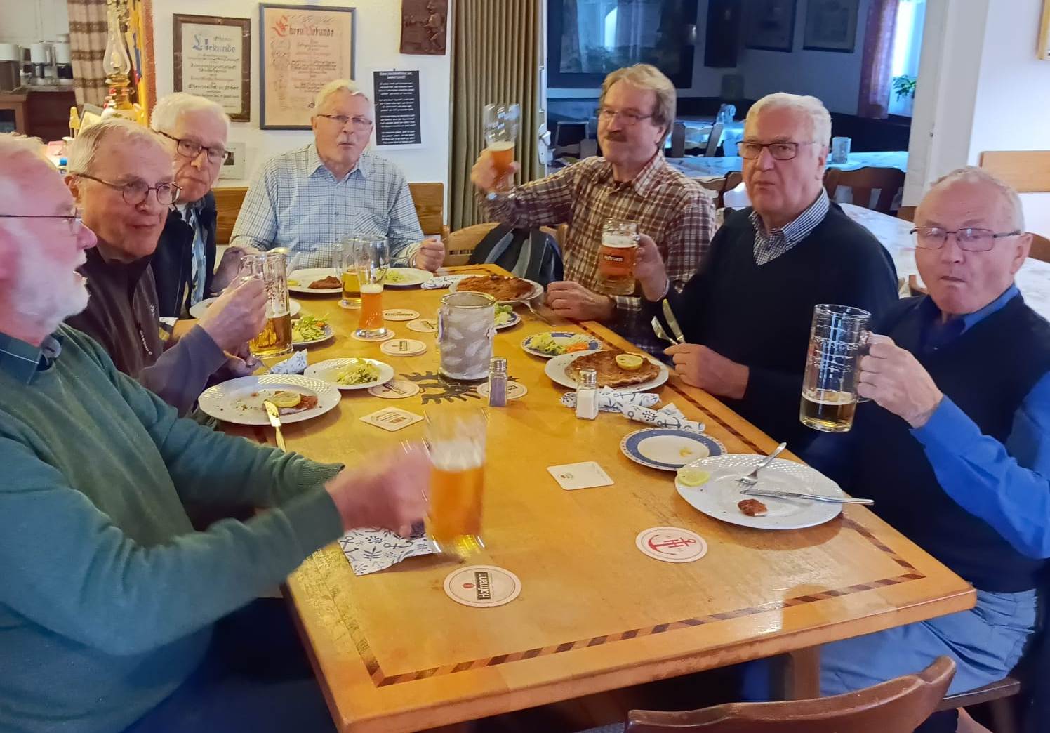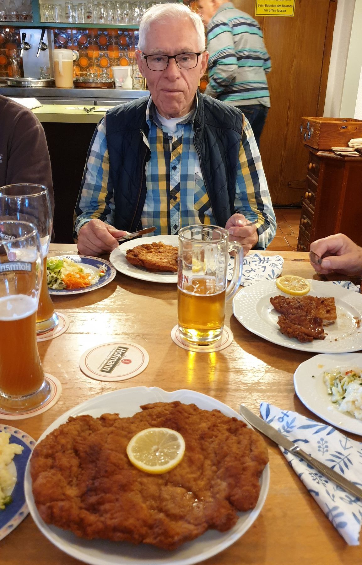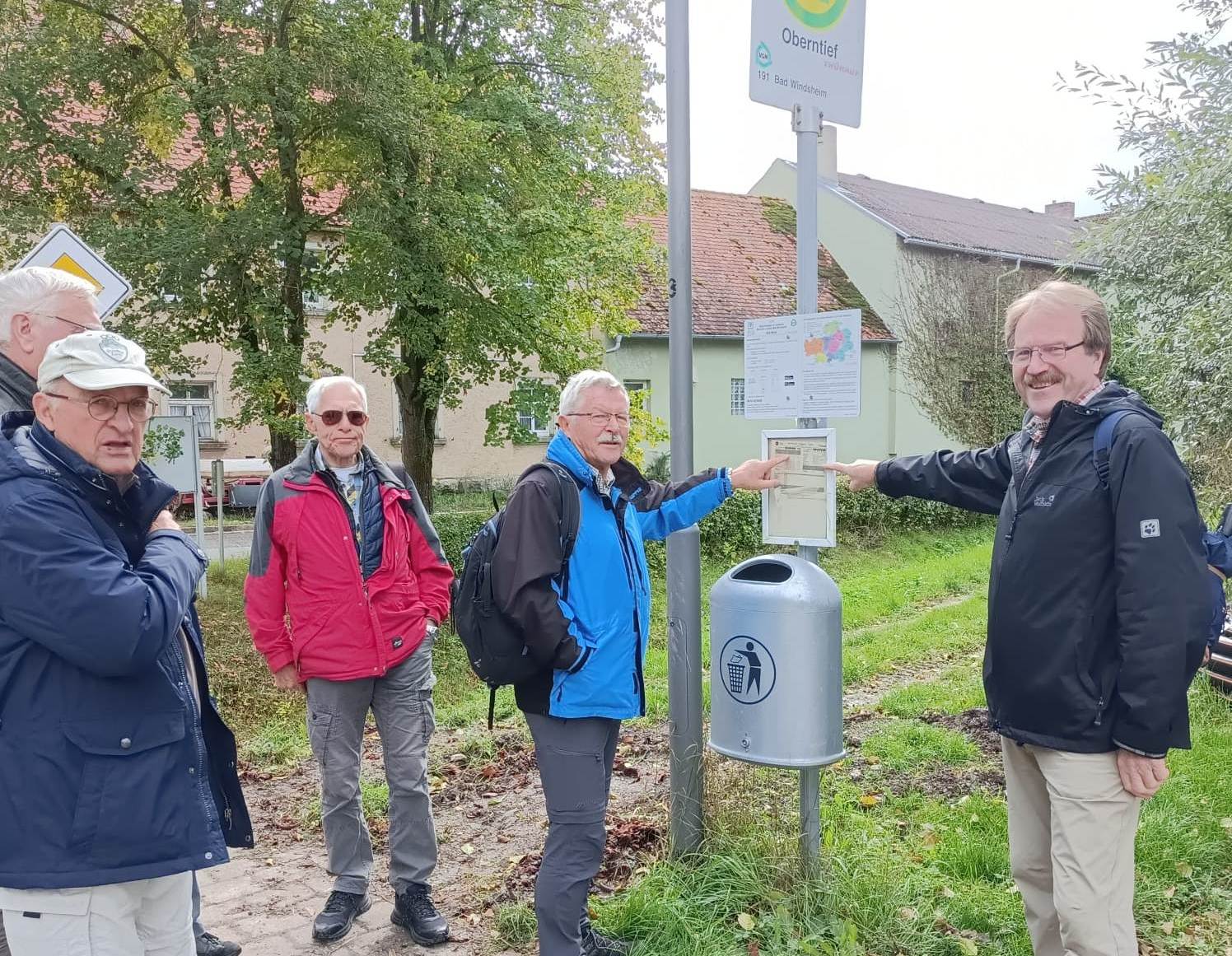 Hoffentlich ist es ihm dann nicht zuu trocken. Dort ging es dann am Waldrand etwas aufwärts (eine Abkürzung durch den Wald hat er jetzt verächtlich links liegen lassen) zu dem uns wohlbekannten Weg, besser Pfad, nach Oberntief. Insgesamt wirklich eine schöne Strecke! Wir waren vor der geplanten Ankunftszeit im Gasthaus, so dass wir genügend Zeit hatten unsere Schnitzelchen mit Genuss zu verzehren. Ohne Hast ging es dann zur Bushaltestelle .. aber dann: 13:19 sollte der Bus kommen, 13:24 wurden wir nervös, um 13:25 noch nervöser und um 13:26 begann Henry, akribisch jeden Buchstaben und jede Zahl an der Abfahrtstafel in alle möglichen Richtungen zu interpretieren. Doch es blieb dabei: die Planung stimmte. Um 13:29 rief Udo die am Fahrplan angezeigte Nr. des Busunternehmers an. Leider hatte die zuständige Bearbeiterin Pause, aber die Kollegin versprach, dass sie zurückruft, sobald sie zurückkehrt. Doch die Nervosität steigerte sich. Einige wollten schon zum Äußersten greifen und zurück laufen! Doch um 13:39 entdeckte Henry eine ebenfalls angezeigte Nr. eines Ruf-Taxis. Die automatische Ansage weissagte "in 7 Sekunden sind wir für sie da". Als die 7 Sekunden um 13:49 immer noch nicht um waren rief Udo noch einmal beim Busunternehmen an: die Mut machende Auskunft: "Ich kann sie zwar nicht hören, aber der Bus kommt gleich" - und aufgelegt. Und tatsächlich, gegen 13:53 war er da. Und er fuhr uns ohne Umwege über Haltestellen weiterer Ortschaften direkt nach Bad Windsheim. Um 13:59:34 kamen wir am Bahnhof an, der Zug stand da, wir hechteten hinein und er fuhr ab 🤒 Dann nur noch der übliche