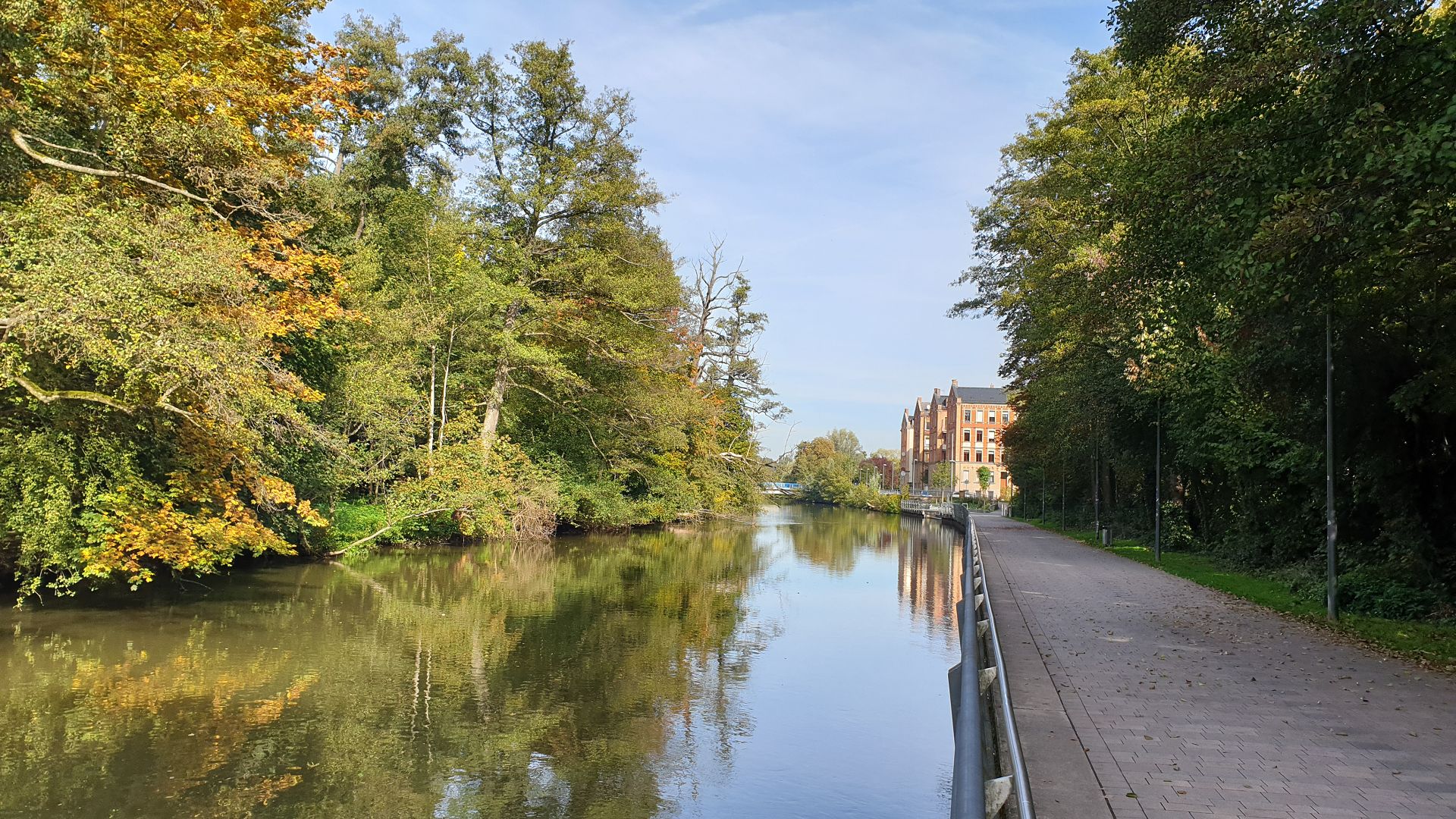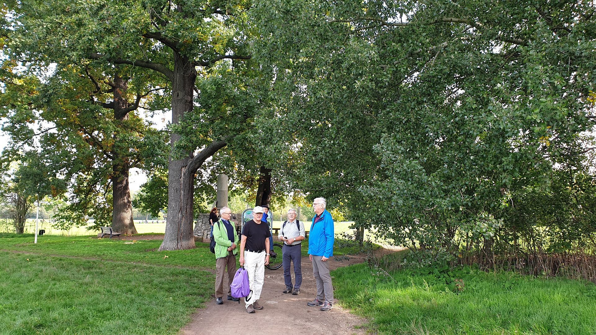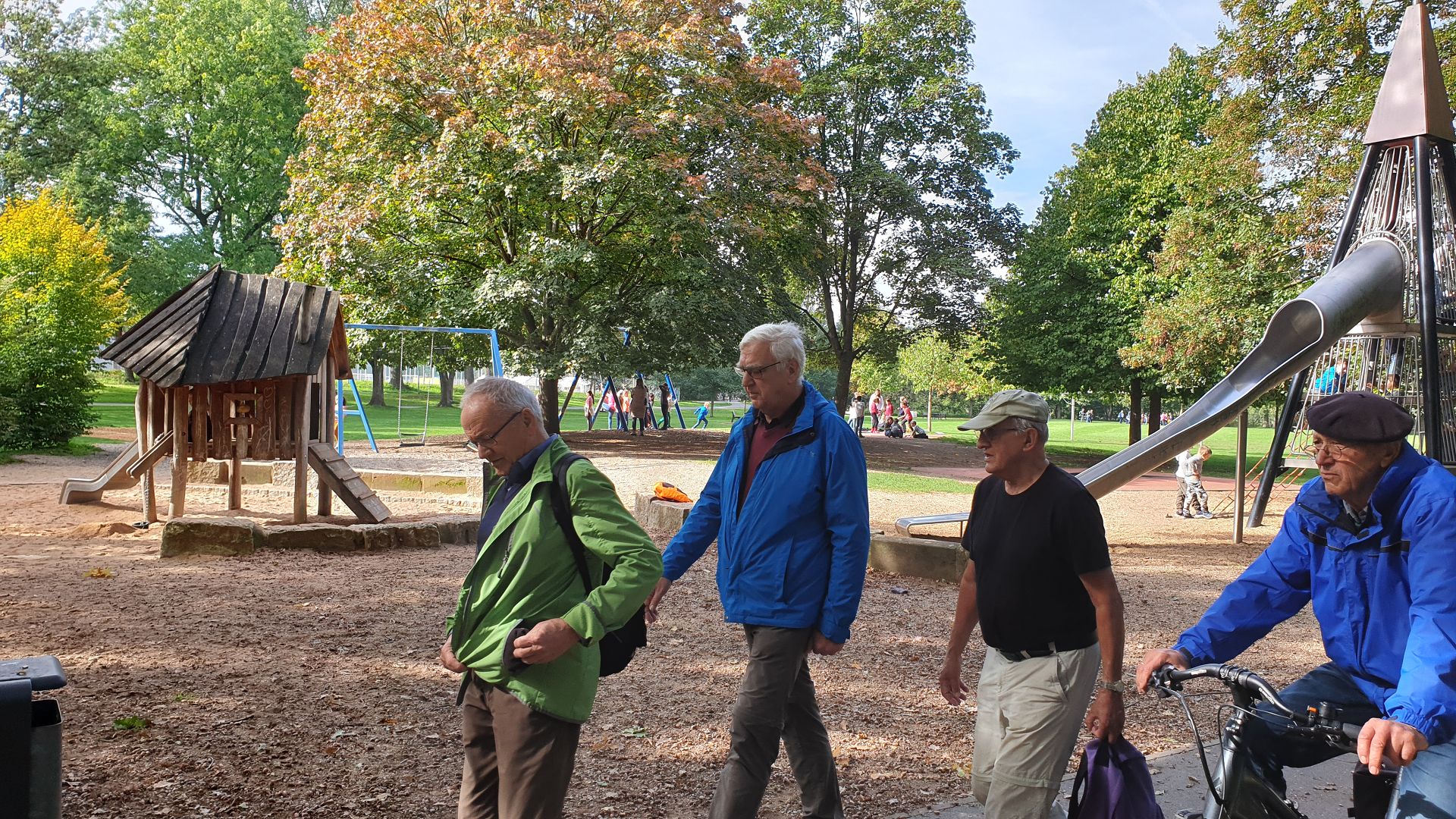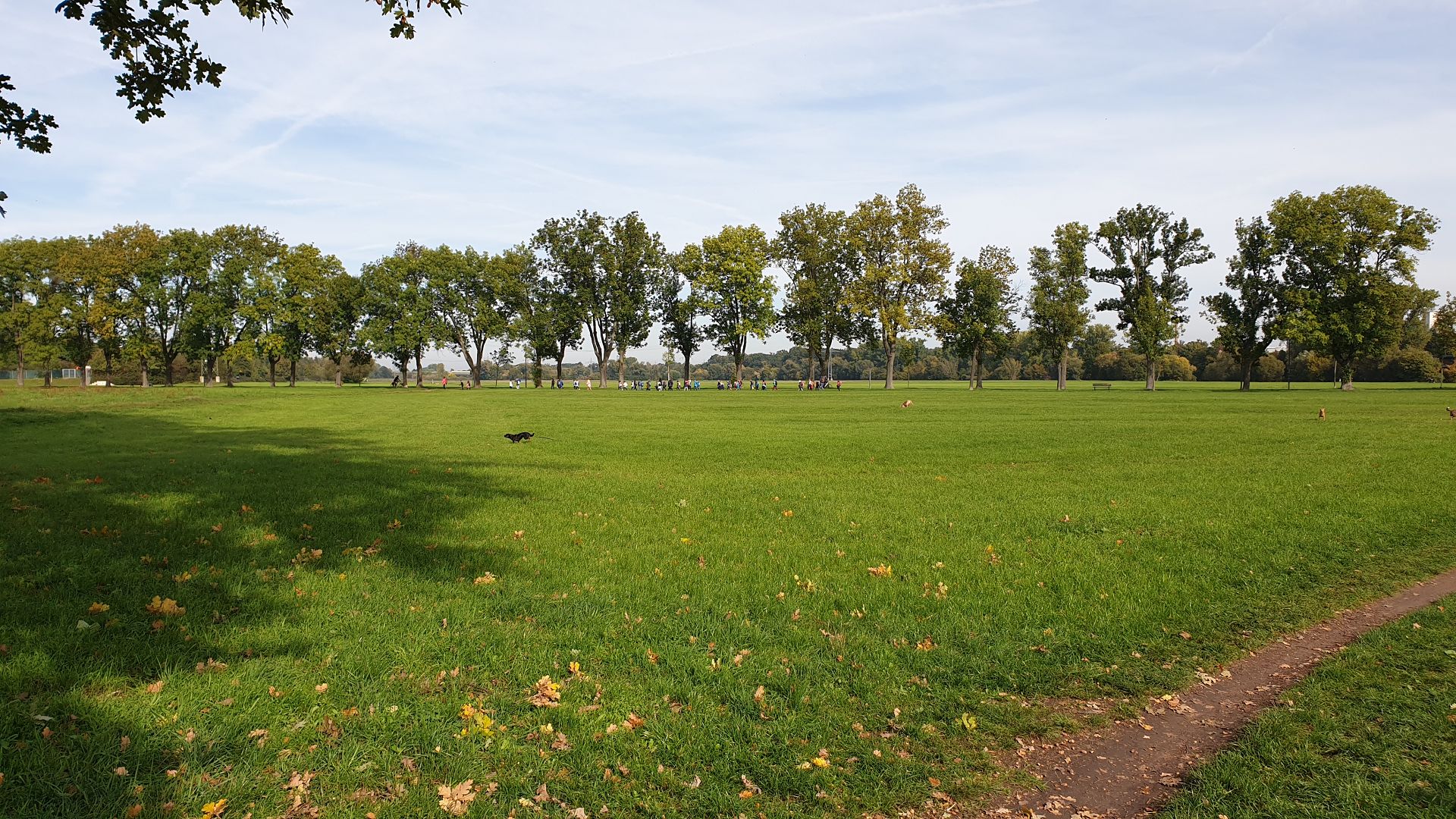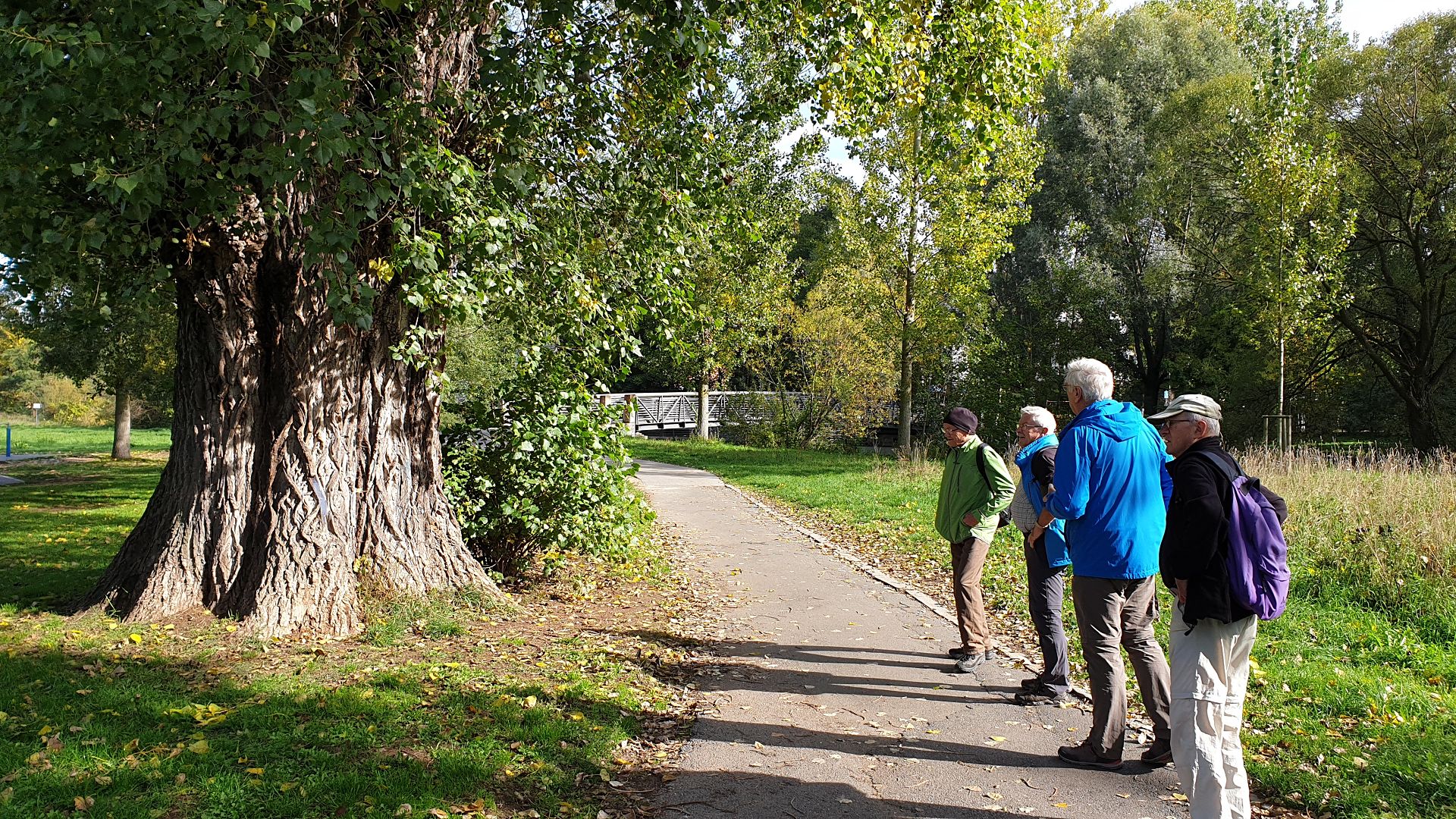 Stadtspaiergang in Fürth und Michaelis-Kirchweih Heute haben wir wieder einmal erfahren, warum die Bezeichnung Kleeblatt-Sadt nicht zu weit hergeholt ist. Es gibt (fast) unzählige Wege durch grüne Wiesen (mit tatsächlich unzähligen Kleeblättern) und Auen, von denen aus man in wenigen Minuten mitten in der Innenstadt ist. Und wie man Flussufer und Parks gestalten kann, abwechslungsreich mit gemütlichen Biergärten, Spielplätzen und reizvoller Wohnbebauung, davon kann sich so manche Stadt (vor allem die nächste nördlich gelegene) mehr als ein Scheibchen abschneiden! Und das gleiche gilt für die Kirchweih. Der von den Nachbarn lange belächelte Hinterhof hat sich nicht nur gemausert, er stellt die beiden Nachbarstädte in so mancher Beziehung mittlerweile eher in den Schatten. Und wenn der Glubb ned obachd gibd ... Die Idee zur heutigen Tour entstammt einem Vorschlag des VGN [Der erste Teil der Strecke und des Textes]. Die Wanderung beginnt in Dambach, in der Spitze des Dreiecks, das der Kanal mit der Rednitz dort bildet, wo er sie überquert. Sie führt durch den Rednitzgrund bis zum Zusammenfluss mit der Pegnitz und dann, vorbei am alten Friedhof, am Ufer der Pegnitz flussaufwärts zum und durch den Stadtpark, und von dort in die Innenstadt zur Michaelis-Kirchweich. (Einer kleinen Schleife durch den herbstlichen Stadtpark hat sich Willi, trotz flehentlicher Bitten von Achim, vehement widersetzt. Dank Willis kenntnisreicher Führung durch die Straßen, Gassen und Plätze mit den Buden und Fahrgeschäften, kamen wir aber trotzdem noch auf über 7 km - wobei unser Anspruch natürlich deutlich darüber liegt J).Zum Startpunkt fahren wir über den Fürther Hbf mit RB11 bis Dambach. Nach Obere Straße, Fuchsstraße, Lerchenstraße, Forsthaus- und Dianastraße führt ein Fuß- und Radweg geradewegs in die Rednitzauen, mit großen, efeuumrankten Bäumen. Am Ende des Waldes, vor dem Bahndamm, gehen wir nach rechts und überqueren den selbigen. Bei der Gabelung halten wir uns wieder rechts und überqueren gleich die Rednitz. Hinter der Brücke schwenken wir nach links, genießen die Uferpromenade (und laufen an den zahlreichen Informationstafeln, die von der der wechselhaften Geschichte dieses Stadtteils der Rednitz berichten, achtlos vorbei)! Wir folgen der Uferpromenade der Rednitz (die ja durch die Vereinigung der Fränkischen- mit der Schwäbischen Rezat bei Georgensgmünd entstanden ist), gehen vorbei an "interkulturellen Gärten" rechts des Weges und der Stadthalle. An deren Ende überqueren wir die Rednitz im Gewimmel der Würzburger-, König- Kapellen- und wieder Würzburger Straße, um über den Heckenweg wieder in den Wiesengrund, Richtung Scherbsgraben, zu gelangen. Gleich nach dem Graben geht es nach rechts auf einem grasigen Lehrpfad zu den Eichen an der Kapellenruh. Hier soll Karl der Große Mitte des 8. Jh. die Martinskapelle errichten lassen haben. Über den Käppnersteg gehen wir auf der anderen Rednitzseite weiter flussabwärts und erreichen nach rund 200 m den Zusammenfluss mit der aus Nürnberg her kommenden Pegnitz. (Als Regnitz setzt der Fluss seine noch rund 60 km lange Reise fort, bis er bei Bamberg in den Main mündet). Hier, auf den Spielplätzen und den Wiesen, ist mächtig was los. Offensichtlich ist Schul-Wandertag und Lehrer und Schüler freuen sich über das schöne Wetter. Wir gehen nun knapp 200 m an
