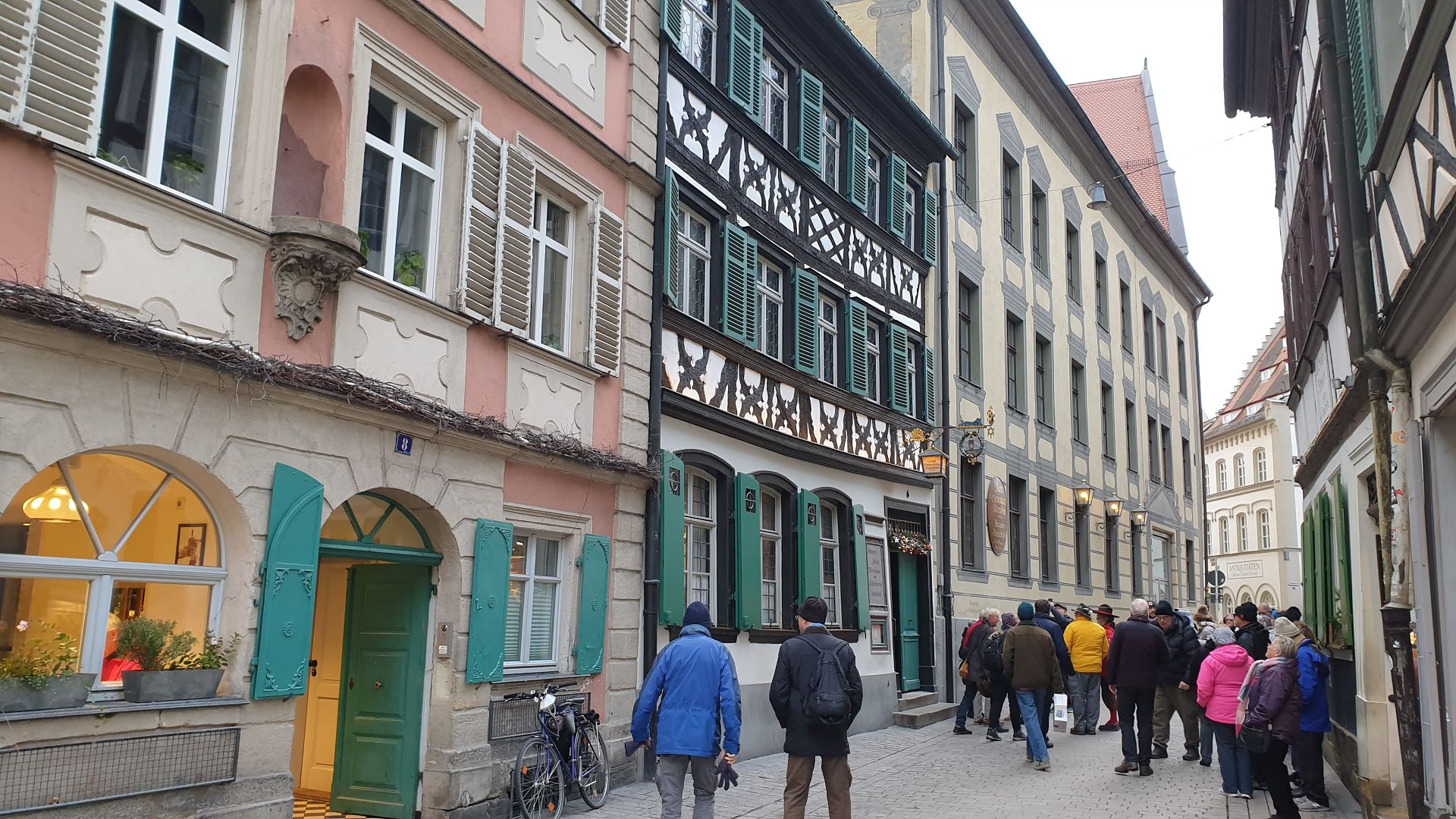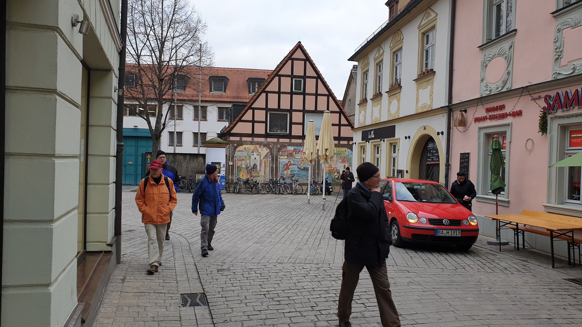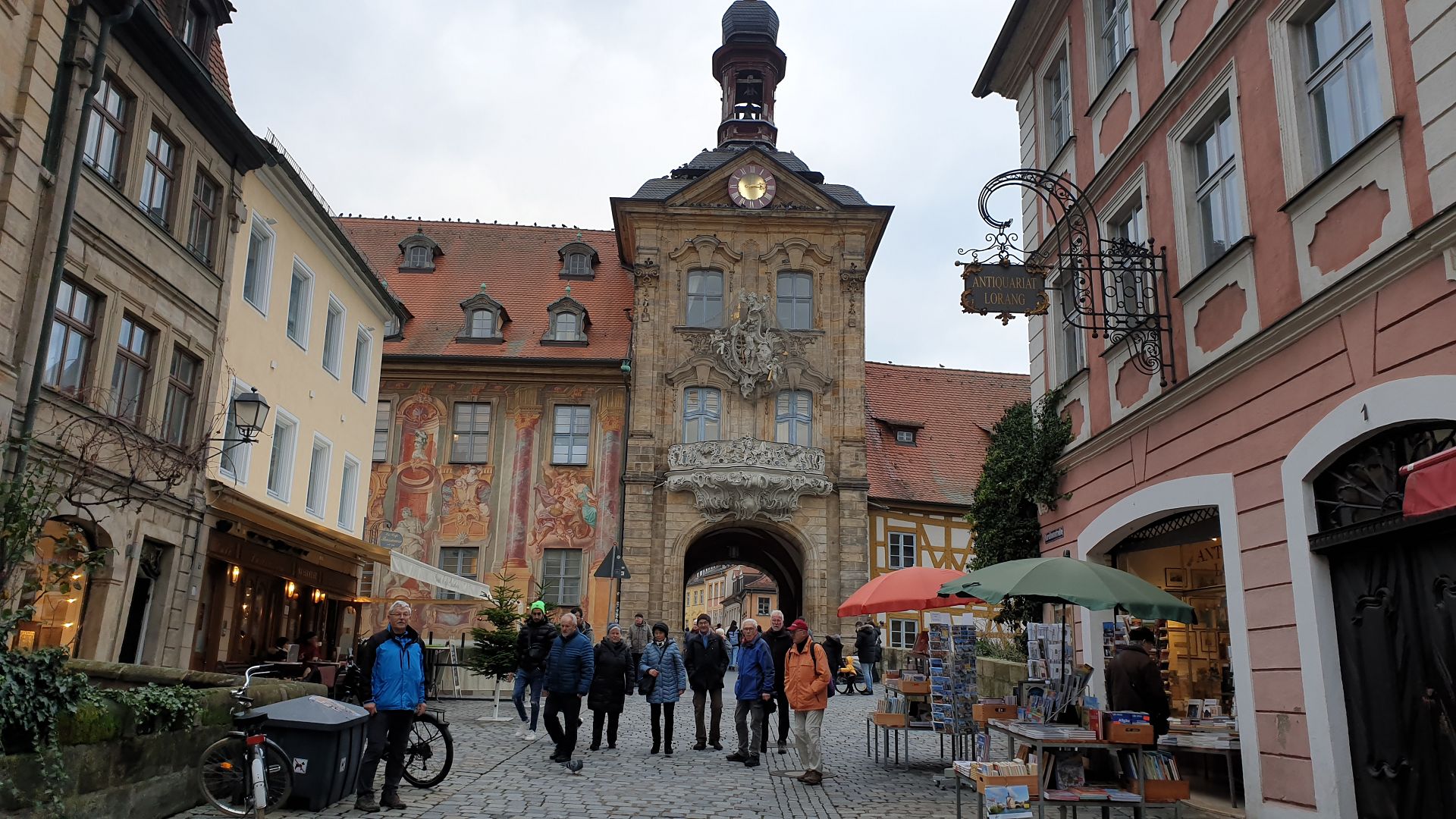 zu den deutschen Kaiserdomen Unsere Tour begann gleich mit einem Verhauer! Henry hat wohl schon vom Mittagsschlaf geträumt und Udo war mit einer neuen App beschäftigt. So liefen wir an der Königstraße vorbei und merkten erst an der Regnitz, dass aus den 700 Metern vom Bahnhof bis zur Brauerei Spezial schon 2 1/2 km geworden sind. Also drehten wir eine schnelle Ehrenrunde und kamen gerade noch rechtzeitig, bevor unsere reservierten Plätze anderweitig vergeben waren, an. Man muss nämlich wissen: während Gaststätten andernorts überall schließen, sie die in Bamberg schon Wochen im voraus ausgebucht! Nach dem (guten) Mittagsmahl und einem (oder zwei - guten) Rauchbier(en) liefen wir gemütlich unsere Strecke, freuten uns über die liebevoll hergerichteten Krippen und beendeten den Wandertag mit Kaffee und Kuchen in einem kleinen Cafe an der Oberen Brücke. Unsere Route mit Hinweisen: (mit Passwort) in der Socki-Cloud |