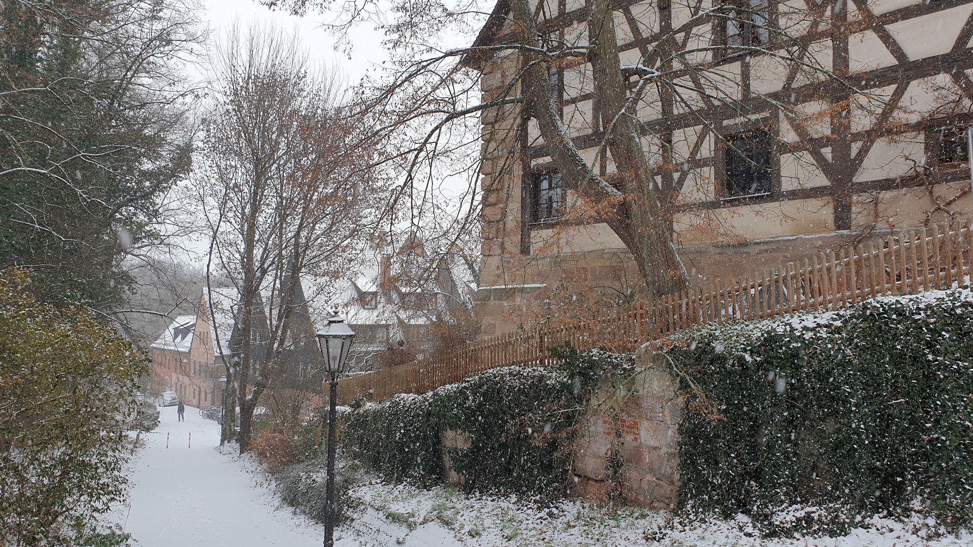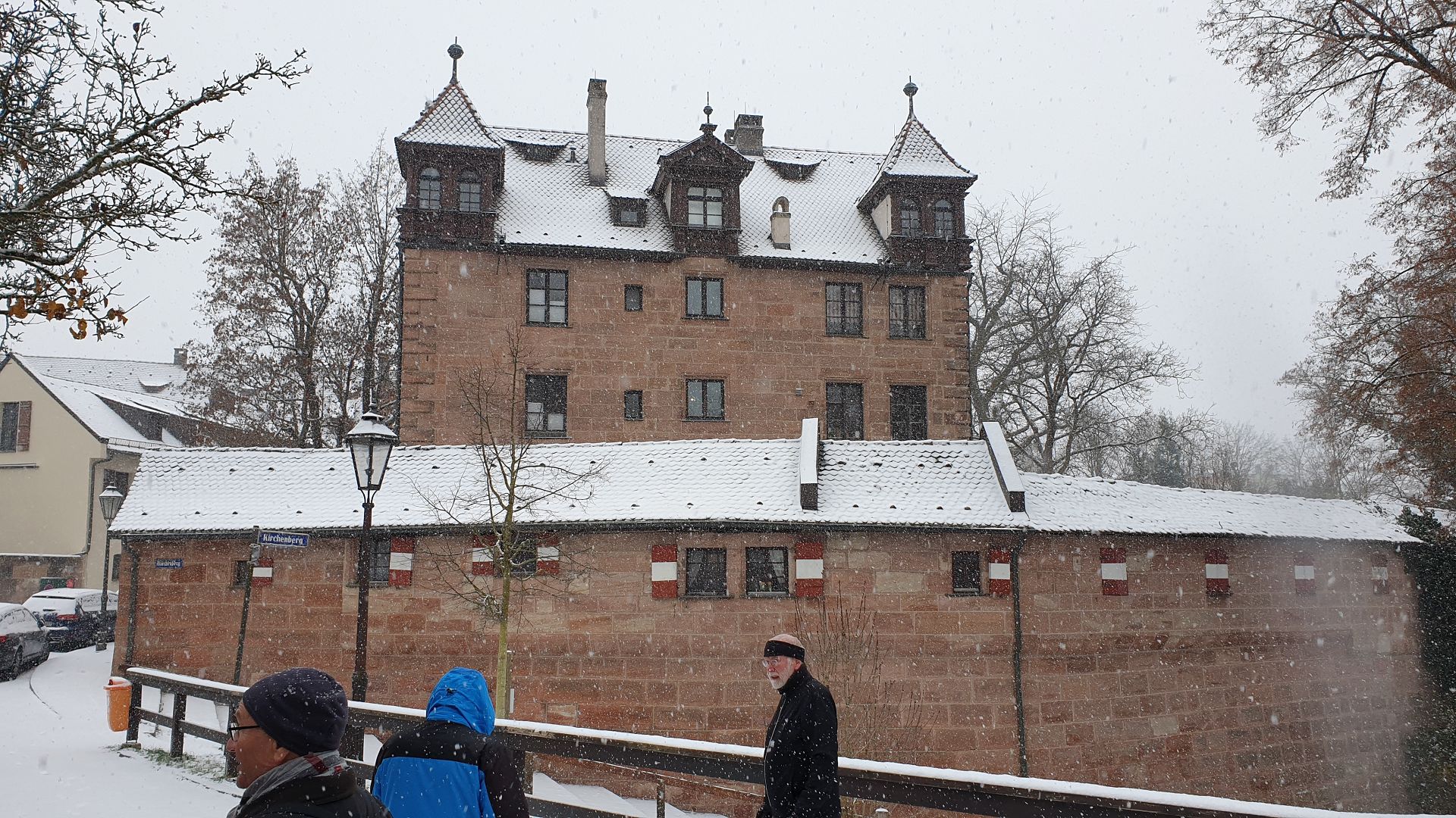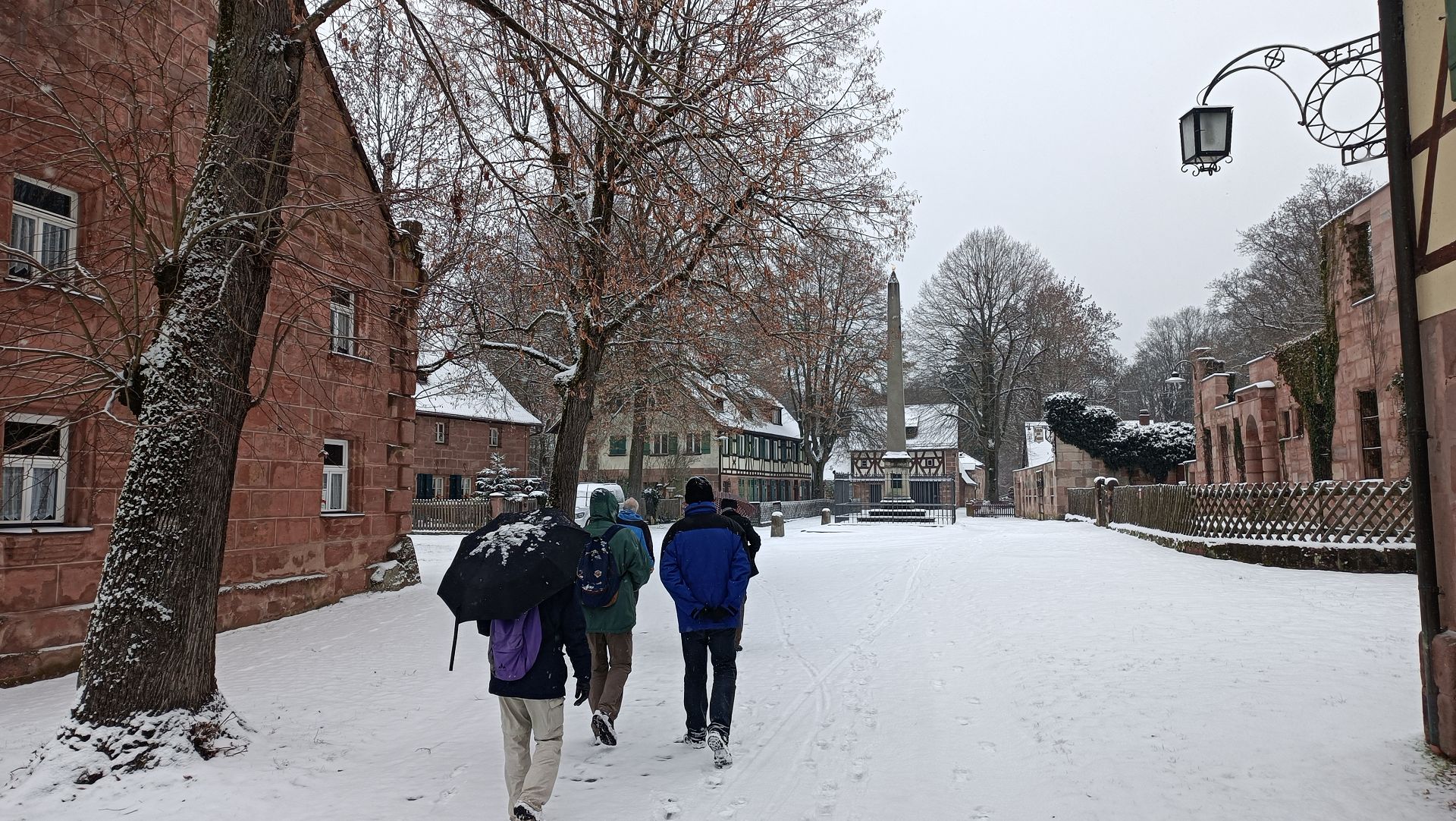 In einem der vielen grünen Vorgärten Nürnbergs besuchen wir König Artur - Gott hab ihn selig Alles andere als grün zeigten sich die Pegnitzauen. Im Gegenteil: dichte Schneeflocken hatten die Landschaft weiß gefärbt und die Wege und Pfade unter einer leichten Schneedecke versteckt. Auch die DB war uns nicht grün. Die geplante S-Bahn wurde ersatzlos gestrichen und diejenige, die (planmäßig) 20 Minuten später kam, endete außerplanmäßig in Nürnberg anstelle in Lauf. Grund: ein Unfall "hinter" Nürnberg. Wie sich hinterher herausstellte, ereignete sich das Unglück bei Ottensoos, also weit hinter Lauf; warum also musste die Fahrt in Nürnberg enden? (Ob "sich" die DB mit ihren jetzigen Personal jemals in den Griff bekommt? Vor 30 Jahren hatte ich Chinesen zu Besuch. Auf meine Frage, was sie am meisten in D beeindruckt hat, antworteten sie: dass, wenn am Bahnsteig 8:52 steht, der Zug auch um 8:52 fährt. Das sei in China ganz anders. Vor einigen Jahren war ich in China: jetzt ist es genau umgekehrt. Es geht also; obwohl dort in den Städten und Vororten deutlich mehr "Betrieb" ist.) Wir mussten also umplanen, starteten am Ziel in Erlenstegen und liefen rückwärts J nach Schwaig. Da dadurch das für die Mittagsrast eingeplante Gasthaus ziemlich am Anfang der Strecke lag, sind wir eine kleine Schleife gelaufen und haben als erstes unserem Artur auf dem Mögeldorfer Friedhof einen Besuch abgestattet. Nach einer kurzen Besichtigung des Friedhofes und der schönen alten Kirche "St. Nikolaus und St. Ulrich" freuten wir uns auf das Chinesische Restaurant Bamboo, gleich in der Nähe. Pekingsuppe, Ente gebacken, Schwein Süß-Sau und Rind geschmort kamen genauso schnell und pünktlich wie die chinesischen Züge und mundeten vorzüglich (Es gibt übrigens an Wochentagen ein preiswertes Mittagsmenü, das nicht auf der Speisekarte im Internet erwähnt ist). Auf das gebackene Eis verzichteten wir zugunsten einer Schokoladen-Banane, die sich, zumindest Udo, später auf dem Christkindlesmarkt gönnte. Dann ging es weiter auf der rechten Seite links der Pegnitz 🤒, vorbei am alten, dem Verfall preisgegebenen? Schloss Oberbürg und einem die Wasserkraft mangelhaft nutzenden Kraftwerkchen durch die Siedlung "Hammer", mit schönen, interessanten alten Bauwerken. Hinter der Autobahn, in Malmsbach, hat Henry zugunsten seines Knies auf einen Schlenker weg vom Asphalt, noch einmal runter in die Pegnitzauen, verzichtet. So waren wir schnell am S-Bahnhof Schwaig und mussten nicht lange auf die S1 warten. Henry und Karpfen hatten einen Termin und fuhren direkt nach Erlangen, zu viert nahmen wir die U-Bahn zur Haltestelle Wöhrder Wiese. Von dort liefen wir über die Insel Schütt, wieder schön an der Pegnitz entlang, zum Christkindlesmarkt am Hauptmarkt. Einer verweigerte den Besuch der Frauenkirche, zu dritt drehten wir beide Ringe am Schönen Brunnen (und wünschten uns ...) und alle Vier gönnten wir uns einen Glühwein. Mit SchokoladenWeintrauben und gebrannten Mandeln ging es dann durch mittlerweile halbdunkle, sparsam aber schön beleuchtete Straßen zum Hauptbahnhof. |