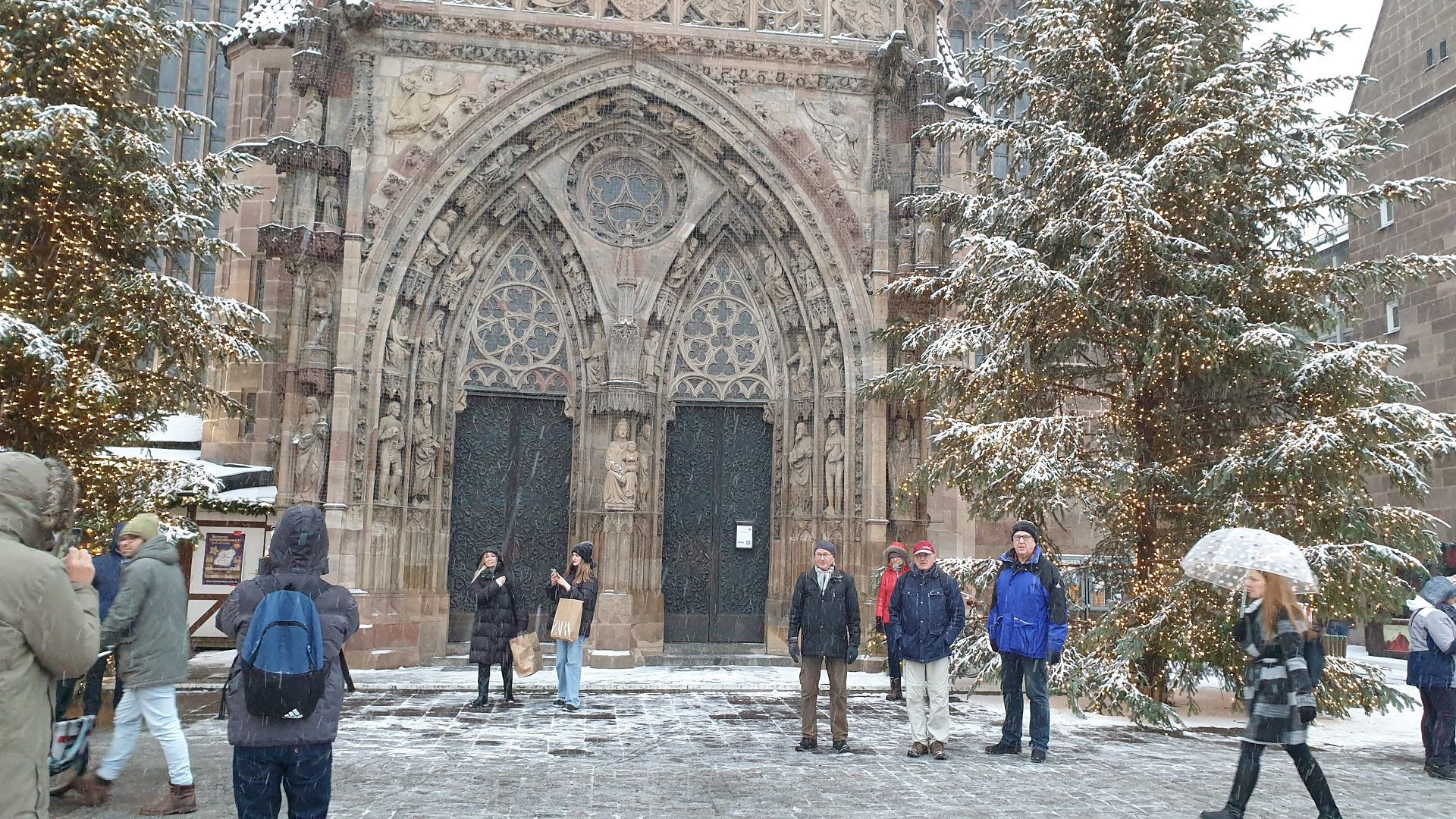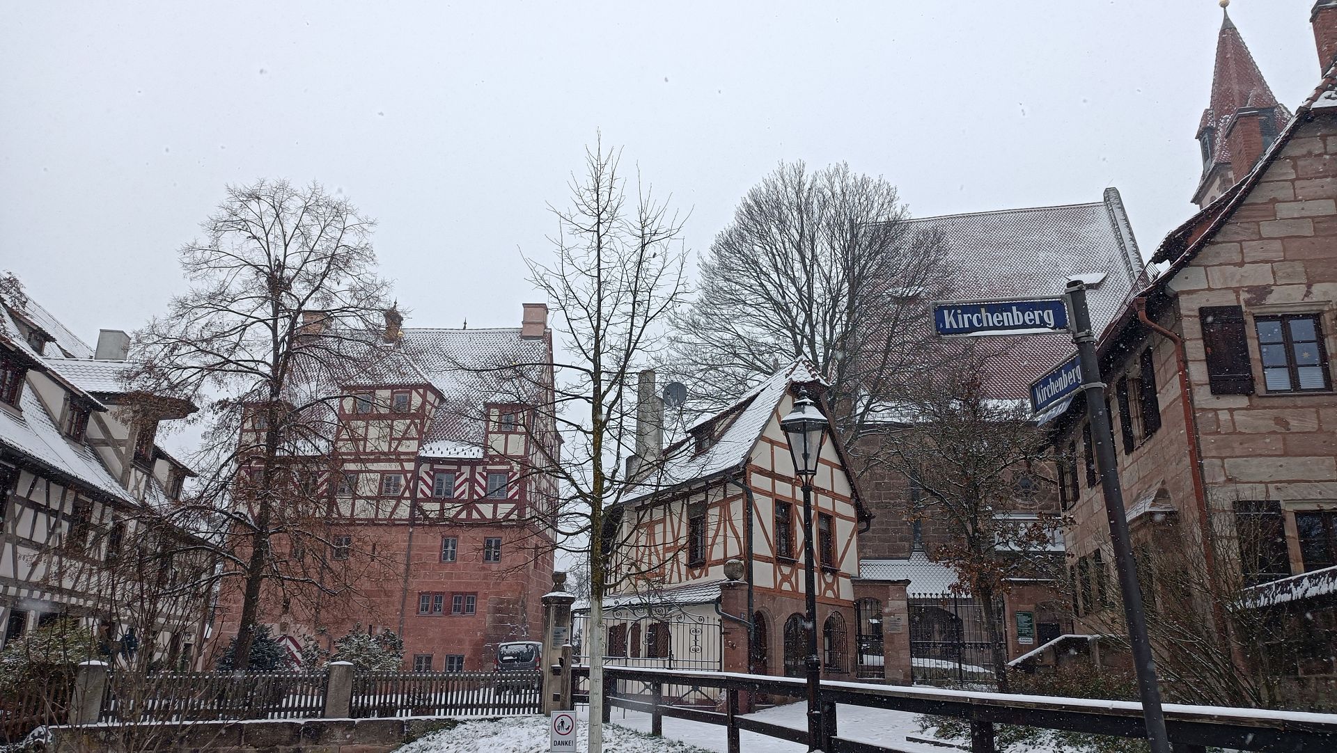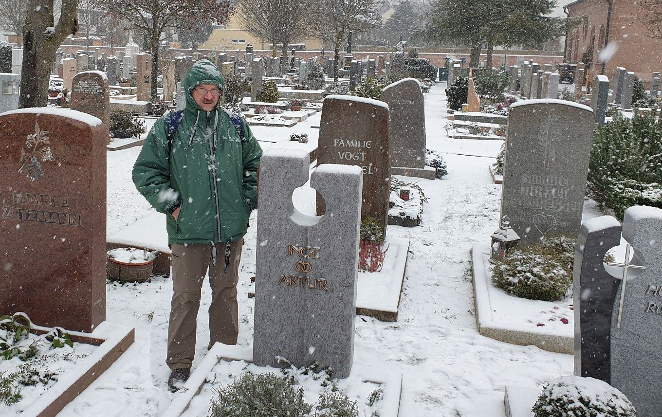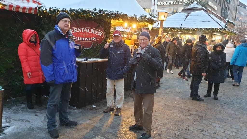 In einem der vielen grünen Vorgärten Nürnbergs besuchen wir König Artur - Gott hab ihn selig Alles andere als grün zeigten sich die Pegnitzauen. Im Gegenteil: dichte Schneeflocken hatten die Landschaft weiß gefärbt und die Wege und Pfade unter einer leichten Schneedecke versteckt. Auch die DB war uns nicht grün. Die geplante S-Bahn wurde ersatzlos gestrichen und diejenige, die (planmäßig) 20 Minuten später kam, endete außerplanmäßig in Nürnberg anstelle in Lauf. Grund: ein Unfall "hinter" Nürnberg. Wie sich hinterher herausstellte, ereignete sich das Unglück bei Ottensoos, also weit hinter Lauf; warum also musste die Fahrt in Nürnberg enden? (Ob "sich" die DB mit ihren jetzigen Personal jemals in den Griff bekommt? Vor 30 Jahren hatte ich Chinesen zu Besuch. Auf meine Frage, was sie am meisten in D beeindruckt hat, antworteten sie: dass, wenn am Bahnsteig 8:52 steht, der Zug auch um 8:52 fährt. Das sei in China ganz anders. Vor einigen Jahren war ich in China: jetzt ist es genau umgekehrt. Es geht also; obwohl dort in den Städten und Vororten deutlich mehr "Betrieb" ist.) Wir mussten also umplanen, starteten am Ziel in Erlenstegen und liefen rückwärts J nach Schwaig. Da dadurch das für die Mittagsrast eingeplante Gasthaus ziemlich am Anfang der Strecke lag, sind wir eine kleine Schleife gelaufen und haben als erstes unserem Artur auf dem Mögeldorfer Friedhof einen Besuch abgestattet. Nach einer kurzen Besichtigung des Friedhofes und der schönen alten Kirche "St. Nikolaus und St. Ulrich" freuten wir uns auf das Chinesische Restaurant Bamboo, gleich in der Nähe. Pekingsuppe, Ente gebacken, Schwein Süß-Sau und Rind geschmort kamen genauso schnell und pünktlich wie die chinesischen Züge und mundeten vorzüglich (Es gibt übrigens an Wochentagen ein preiswertes Mittagsmenü, das nicht auf der Speisekarte im Internet erwähnt ist). Auf das gebackene Eis verzichteten wir zugunsten einer Schokoladen-Banane, die sich, zumindest Udo, später auf dem Christkindlesmarkt gönnte. Dann ging es weiter auf der rechten Seite links der Pegnitz 🤒, vorbei am alten, dem Verfall preisgegebenen? Schloss Oberbürg und einem die Wasserkraft mangelhaft nutzenden Kraftwerkchen durch die Siedlung "Hammer", mit schönen, interessanten alten Bauwerken. Hinter der Autobahn, in Malmsbach, hat Henry zugunsten seines Knies auf einen Schlenker weg vom Asphalt, noch einmal runter in die Pegnitzauen, verzichtet. So waren wir schnell am S-Bahnhof Schwaig und mussten nicht lange auf die S1 warten. Henry und Karpfen hatten einen Termin und fuhren direkt nach Erlangen, zu viert nahmen wir die U-Bahn zur Haltestelle Wöhrder Wiese. Von dort liefen wir über die Insel Schütt, wieder schön an der Pegnitz entlang, zum Christkindlesmarkt am Hauptmarkt. Einer verweigerte den Besuch der Frauenkirche, zu dritt drehten wir beide Ringe am Schönen Brunnen (und wünschten uns ...) und alle Vier gönnten wir uns einen Glühwein. Mit SchokoladenWeintrauben und gebrannten Mandeln ging es dann durch mittlerweile halbdunkle, sparsam aber schön beleuchtete Straßen zum Hauptbahnhof. |