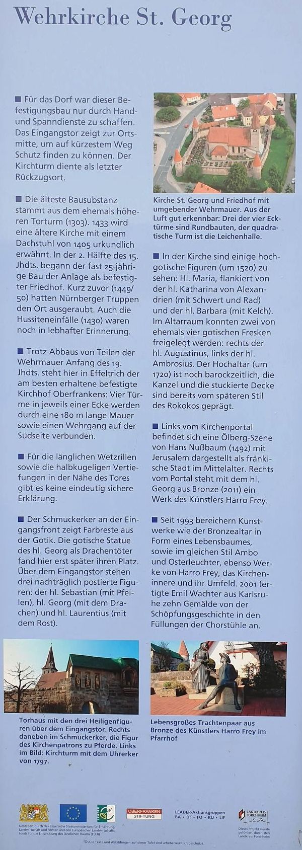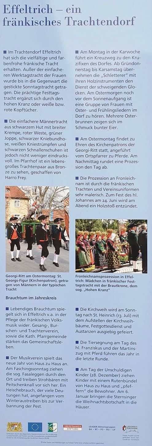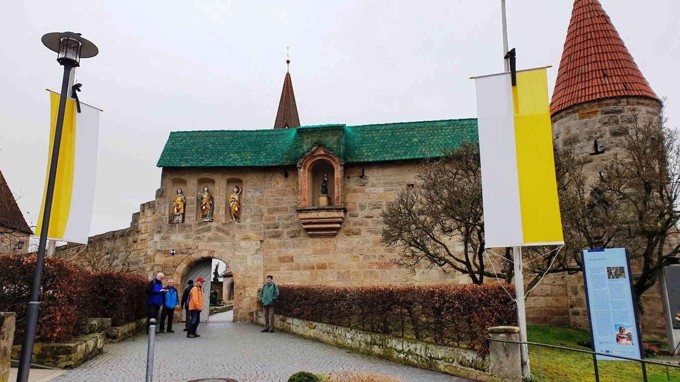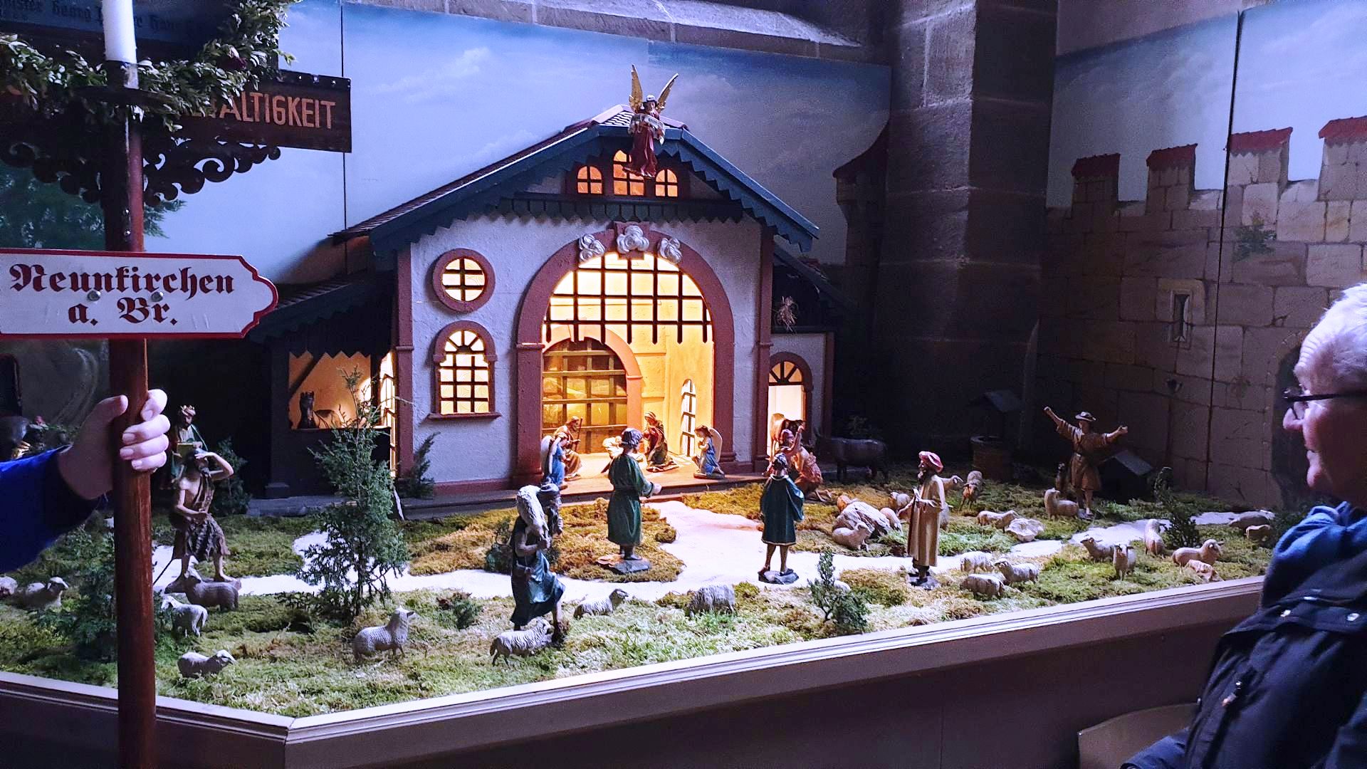 Krippenwanderung ab Langensendelbach, Einkehr in Effeltrich, über Hetzles nach Neunkirchen am Brand Auch wenn in diesem Jahr der Winter auf sich warten lässt, wollten wir unsere jährliche Krippenwanderung in die nähere Fränkische nicht ausfallen lassen - scho zwengs der Bohnakern in Effeltrich 😉. Also charterten wir den 208er und starteten in Langensendelbach. Hier wussten wir ja schon aus den Vorjahren eine schöne Krippe in einer schönen Kirche.Auch hier wurde, wir in allen folgenden Gotteshäusern, an "unseren" Papst, den kürzlich verstorbenen Benedikt XVI, erinnert. Auch wir bedauerten seinen frühen Abschied - schon aus seinem Amt. War er doch einer, der zu seinem Glauben auch stand, wo andere sich des Kreuzes entledigten und der auch die Missionierungsverpflichtung, die so mancher Würdenträger vergessen haben mag, ernst nahm. Denn was soll aus den christlichen Werten, die das Abendland in 2000 Jahren geprägt haben und die die demokratischen Länder zu dem gemacht haben was sie heute sind, werden, wenn selbst die Würdenträger, die verpflichtet sind die Lehre zu verbreiten, die Quelle der sie entstammt, verleugnen, und stattdessen Religionen goutieren, deren Gebote im Widerspruch zu unseren Werten, im Widerspruch zu unserem Grundgesetz stehen! Immer wieder sehenswert auch die ganze Anlage der Wehrkirche in Effeltrich und die Krippe mit St. Martin auf seinem Pferd, neben der tausendjährigen (Tanz-) Linde (mehr dazu auf den Tafeln unten bei den Bildern). Eine Empfehlung ist das Gasthaus zur Linde, in dem der Preisauftrieb noch nicht in dem Maße eingesetzt hat wie anderswo - das sollte man durch viele Besuche honorieren (damit das auch so bleibt). Eine weitere Spezialität neben den Bohnenkernen (mit Rauchfleisch) ist übrigens der saure Karpfen (mir weißer Soße). Wohlgenährt ging es nun nach Hetzles. Vorbei an der "Victor-von-Scheffel Gedenkstelle" mit der Erinnerung an den schönen Text des Frankenliedes: "Wohlauf die Luft geht frisch und rein", vorbei am Kriegerdenkmal, den Tafeln mit den Entfernungsangaben zu markanten Orten auf unserem Globus, zur "Flurkapelle der Achtsamkeit", wo wir eine kurze Pause einlegten und dann vorbei an der Gedenkstelle am Unglücksort des 3-jährigen "lieben Kindes Michael". In Hetzles beeindruckte als erstes das schöne Taubenhaus und auch die Kirche ist, besonders zur "Krippenzeit", immer einen Besuch wert (und wie man bei den Bildern sieht, zog es nicht nur uns dort hin). Auch in das Käppele in Baad warfen wir einen Blick - allerdings nicht der Udo, der war nämlich auf der vergeblichen Suche nach der anderen Agnes Bernauer, von der er sich in Neunkirchen ein Stück Torte erhofft hatte. In Neunkirchen am Brand, wo wir schon vor der Kirche von den hölzernen Schatten der heiligen 3 Könige begrüßt wurden, erreichten wir unser letztes Wanderziel: auch die Krippe in der immer schön goldglänzenden Kirche ist sehenswert. (Hier, in 9kirchen und Umgebung, kann man übrigens an bestimmten Tagen eine eigene Tour zu mehr als 30 Krippen in Privathäusern und Kirchen unternehmen). Nachdem sich die Mehrheit