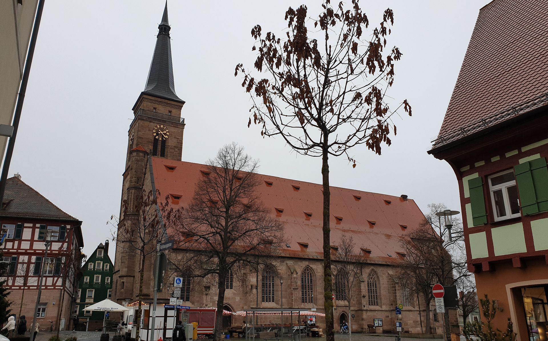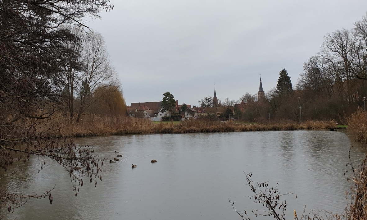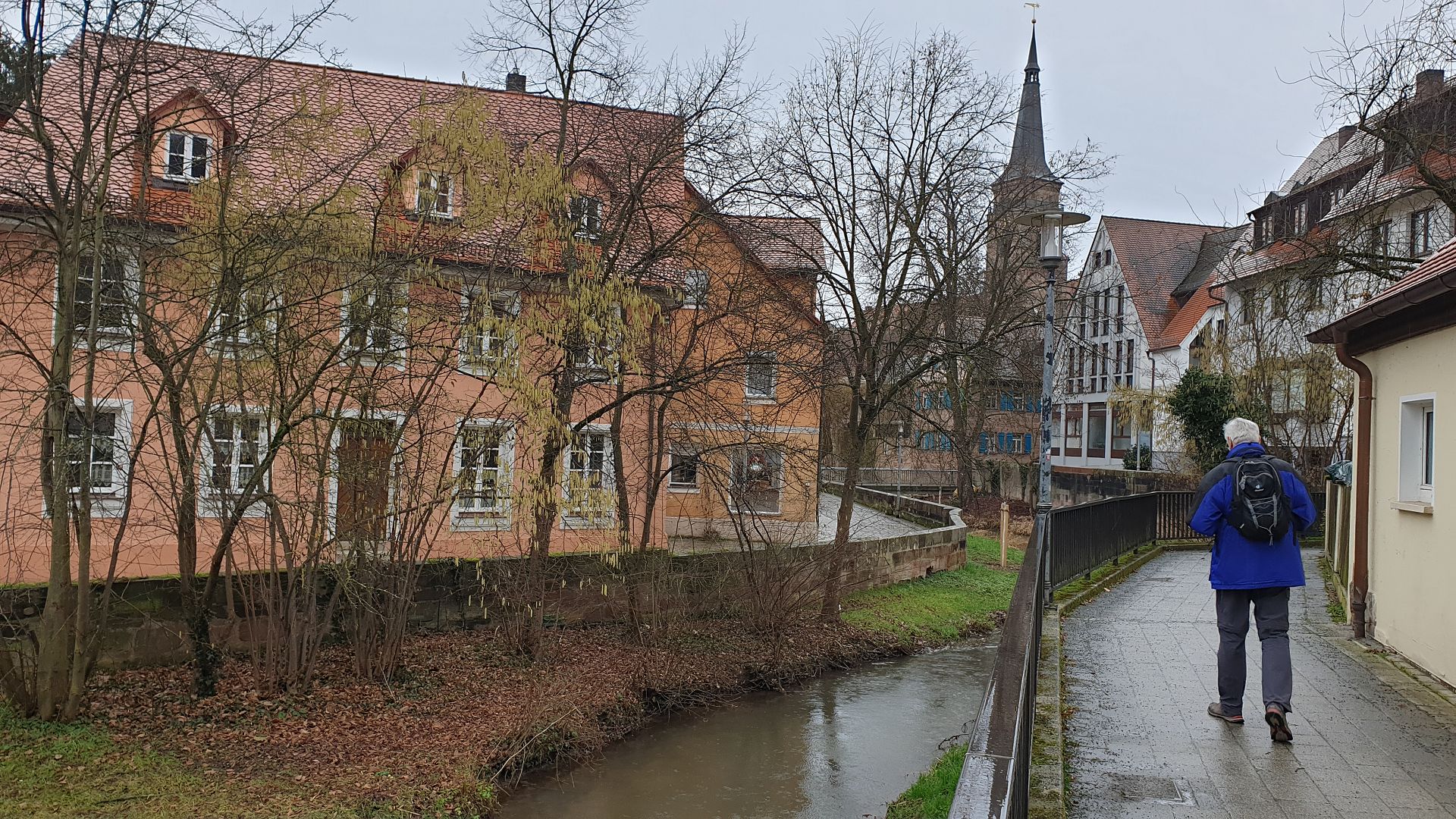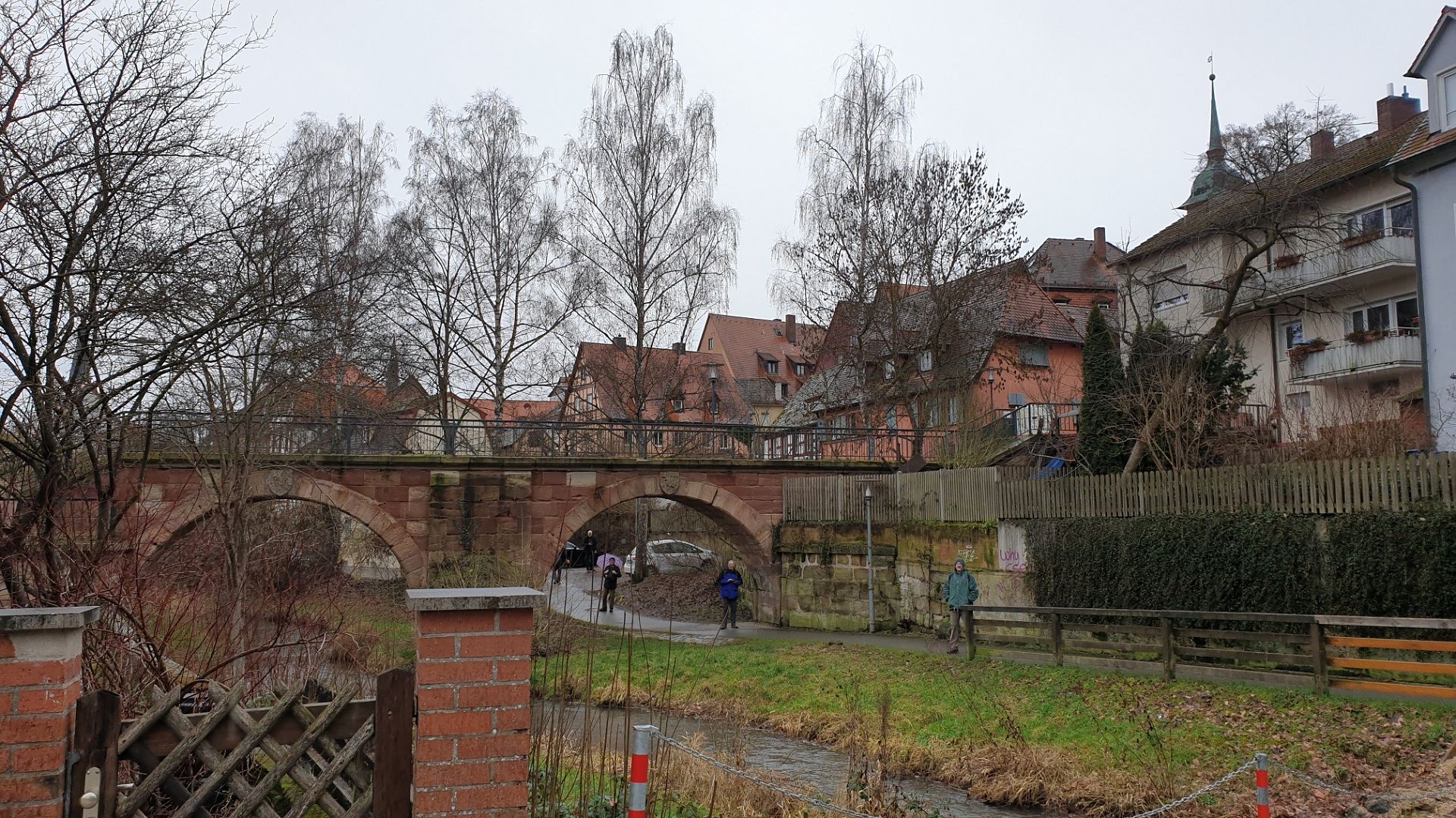 Schwabach, Stadt der Nadler, Goldschläger und auch der Hugenotten Der Wetterbericht machte uns die Entscheidung leicht, eine Stadtwanderung der freien Natur vorzuziehen. Und Schwabach mit dem schönsten Marktplatz Frankens (das glauben zumindest die Schwabacher 😁) stand schon seit längerem auf unserer Liste. Zwar sollte es ursprünglich eine Krippenwanderung oder eine Wanderung mit Einkehrschwung im Burgersgarten sein - aber beides können wir ja noch nachholen. Denn Schwabach ist tatsächlich ein schönes kleines Städtchen - leider fehlen die fränkischen Wirtshäuser, aber wie gesagt, der Burgersgarten im Sommer ...Bei wolkenverhangenem Himmel liefen wir vom Bahnhof Richtung SüdWest, am Stadtpark vorbei, zuerst durch ruhige Wohngegenden; später dann in freier Natur Richtung NordWest nach und durch Unterreichenbach. Gleich nördlich des Ortes stießen wir auf unser erstes Ziel: den Nadlersbach. Der Nadlersbach wird westlich von Unterreichenbach von der Schwabach abgezweigt und sein Wasser wurde wohl, genauso wie das des Mühlbaches, der dann vom Nadlersbach abgezweigt wird, genutzt, um Maschinen - wie der Name vermuten lässt der Nadler - anzutreiben. Denn Schwabach ist nicht nur durch die Goldschläger bekannt, sondern auch durch seine seit Mitte des 16. Jh. dort ansässigen Nadler, die hauptsächlich Nadeln und Eisendraht herstellten (mehr dazu hier). An dem fast waagrecht