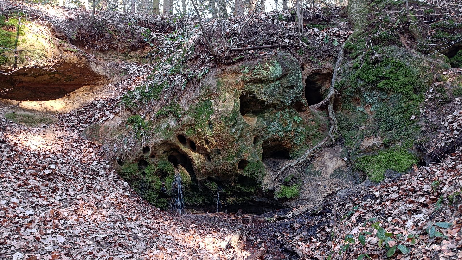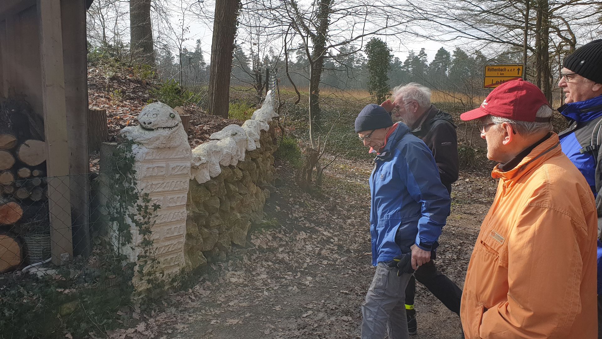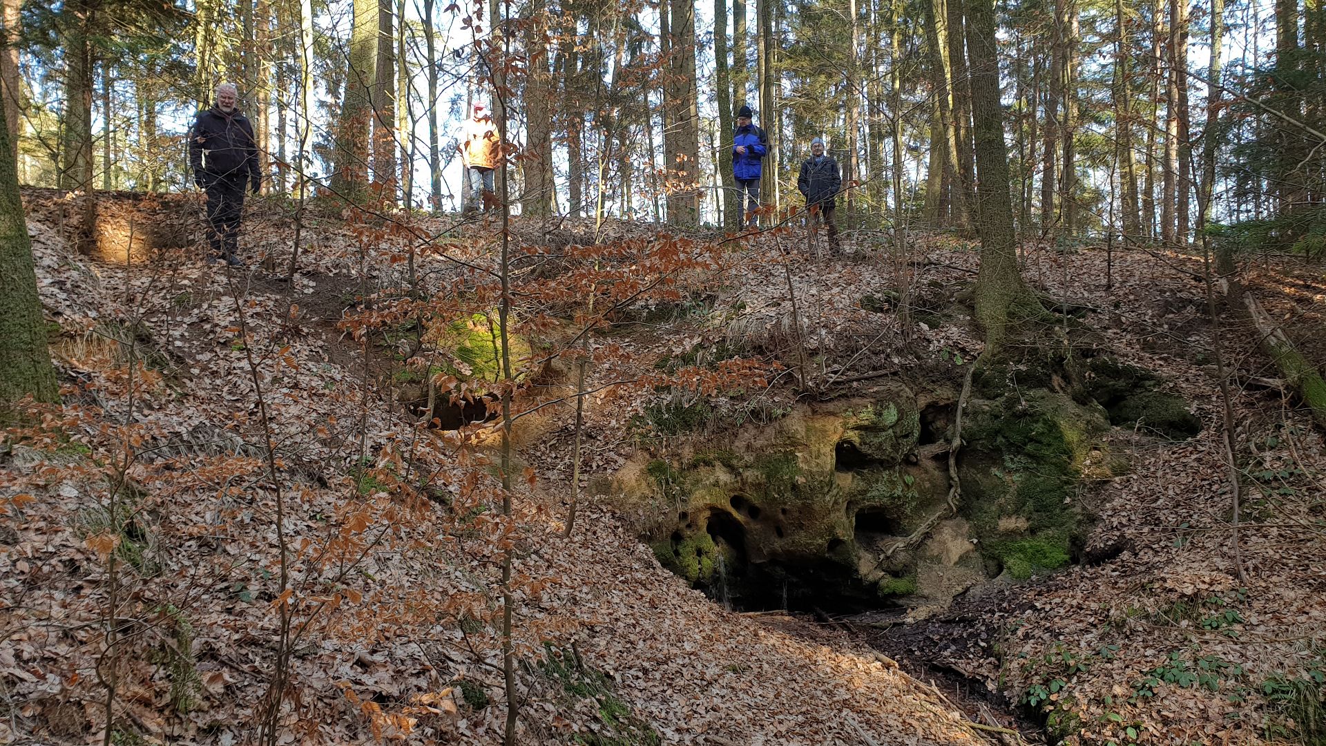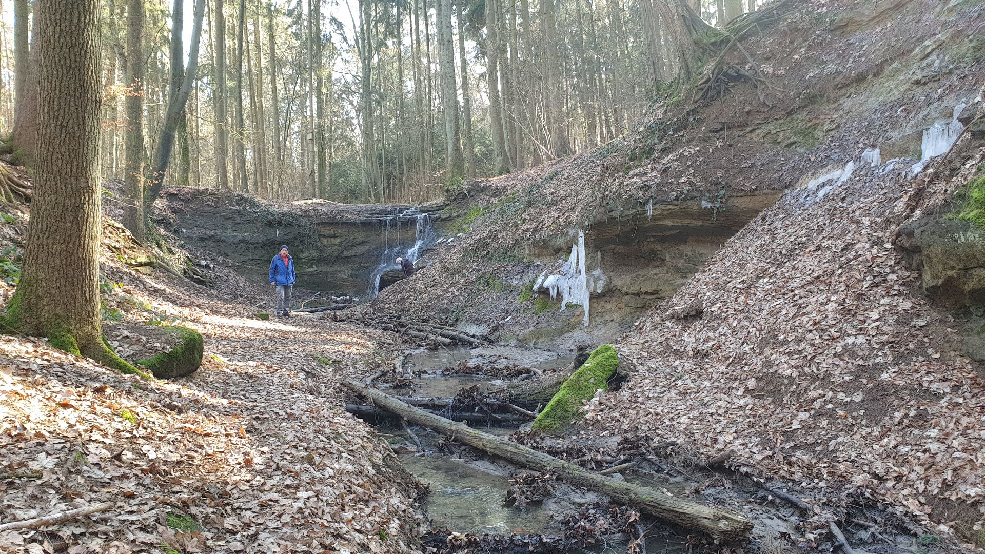 Mit Tagesticket-Plus ging es heute ohne umzusteigen (und ohne Verspätung) mit der S1 nach Röthenbach an der Pegnitz, Haltestelle Seespitze. Dort angekommen konnte man am noch etwas kühlen Vormittag bereits ahnen, dass es ein schöner Sonnentag werden könnte. Und tatsächlich ließ unser Gelber Zwerg nicht lange auf sich warten. Gutgelaunt marschierten wir mit Grünstrich/ Rotkreis über freies Feld, tankten Vitamin D und Geo-Manni versuchte sich schon nach 200 m (vergeblich) an einem Käsch. Als wir in einen schönen Wald mit imposanten Kiefern und romantischen Schluchten kamen, Schluchten, in denen sich der Himmelbach wunderschön windet, verhedderte sich Karsten vor lauter Begeisterung in eine Liane - aus echtem Efeu! (Das war aber kein Problem für ihn, denn nach eigener Aussage, lässt er sich von seiner Freundin auch ab und zu gern so, oder so ähnlich, einwickeln). Dort wo wir den Bach überquerten stießen wir bei einem Anwesen mit einem künstlerisch gestalteten Steinwall und mit verziertem und bemalten Kaminholz auf das Wanderzeichen Grüner #. Gleich dahinter, auf einer kleinen Anhöhe konnte man den Großen Hans-Görgel in der Ferne sehen, eines unserer kommenden Ziele. Bei Letten ging es über die Autobahn. Auch immer wieder interessant zu erleben, wie diese Straße, auf der man so oft mit dem Auto gefahren ist, von oben aussieht. Nach ca. einer halben Stunde durch eine gesunden Wald mit viel frischem grünem Moos und nach dem Überqueren zuerst der St 2240 (danach folgten wir Grünkreis) und dann der LAU 19, erreichten wir eine kleine Anhöhe, von der man, genau hinter dem Kirchturm von Schönberg, noch einmal den Großen Hans-Görgel und dann, weiter rechts, den Moritzberg bewundern kann. Nach weiteren ca. 300m kamen wir dann zum ersten Höhepunkt unserer heutigen Wanderung, dem Sprosselbrunnen. Den sollte man sich unbedingt von "vorn", also von unten, ansehen. Der Sprossel- oder auch Spratzelbrunnen ist eigentlich eine kleine Quelle, ein Wasseraustritt aus mehreren ausgespülten Löchern im sandigen Gestein. Nachdem jeder seine Bilder im Kästla hatte, erreichten wir nach weiteren ca. 600 m auf etwas matschigen Wegen den Klingenden Wasserfall. Auch wenn die Eiszapfen mangels länger anhaltender Kälte nicht sehr groß waren und partout nicht klingen wollten, ist die kleine Schlucht immer ein Erlebnis - und auch mal einen Besuch mit den Enkeln wert (über Haimendorf auch auf kurzem Weg mit dem Auto erreichbar). Natürlich mussten einige Mutige auch nach unten zum Hüttenbach steigen, um von dort aus die besten Bilder des Kunstwerkes der Natur zu schießen. Im Sommer kann man sich zwar auch am beruhigenden Plätschern des (meistens) Wässerchens erfreuen. Nach stärkerem Regen erinnert die Akustik, vor allem bei leichtem Wind, etwas an den Namen das Wasserfalls. Doch interessant macht dieses kleine Naturdenkmal in der ca. 5 m tiefen Hüttenbachschlucht etwas anderes: Im Gegensatz zu "normalen" Wasserfällen entfaltet dieser seine größte Wirkung nämlich im Winter. Das auch im Winter meist spärlich fließende Wasser gefriert nach längeren verschiedenen Frostperioden in nicht fest verbundenen Schichten neben- auf- und übereinander. Durch sich ändernde Temperaturen, auch durch das sich unterschiedlich verteilende, nachfließende Wasser, entstehen Spannungen und die Schichten brechen und/ oder reiben sich aneinander. Dadurch entstehen dann mystische Töne. Das gurgelnde und glucksende Wasser hinter den vielen Eiszapfen und Eisschichten tut ein Übriges, um die interessante Klangkulisse zu erzeugen. (Das ist meine persönliche Interpretation nach Internetstudium und Schulphysik). Kurz hinter dem Wasserfall verabschiedeten wir uns vom Grünen Kreis und nahmen den Weg direkt nach Haimendorf, und dort gleich den ersten Abzweig nach rechts mit Grünstrich, Richtung Renzenhof. Obwohl sich schon langsam der Magen meldete, wir hatten uns erst für die zweite Tischzeit angemeldet, machten wir noch einen Abstecher zum Fürer-Schloss, das man allerdings nur durch einen eisernen Zaun, aus angemessener Entfernung, bewundern kann. Danach liefen wir ein Stück auf Teer. Achtung: kurz hinter dem Anwesen "Grüne Au", vor der Kurve, biegt der Weg, nun Blaukreuz, nach rechts ab. Auf schönen Pfad ging es nun bis Renzenhof, wo wir pünktlich um 13:15 im Gasthaus Mais einliefen. Das Gasthaus war, wie immer, gut besucht - gut, dass wir reserviert hatten (was dieses mal, sicherheitshalber 🙂, Udo übernommen hatte). Wir wurden hervorragend bewirtet und das Laufer Simon-Bier zählt sowieso zu unseren bevorzugten Sorten, wobei auch das bleifreie Pyraser von einigen, sogar als "Hausmarke", sehr geschätzt wird. Grüßen wollen wir von hier aus die netten Gäste am Nachbartisch, für die ich oben bei "Route ... Download" eine Variante ab Lauf und bei "Wandergebiet..." und unten mit "Komoot" auch noch ein paar andere Wandervorschläge zum Klingenden Wasserfall beigelegt habe.
