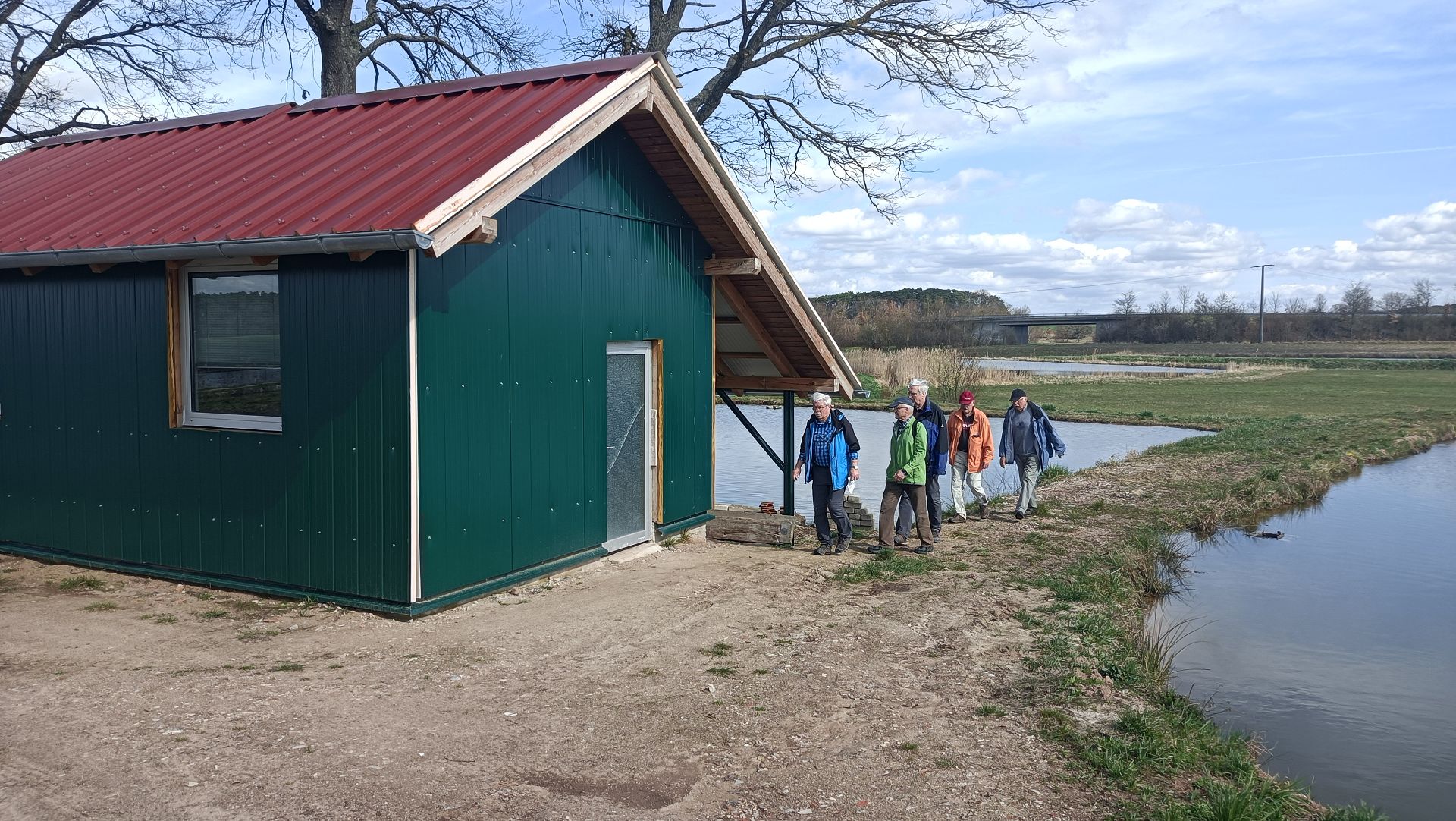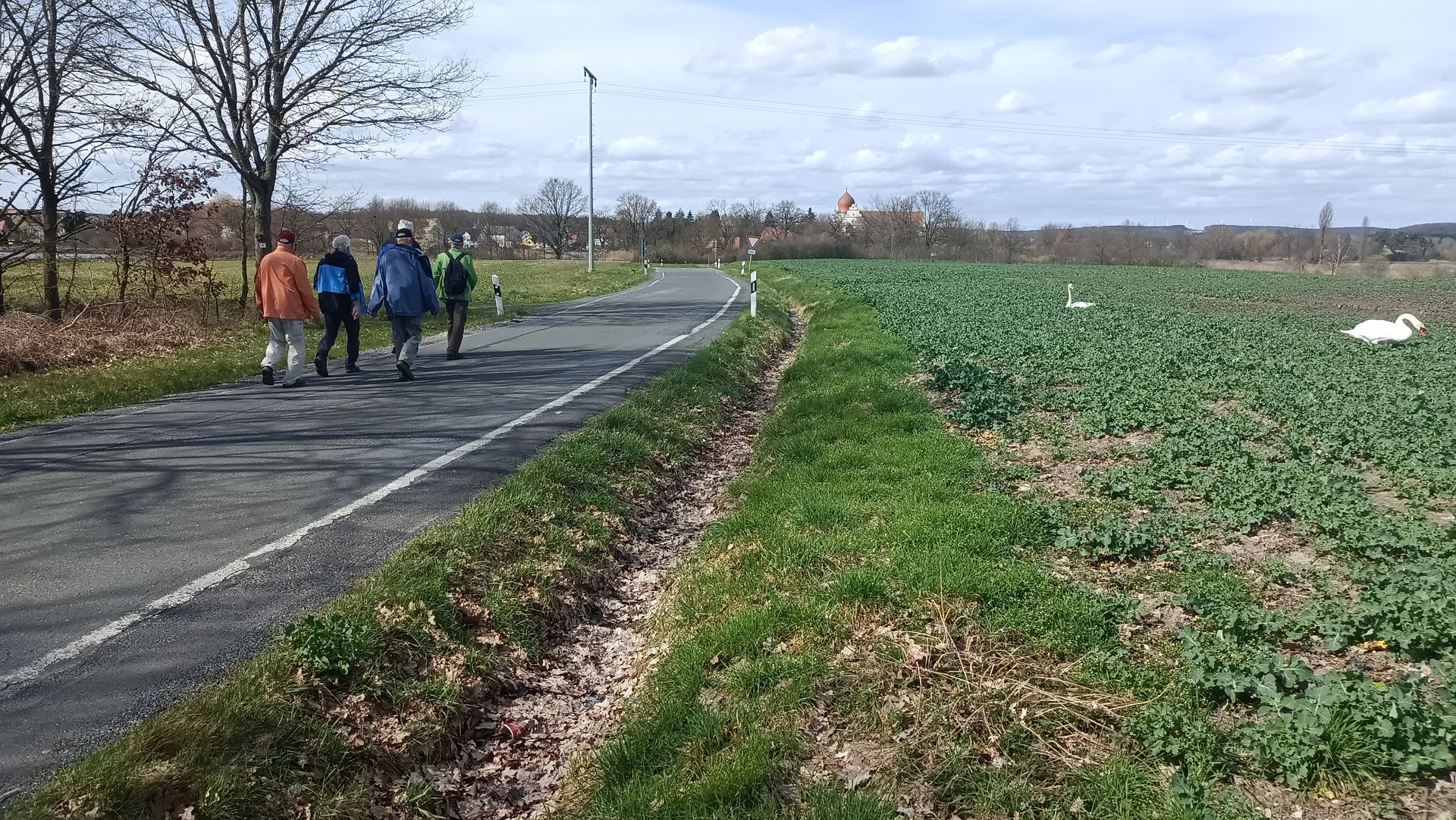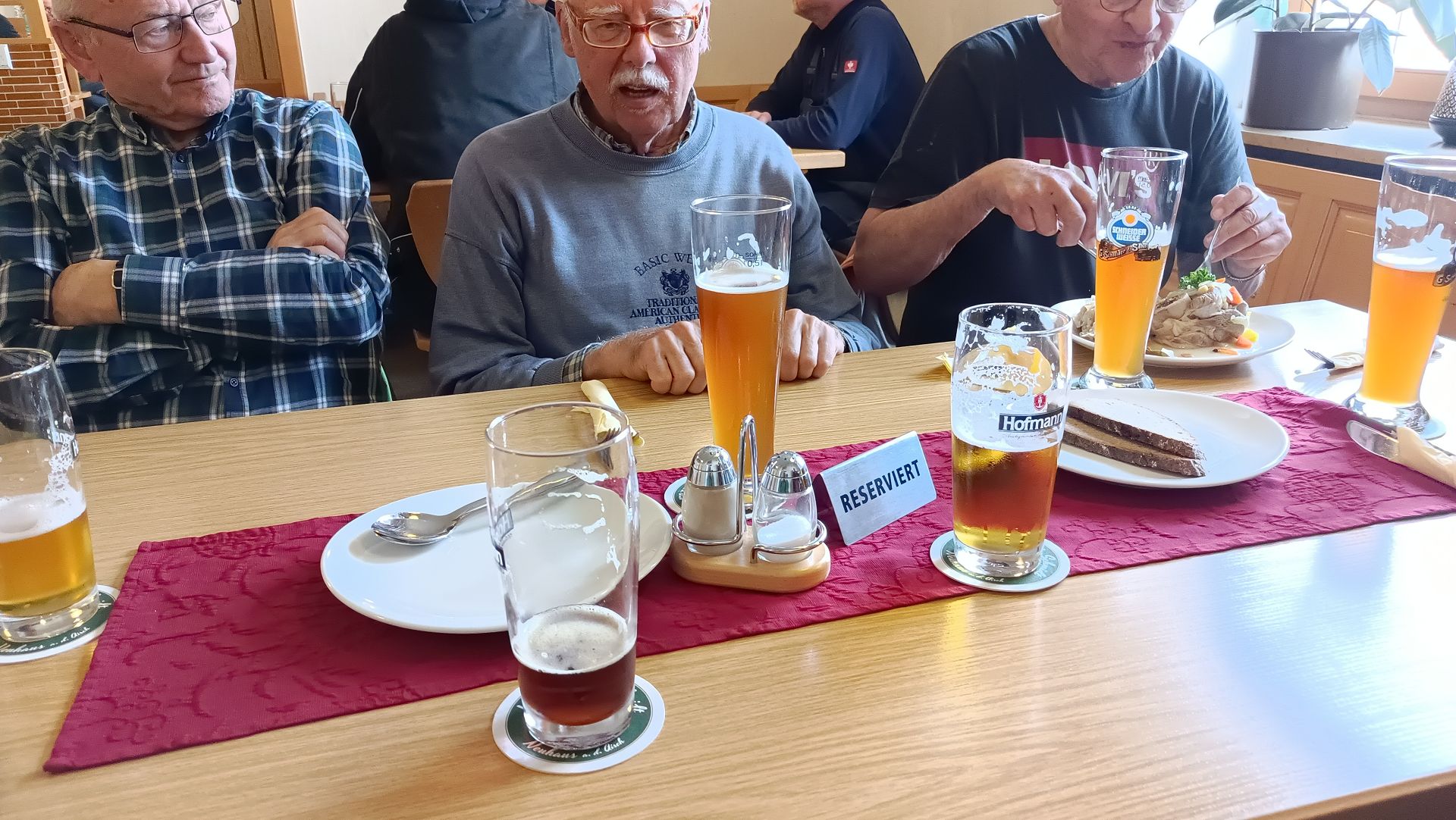nicht an den Knien. Im, vor der sengenden Sonne schützenden Waldes, genossen wir diesen schattigen Weg, bis wir auf die Straße Heppstätt – Neuhaus kamen. Auf einem Feld nahe der Straße bediente sich ein Schwanenehepaar an den Blättern der Feldfrüchte. Wir dachten dabei auch schon ans Essen, denn zur Gaststäte Schmidt war es nicht mehr weit. Vorbei am Fischerhäusla, was wir ja schon einmal besichtigt hatten, kamen wir rechtzeitig an und wurden von Frau Schmidt persönlich bedient. Während des Essens wurde weitestgehen geschwiegen, danach aber die üblichen Themen behandelt. Nur eine Sache war anders als sonst: Jeder war mit seinem Bierglas zufrieden! ...