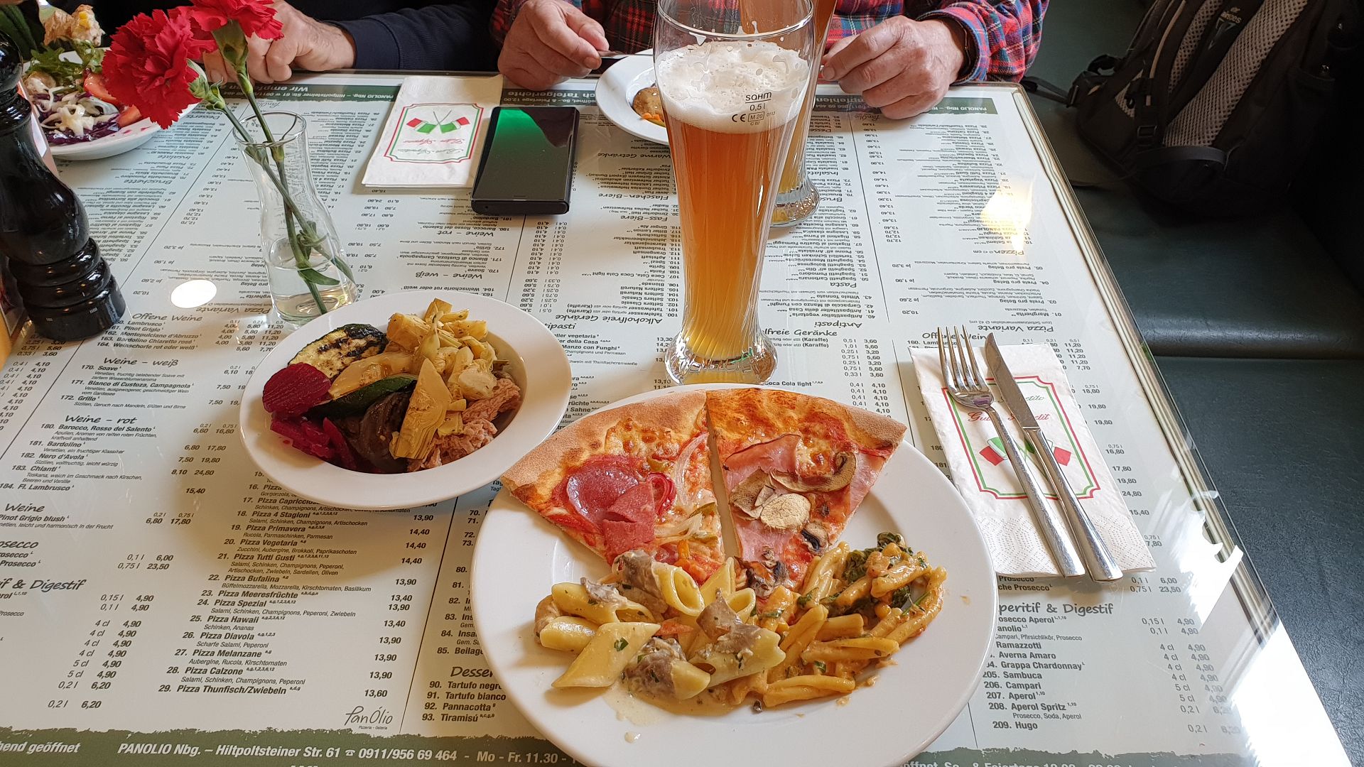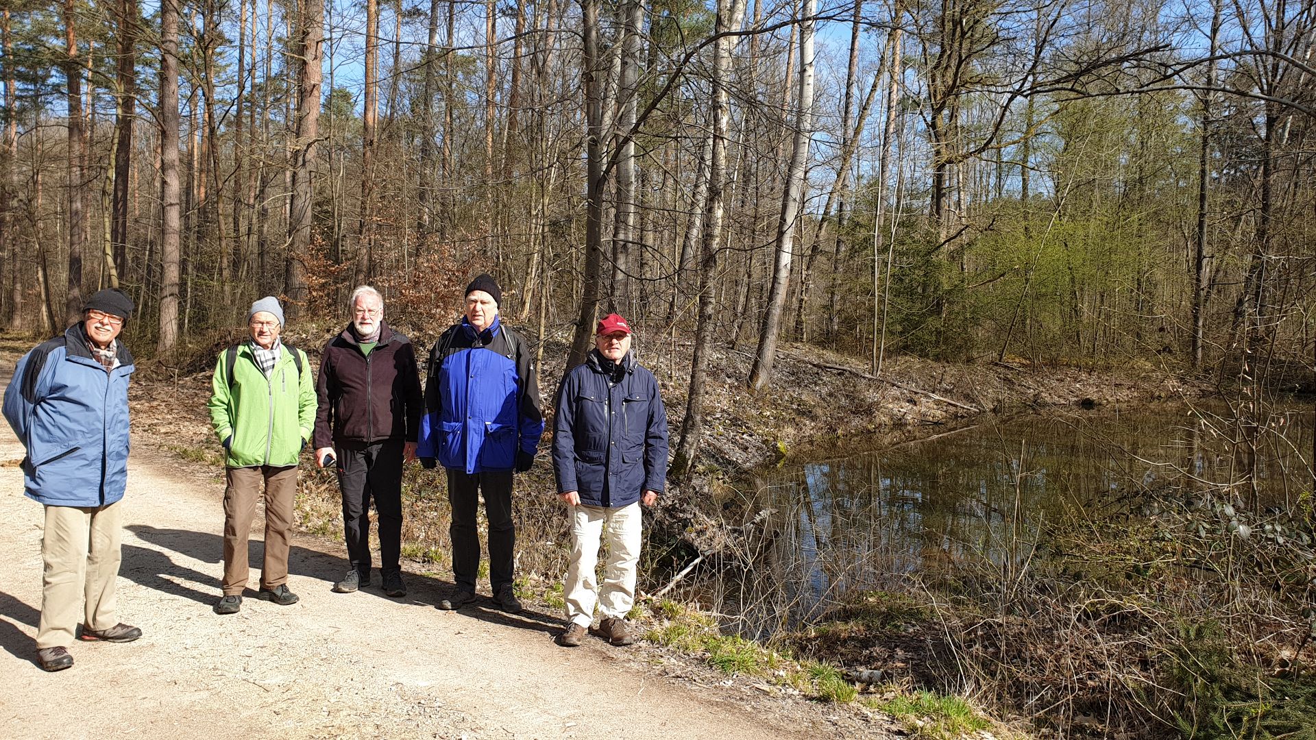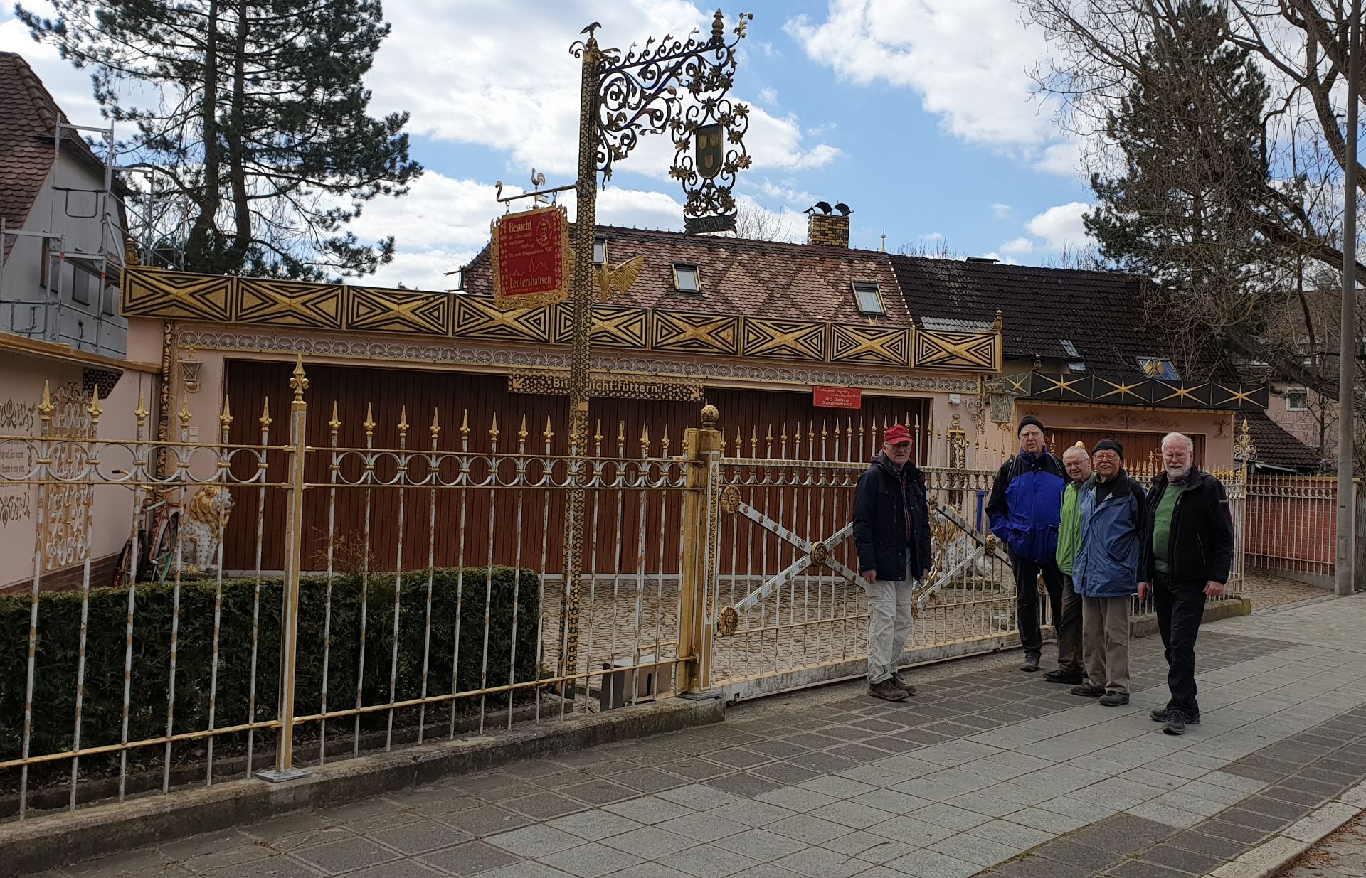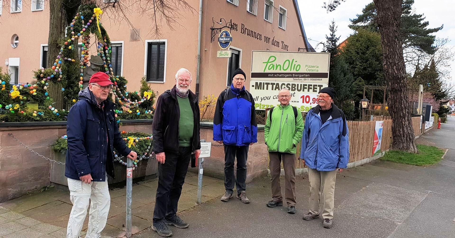 Nun ist sich auch Achim sicher: die schönesten Wandergebiete und vor allem die besten Wanderziele findet man im Osten von Erlangen 😉; bei "All you can eat" für € 10,99 waren auch die frühjahrsbedingten teilweise etwas matschigen Wege schnell vergessen - und Rolands Christine hat sicherlich dazu beigetragen, dass derselbige am nächsten Mittwoch wieder wie aus dem Ei gepellt da steht! Mit TTP und Bussen ging es nach Heroldsberg. Wir starteten am Rathaus, liefen unter der Bahn durch, dann ein Stück durch ein ruhiges Wohngebiet und waren schnell im Sebalder Reichswald. Da Henry urlaubsbedingt nicht dabei war, hat Karsten die Führung übernommen - und sich gleich einen Verhauer erlaubt! Dieser bescherte uns einen guten Kilometer Umweg und dank Udos Beharrlichkeit ein paar 100 Meter auf von Wildschweinen durchpflügter Strecke. Mit ein paar weiteren 100 Metern zusätzlich hätte uns Karsten zwar auf ordentlichen Wegen wieder auf unseren Planweg gebracht, aber dann hätte er die Gelegenheit verpasst, den winkenden Fahrgästen in der vorbeifahrenden Gräfenbergbahn zurückzuwinken 😁. Die ca. 7 km im Reichs- (mehrheitlich Misch-) wald sind abwechslungsreich und machen Lust auf mehr - es gibt zahlreiche Wege, auch mal in die andere Richtung mit Einkehr in Heroldsberg. Allerdings muss man auch hier, wie überall im Reichswald, immer wieder mal ein Stück Kiesweg akzeptieren - was Wanderern und erst recht Radfahrern, nicht gerade leicht fällt! Nach ca. 500 m durch ein Wohngebiet in Ziegelstein erreichten wir pünktlich unser heutiges (Zwischen-) Ziel - das italienische Restaurant Panolio - passenderweise (zu unserem Durst), am Bierweg, direkt neben einem sehr schönen Osterbrunnen, einem interessanten vergoldeten Wohnensemble, gegenüber der Kirche St. Georg. Nachdem wir ausgiebig getafelt hatten, ging es weiter Richtung Flughafen: kurz vorbei an z.T. schönen alten kleinen Häusern, durch Grünanlagen vorbei am Breznwirt (der die Coronazeit offensichtlich genutzt hat, seine Preise "anzupassen"), durch das Industriegebiet Andernacher Strasse und wieder durch Wiesen und Wald zur Bushaltestelle "Cargo" am Flughafen. |
