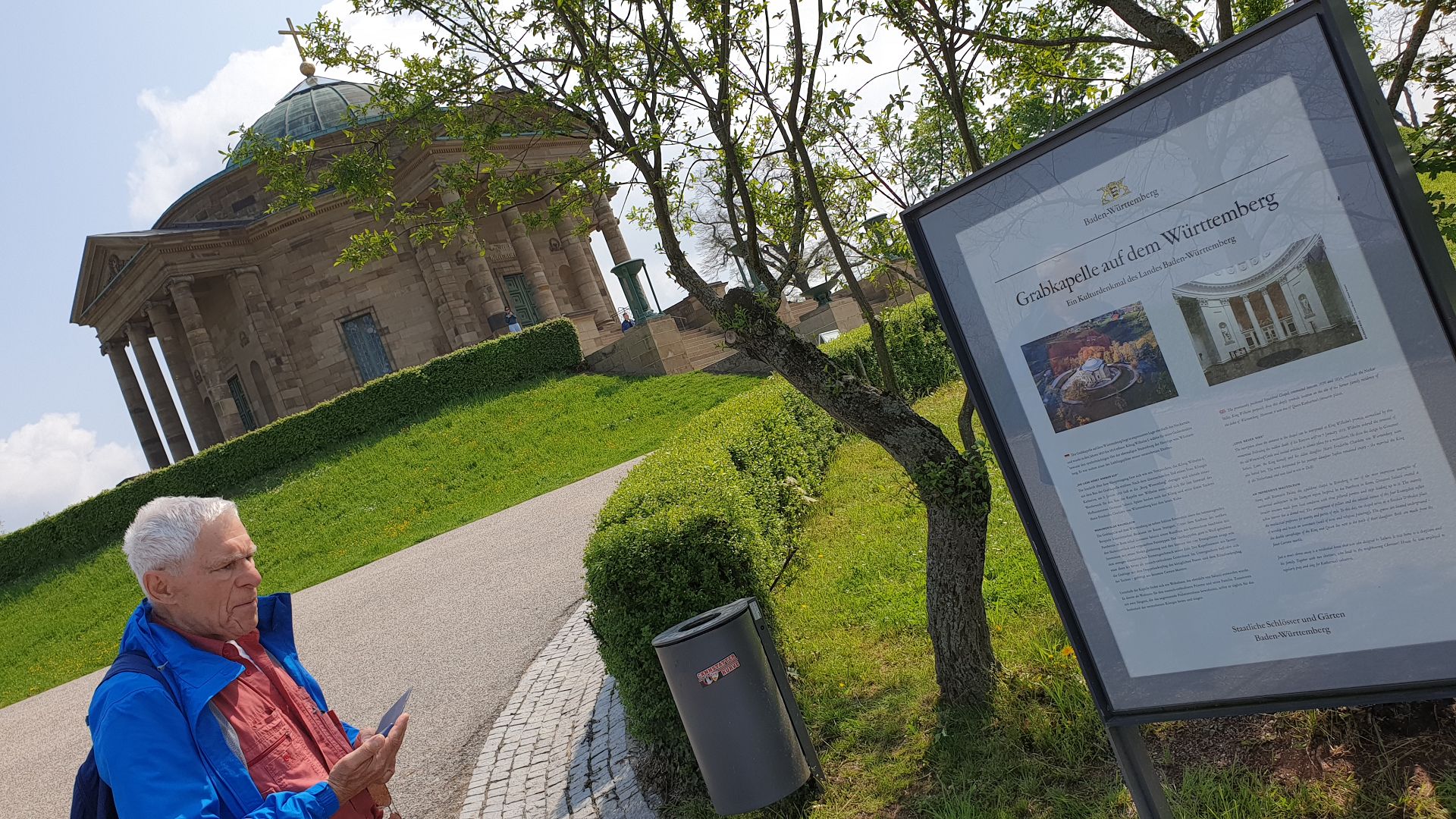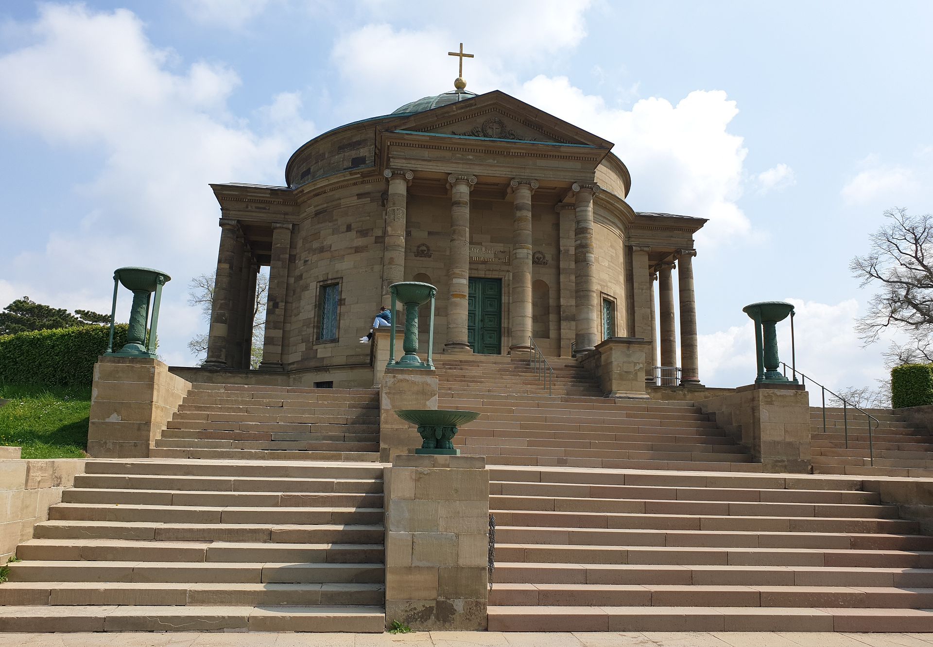 geschlossen und nur von Außen zu bewundern. Der klassizistischen Grabkapelle auf dem Württemberg dienten antike Bauten wie das römische Pantheon, aber auch Renaissance-Bauten wie die Villa Rotonda in Vicenza als Vorbilder. Ähnlich einem Tempel ist sie mit antiken ionischen und korinthischen Säulen und Pfeilern, einer kassettierten Kuppel und antikisierendem Gebälk, gusseisernen Dreifüßen und Opferschalen (im Außenbereich) ausgestattet. (inhaltlich: https://www.grabkapelle-rotenberg.de/wissenswert-amuesant/stilgeschichte)