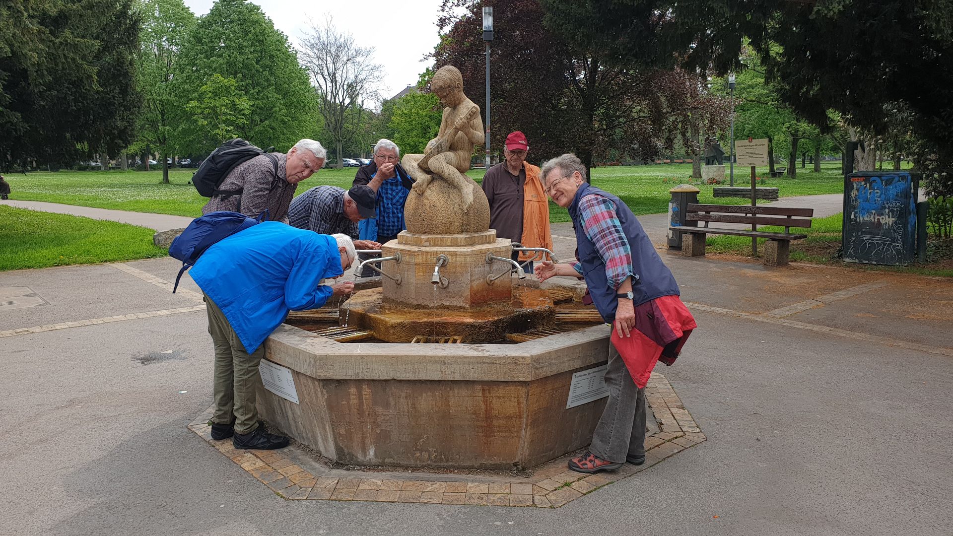 sehenswerte Details. Ein fast größeres Interesse als der Kirche wurde aber den Karpfen im See geschenkt. Bloß weil wir schon im Mai sind, verzichtete Udo darauf, ein Exemplar zu angeln und zu verspeisen. Der Feuersee war unser Wanderendpunkt und nach einer S-Bahnstation erreichten wir das Hotel Astoria, wo wir unser Gepäck wieder abholten. Hier trennte sich die Gruppe. Der größere Teil besuchte noch die sehr interessante Ausstellung "Stuttgart 21", während Roland noch zu einem Verwandschaftsbesuch nach Ludwigsburg musste. Damit war der Stuttgart-besuch beendet, genauso wie dieser Bericht - .. den der ganz offensichtlich immer noch in seine Heimatstadt verliebte Roland verfasst hat. |