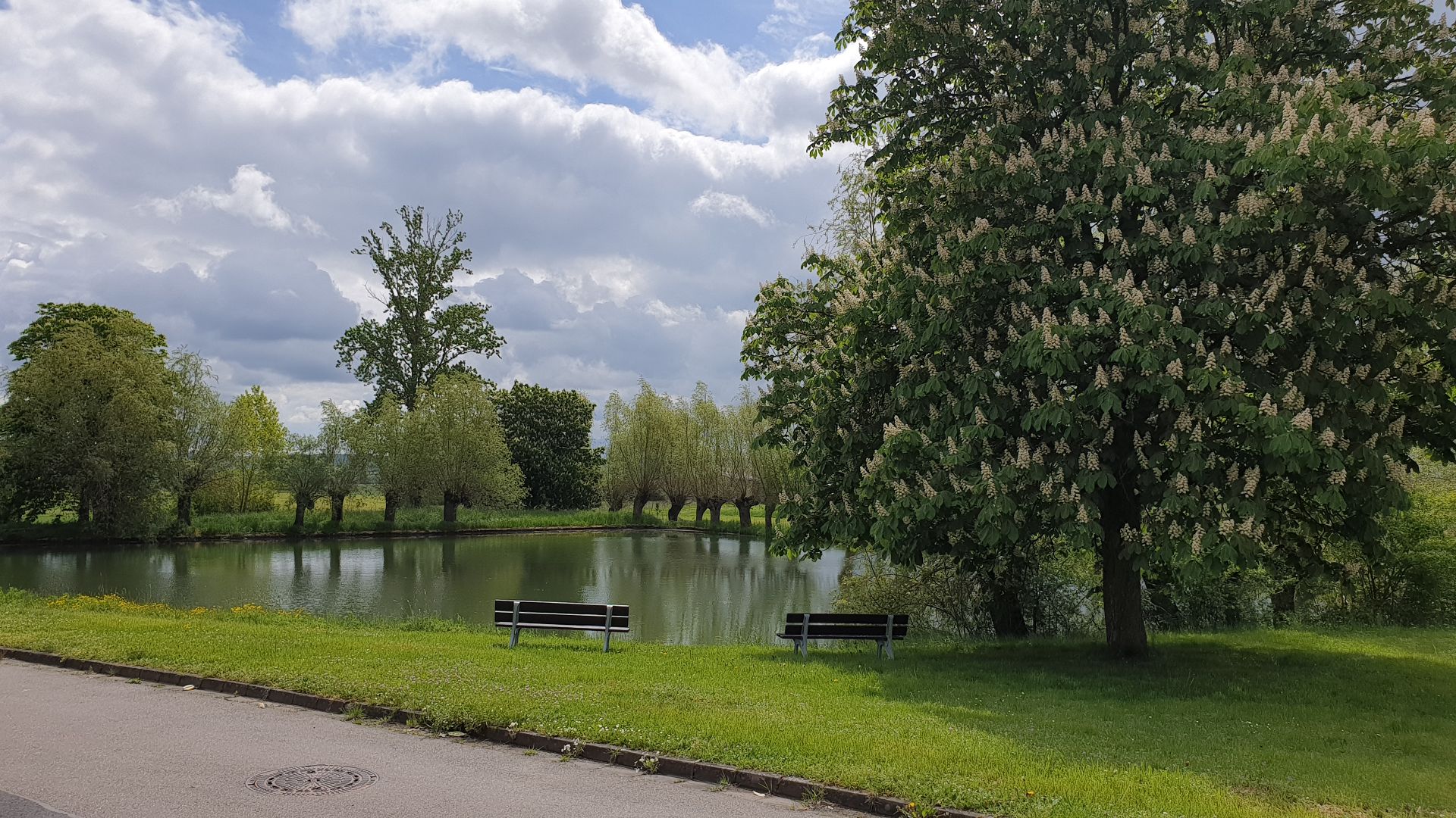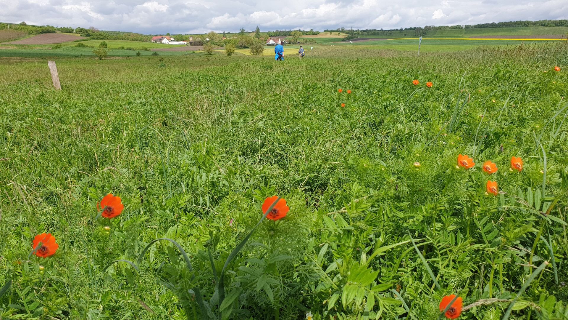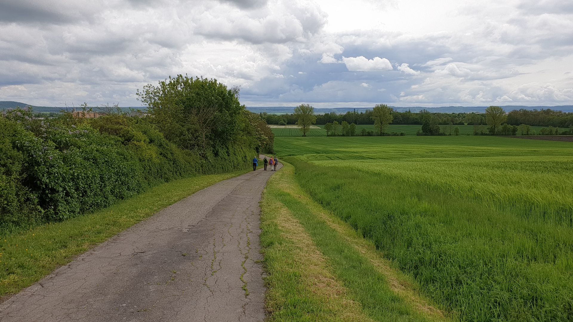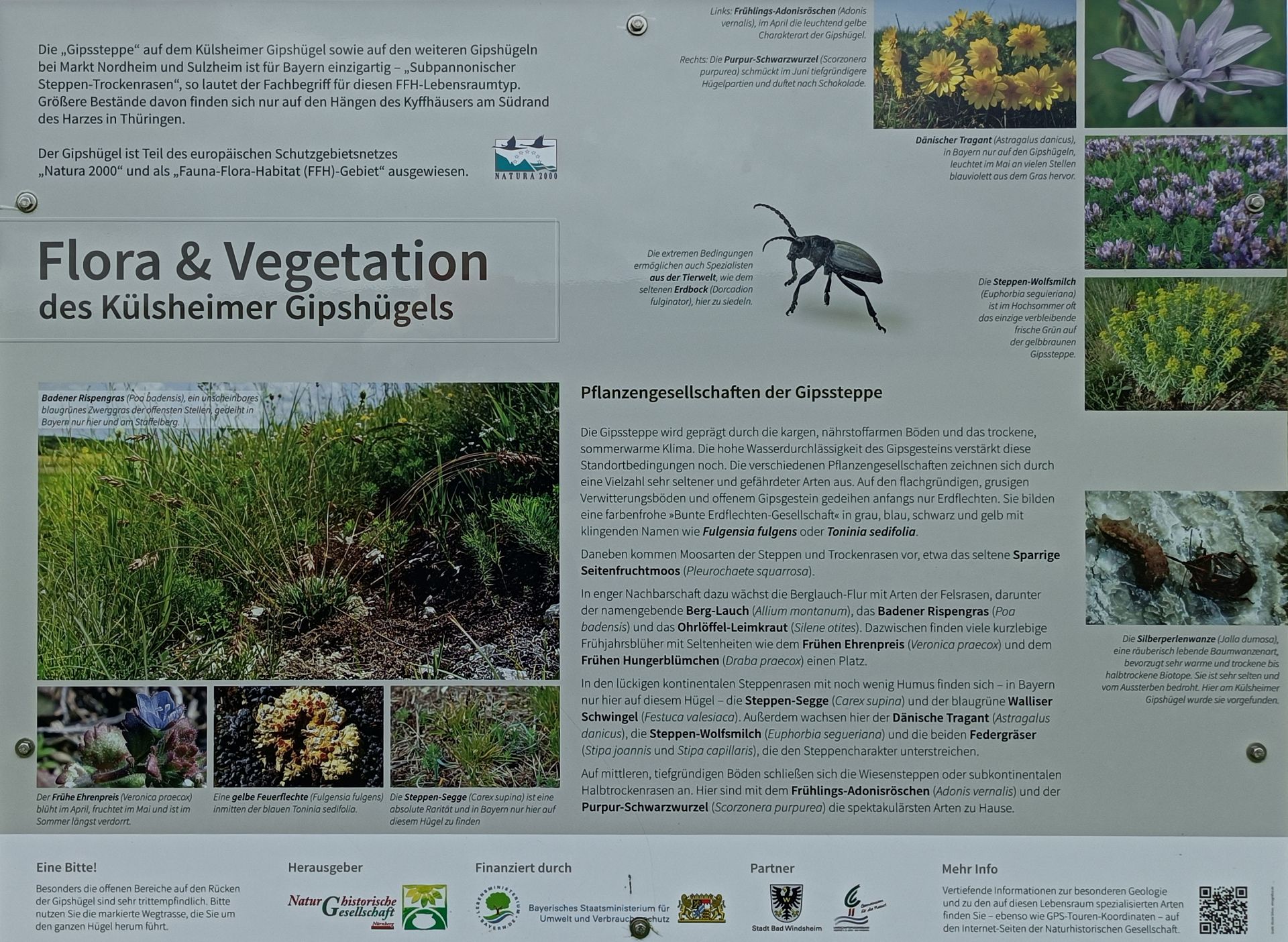 ... so war jedenfalls der Plan. Um es vorweg zu nehmen: Küchenschellen und Weinberg-Tulpen haben wir nicht gesehen, aber dafür viele schöne gelbe Frühlings- und ... unerwartet: schöne rote Sommer-Adonisröschen - und die Schnitzel bei der Magda im Schwarzen Adler in Oberntief sind ohnehin die Reise wert! Aber der Reihe nach: Vom Bahnhof in Bad Windsheim ging es durch den Kurpark zum Scheibenberg, an dem es, laut eines Berichtes des DAV, im April 2016 noch mit Weinberg-Tulpen übersäte Rebhänge gegeben haben soll. Heute fanden wir am Scheibenberg weder Reben noch Tulpen. (Nachtrag: am 14.06 entdeckten wir beim Vorbeifahren auf der Straßenseite einen Hang mit Reben. Den kann man zwar auf dem vom DAV beschriebenen Weg nicht sehen, aber trotzdem wollen wir ihn nächstes Jahr, Anfang Mai, genauer unter die Lupe nehmen). Nichtsdestotrotz bot der Hang auf dem vom DAV beschriebenen Weg aus Richtung Bad Windsheim kommend, einen schönen Anblick, mit einem Meer von gelbem Hahnenfuß zwischen den Obstbäumen (die aber mit Sicherheit schon länger als 7 Jahre stehen). Überhaupt bot die Natur ein farbenfrohes Bild mit Grün in allen Schattierungen, gelbem Hahnenfuß und Rapsfeldern und großflächig weiß schimmernden Wiesen mit den Pusteblumen des bereits verblühten Löwenzahns. Bevor wir am Scheibenberg nach Osten abbogen, erschreckte uns Karsten mit einem lauten Schrei - Gott seis gedankt, es war ein Freudenschrei: er hatte am Wegesrand ein rotes Sommer-Adonisröschen entdeckt. Damit war für ihn der Ausflug schon jetzt ein Erfolg - trotz der Enttäuschung über die nicht gefundene Wilde Tulpe. Weiter ging es nun zum sogenannten Adonishügel mit seinen 20.000 Jahre alten Pflanzen. Wenn man zur richtigen Zeit zum unter Naturschutz stehenden Külsheimer Gipshügel wandert, so soll man (lt. wildganz am 14 km - Wanderweg) schon von weitem die gelben Adonisröschen blühen sehen, die sich wunderbar mit den lila blühenden Küchenschellen aus der uralten Steppenheide abheben. Ganz so toll war es dann doch nicht. Weder von weitem noch kurz vor dem Hügel sahen wir Farben, die uns Hoffnung machen konnten. Ein wenig enttäuscht wollte Roland sogar kapitulieren, denn der Pfad nördlich vorbei am See ist zwar romantisch, aber mit einem etwas steilen Wegstück bei feuchtem Boden nicht ganz ungefährlich (jedenfalls für manch einen Rentner). Bereut hat er allerdings nicht, dass er bei uns geblieben ist. Denn am Hügel selbst erwarteten uns dann doch viele, viele Frühlings- und eine ganze Reihe Sommer-Adonisröschen. Selbst wenn man auf dem ausgezeichneten Weg bleibt (was wir natürlich taten) findet man viele schöne Fotomotive. Wer jetzt von hier noch einen Umweg Richtung Oberndorf in kauf nimmt, soll, nach einem Bericht der Markomannia, unterhalb von "Vorderer Berg" und "Hinterer Berg" auch noch die Weinberg-Tulpe finden können. Das haben wir allerdings aufs nächste Jahr verschoben. Wir marschierten weiter nach Erkenbrechtshofen. Dort erfreuten blühende Kastanien an einem romantischen Weiher und ein einladend aussehendes Gasthaus mit dem schönen Namen "Adonisröschen" unser Auge. Ein ideales Ziel für einen Familien-Sonntagsausflug! Doch leider ist auch Erkenbrechtshofen vom Gasthaussterben nicht verschont geblieben; ein großes Schild "Geschlossen", ohne weitern Hinweis, lässt vermuten, dass das dauerhaft gemeint ist - schade. Nun ging es mit großen