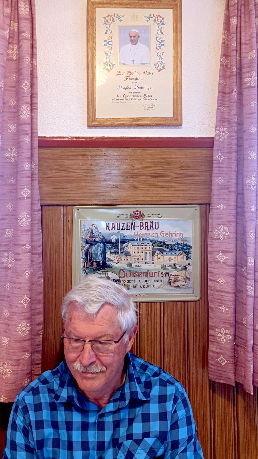 runter zum Weg von Unterntief nach Oberntief. Dass die Schnitzel bei der Magda Weltklasse sind und dass auch die Seniorenportionen jedes normale Schnitzel in den meisten anderen Gasthäusern vor Neid erblassen lassen, muss ich nicht zum 100sten Mal erwähnen 🙂 So zogen wir gesättigt und zufrieden wieder los. Nun auf dem (fast) direkten Weg nach Bad Windsheim: Zuerst ein Stück Straße, dann nach links über den Königsberg und über den Scheibenberg (wo wir noch einmal vergeblich nach der Wilden Tulpe Ausschau hielten). Dann ging es auf dem Hinweg zurück in den Kurpark - dort gönnten wir uns einen Eisbecher im Kur-Cafe - bevor wir pünktlich und ohne Verspätung mit dem VGN zurückfuhren. Auch zu erwähnen ist (wenn auch dieses mal nicht besucht): Das Dorfmuseum „Frohsinnshof" in Oberntief. Ein altfränkischer Bauernhof mit all seinen Nebengebäuden, bis unter die Dächer voll mit alten Maschinen, Geräten und Fahrzeugen. Immer wieder interessant sind auch die original eingerichteten Räume wie Küche, Schlafzimmer und "gute Stube", so wie wir es zum Teil selbst noch auf dem Lande gesehen haben. |