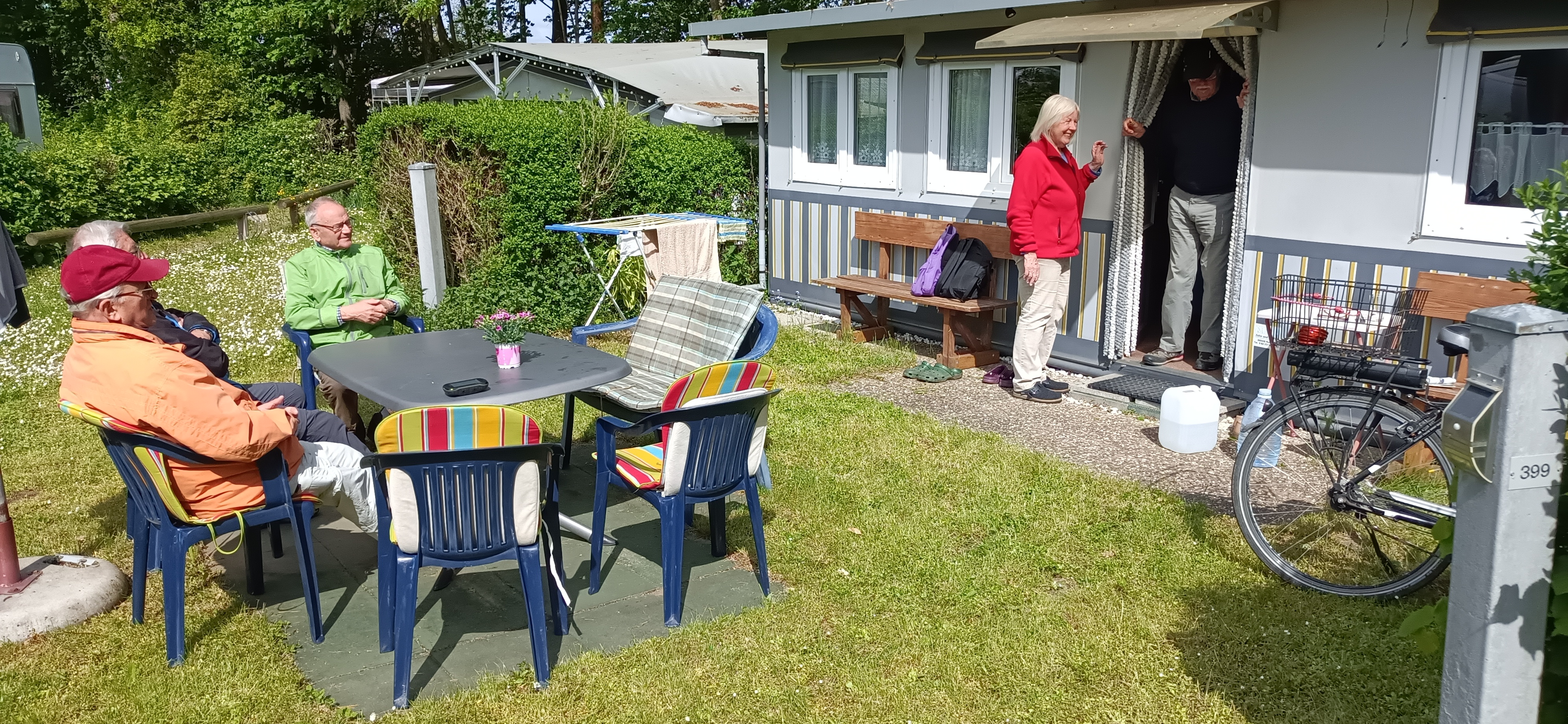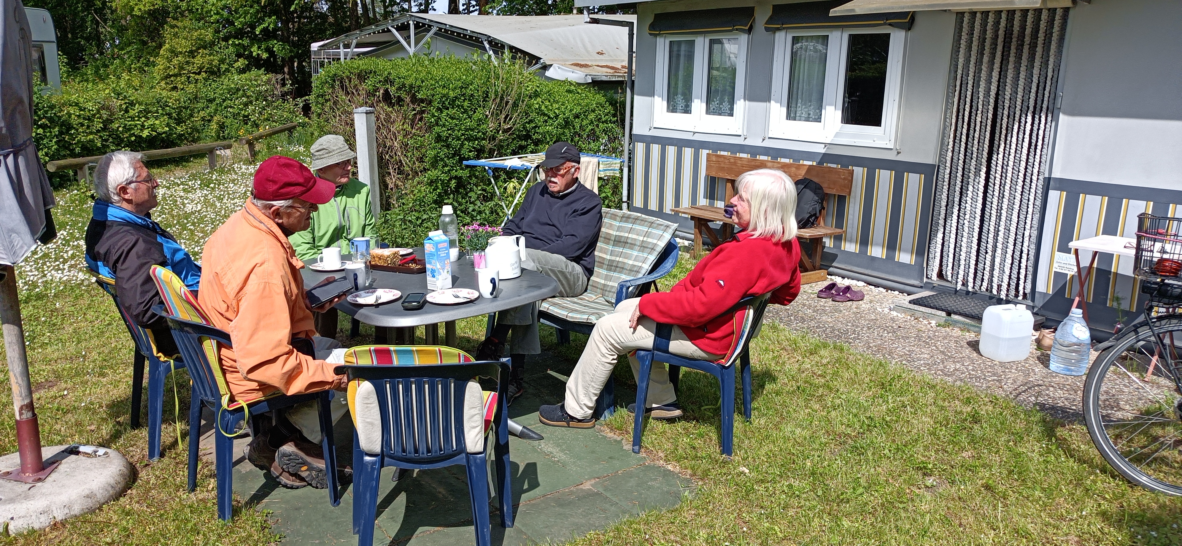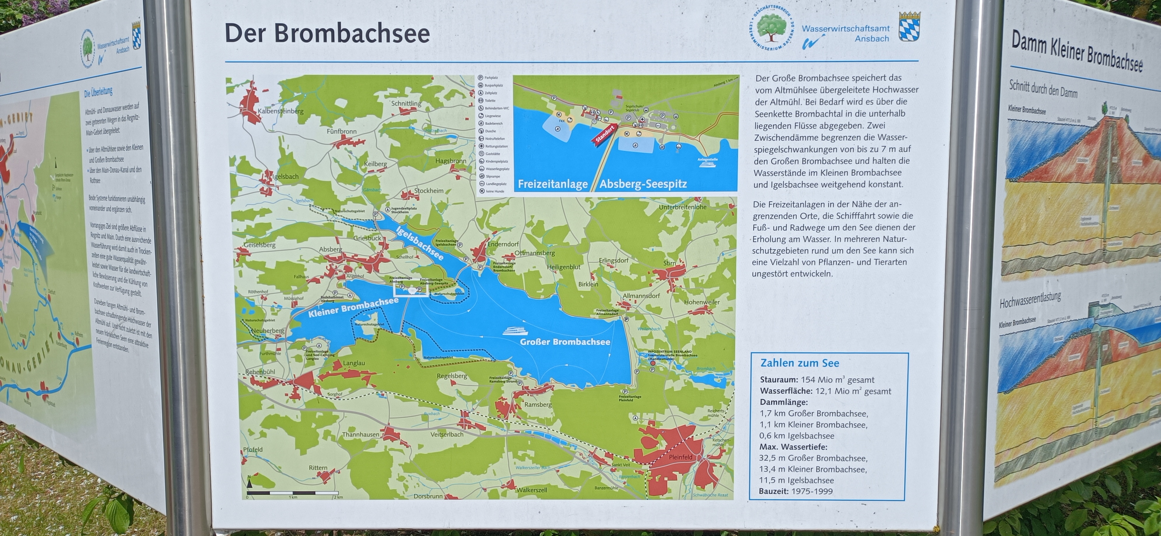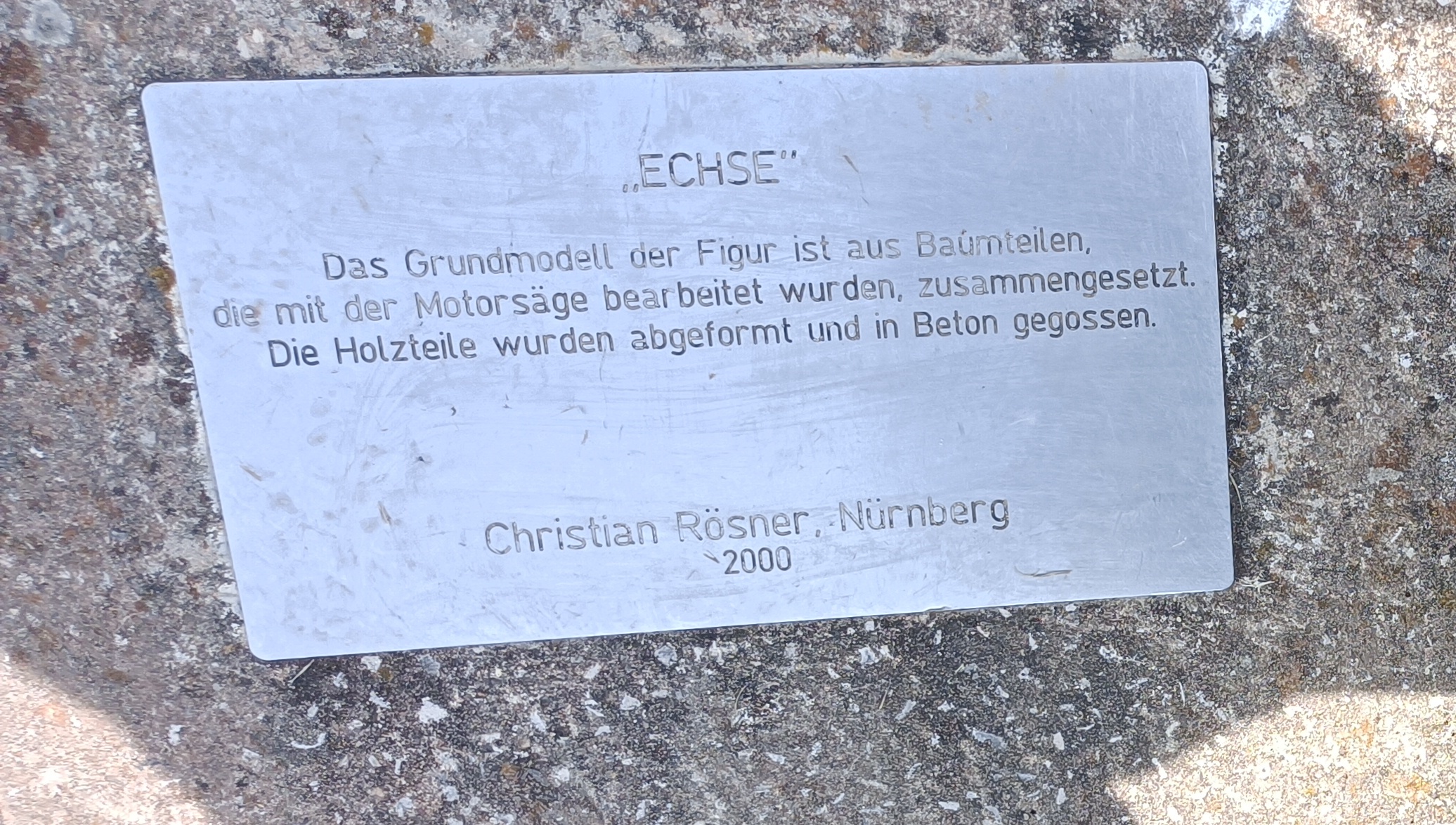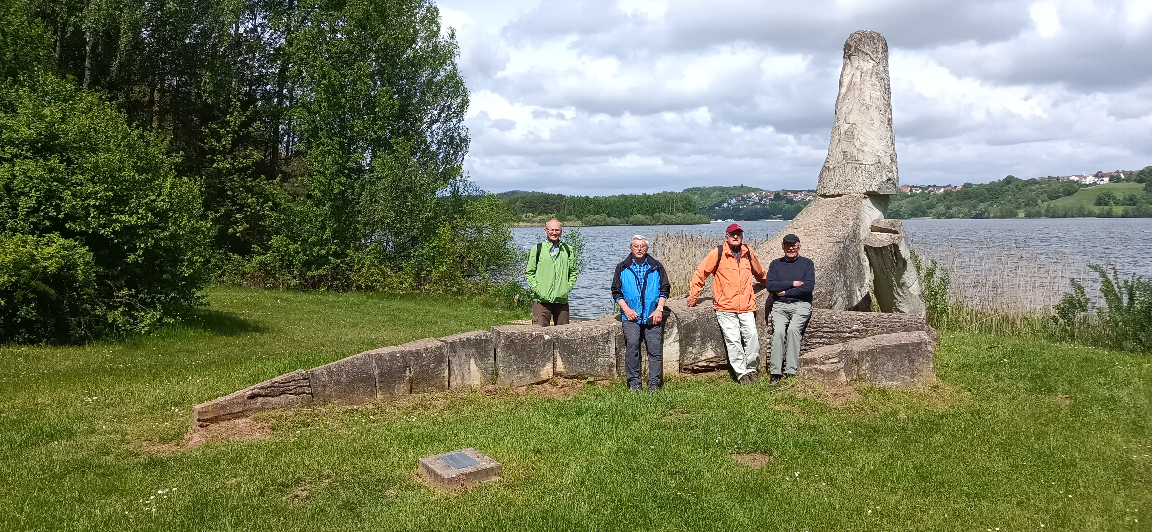 Von allen vorgeschlagenen Varianten wählte Udo die mit den wenigsten Kilometern aus, wohl ahnend, daß er an diesem Tag nicht der Fitteste sein würde. Wir nahmen den Rundwanderweg entgegengesetzt zum Uhrzeigersinn in Angriff, bei idealem Wanderwettter, kühl, aber sonnig und trocken. Obwohl der See nur 2,5 km lang und 1 km breit ist, beträgt die Uferlänge aufgrund der vielen Buchten 8,5 km. Auf feinem Schotter führte der flache Weg, anfangs noch mit Lampen versehen und meist durch Wald, entlang des Ufers des kleinen Brombachsees gen Osten. Links hatten Biber sinnloserweise Bäume gefällt. Dann folgte kurz vor dem Abzweig zur Staumauer, die den kleinen vom großen Brombachsee trennt, die „Echse“. Dieses 10 m lange und 4 m hohe Kunstwerk eines Nürnberger Künstlers, wurde als Grundmodell aus Baumteilen, die mit der Kettensäge bearbeitet wurden, zusammengestellt, diese Holzteile abgeformt und in Beton gegossen. Ein wahrlich beeindruckendes Werk mit dem senkrecht aufgestellten Kopf der großen Echse. Über den Damm schreitend, immer wieder platzmachend für die zahlreichen Pedelecfahrer, diskutierten wir über den Höhenunterschied beider Seen (minimal 1 Meter, aktuell dürften es aber 2 Meter gewesen sein). Von Weitem ertönte das Nebelhorn des großen Brombachseedampfers, aber auf dem See war sonst nichts los. Zwar schien die Sonne, aber es war frisch, auch wehte ein Wind. Inzwischen (immer noch flach) liefen wir auf Asphalt, schauten uns hoffnungsvoll den FKK-Strand an, dessen Einblick durch einen herbertsraßenähnlichen Blickschutz verhindert wurde. Dort trieb sich aber nur ein Mann mit einem Metallsuchgerät herum. Nach dem FKK-Strand ging es weiter am Nordufer, wo man die Wakeboardanlage zwar sehen, aber nicht die Mutigen bei ihre tollkühnen Sprüngen beobachten konnte. Keine Überraschung bei 10 grad Wassertemperatur. Das nächste Highlight war das Strandhotel Seehof. Christine war uns inzwischen schon mit dem Fahrrad entgegengekommen. Die Küche hatte extra für uns Schweinebraten bereitgehalten, nur Karsten wollte eine Extrawurst, die dort Curry-Wurst hieß. Nachdem wir im Selfservice die Tabletts gefüllt und bezahlt hatten, setzten wir uns nieder. Karsten war so garnicht zufrieden mit seiner Wahl, denn der Salat war ungenießbar, zwar frisch aber gräußlich vom Geschmack her und die Curry-Wurst hatte den Namen nicht verdient. Den Anderen hat‘s aber geschmeckt - nur Achim weinte dem im "Seestüberl" angebotenen Kaiserschmarrn nach. Zum Schluss entschied sich der Ein oder Andere bei einer Udo- Gedenkminute für Rückengeschädigte - noch für einen Eisbecher. So abgefüllt, machten wir uns auf zur letzten Etappe: dem Campingplatz von Langlau auf das Domizil von Christine und Roland. Dabei gab es auch wieder einen kleinen „Verlaufer“, der wohl sockenqualmertypisch ist und nicht ausschließlich etwas mit Udo zu tun hat (Bem. Udo: Vorsicht ... ganz dünnes Eis). In den „Latifundien“ angekommen, wurde Bier, Kaffee und Kuchen anageboten. Auch Schnaps kam noch dazu, was alle einhellig ablehnten aber dann doch zu Christines Eierlikörkuchen hinuntergespülten. Da wir das gesellige Beisammensein genießen wollten, ließen wir den Zug um 14:23 sausen und nahmen den um 15:23. Roland brachte uns noch zum Bahnhof, aber nicht nur um uns zu führen, sondern auch um sein Fahrrad von dort wieder mitzunehmen. Christine und Roland sei Dank für die nette Bewirtung. Ohne DB-typische Probleme erreichten wir nach langer Fahrt Erlangen Nun folgt ein Auszug aus