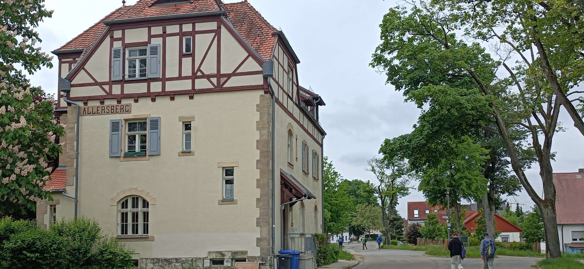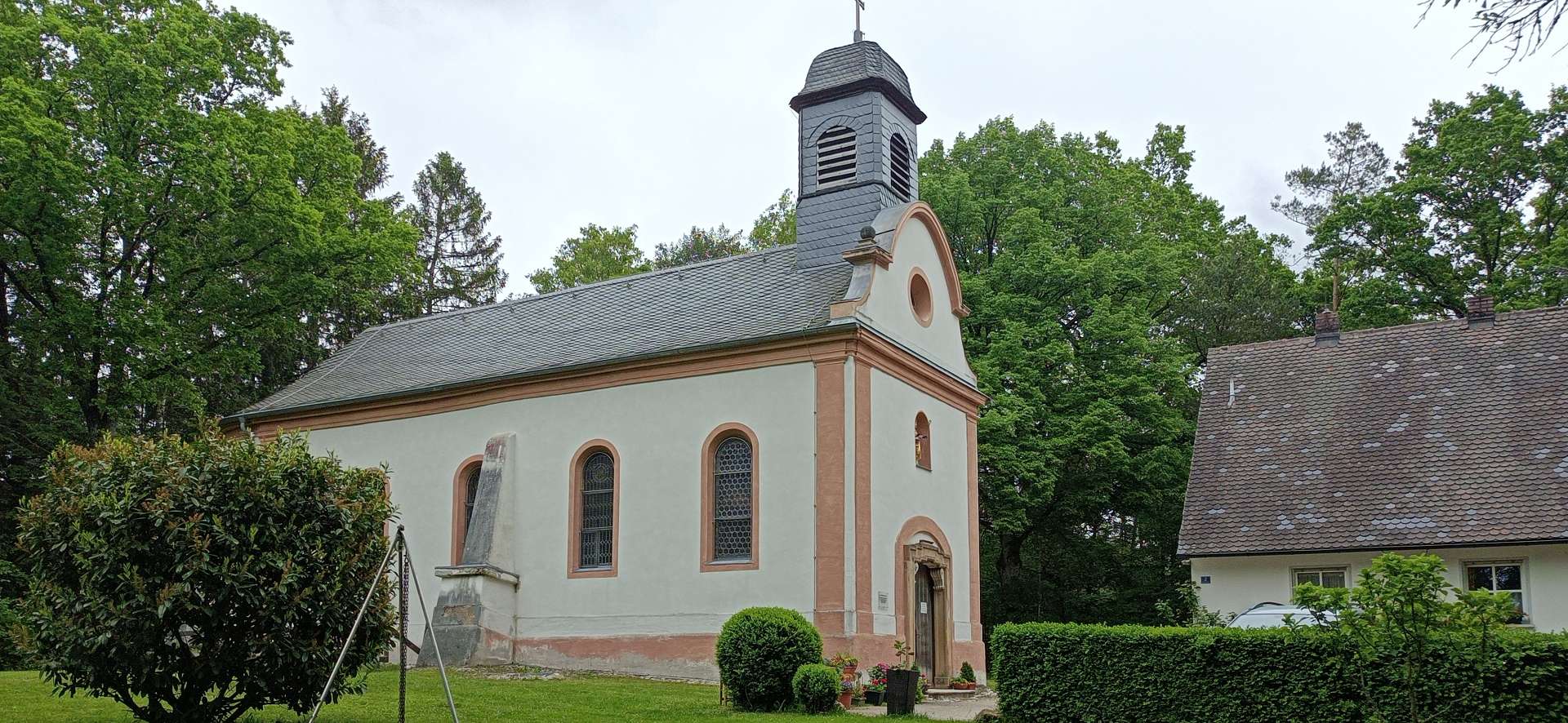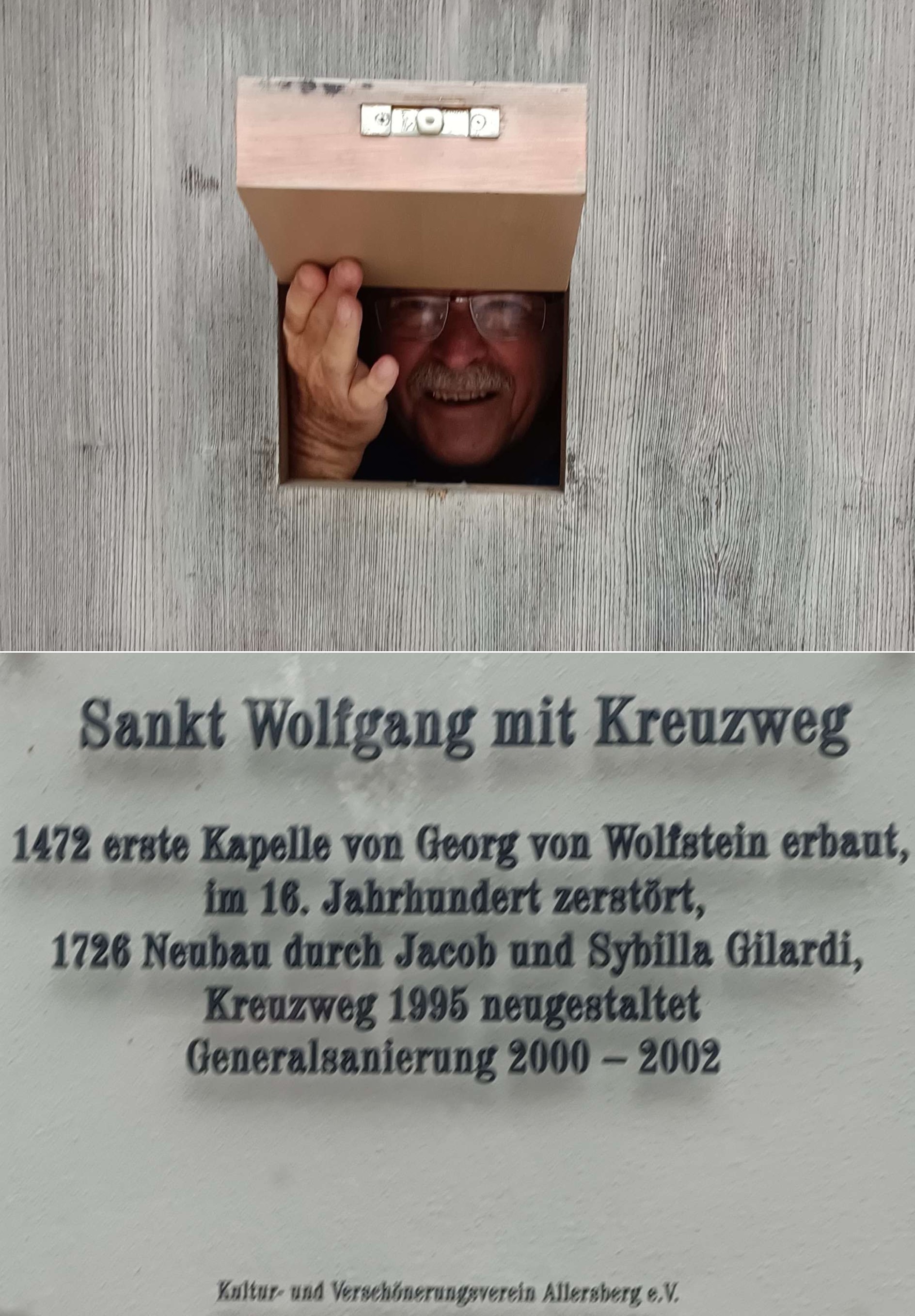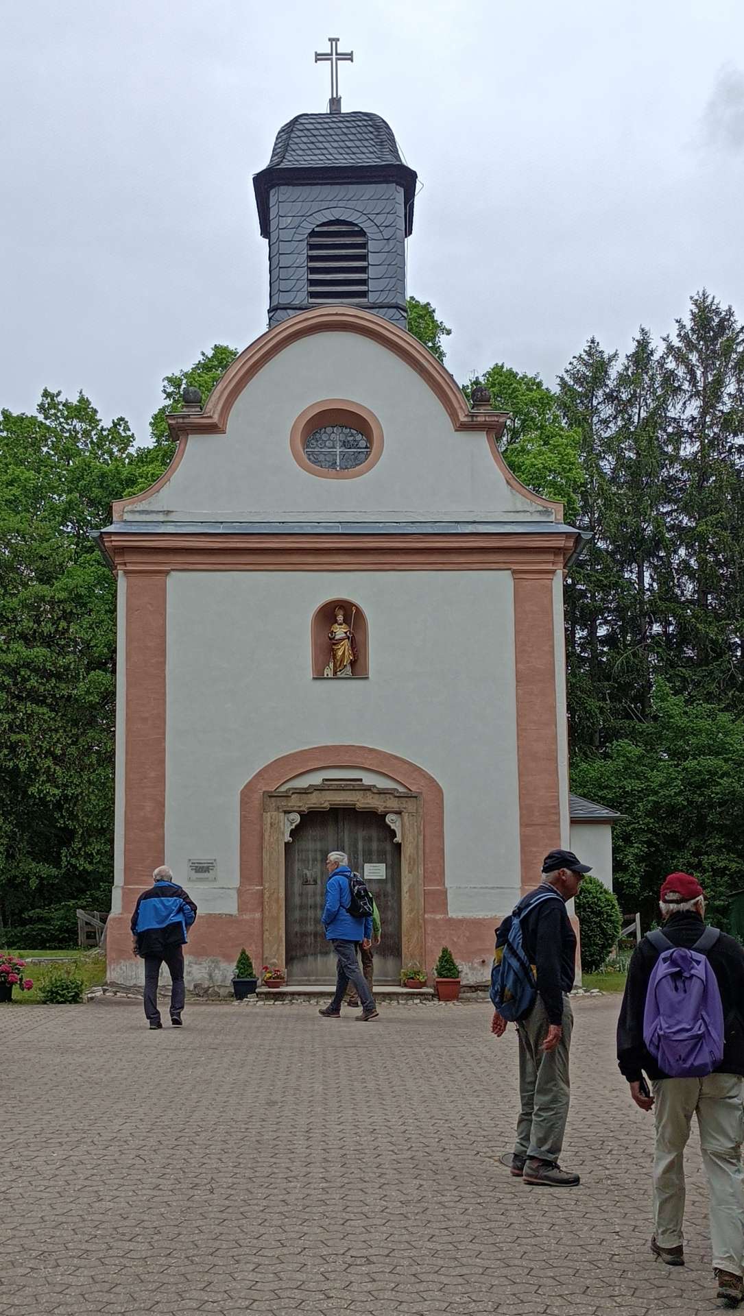 Henry und Achim stießen in Nürnberg, mit der S1 aus Erlangen kommend, in der leeren S5 auf die beiden Mannie‘s und Karsten, die in Erlangen Hbf in einen RE eingestiegen waren. Ohne Verspätung erreichten wir den Hbf-Allersberg, der allerdings Bahnhof Rothsee heißt und außerhalb von Allersberg, bei Altenfelden, lliegt. Von dort ging es über weite Fluren in das Dickicht der Allersberger Wälder, die auch „Allersberger Dschungel“ genannt werden. Die Sonne schien anfangs nicht, aber es war hell und freundlich, bei angenehmen Temperaturen. Die Truppe schritt frohgelaunt durch den Forst, Karsten verzierte Achims Rücken mit Klettpflanzen, was Achim garnicht bemerkte, ihn aber zierte. Bald kamen wir zu einer kleinen trockenen Quellschlucht, unterhalb der darauffolgenden St. Wolfgang-Kirche mitten im Wald. Auf dem Vorplatz stand ein großes Holzkreuz mit dem Gekreuzigten, der leidgeplagt auf uns herabschaute. Die