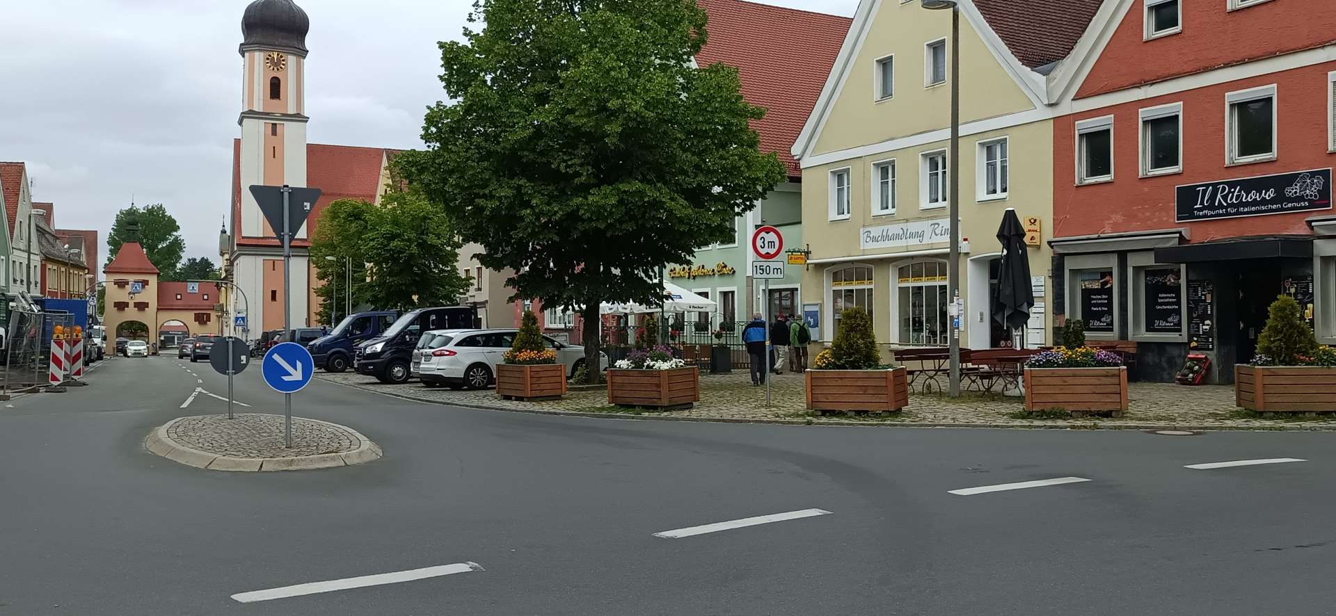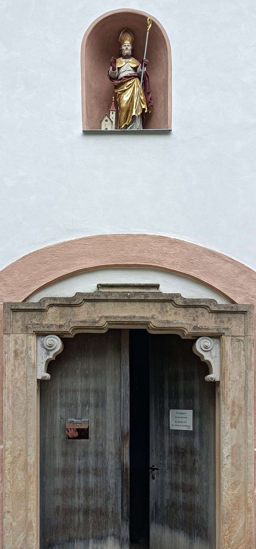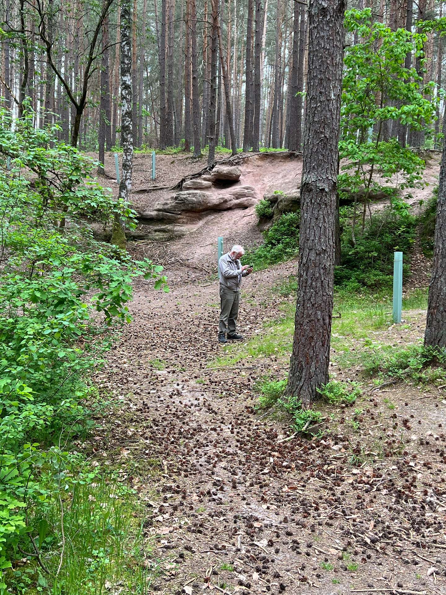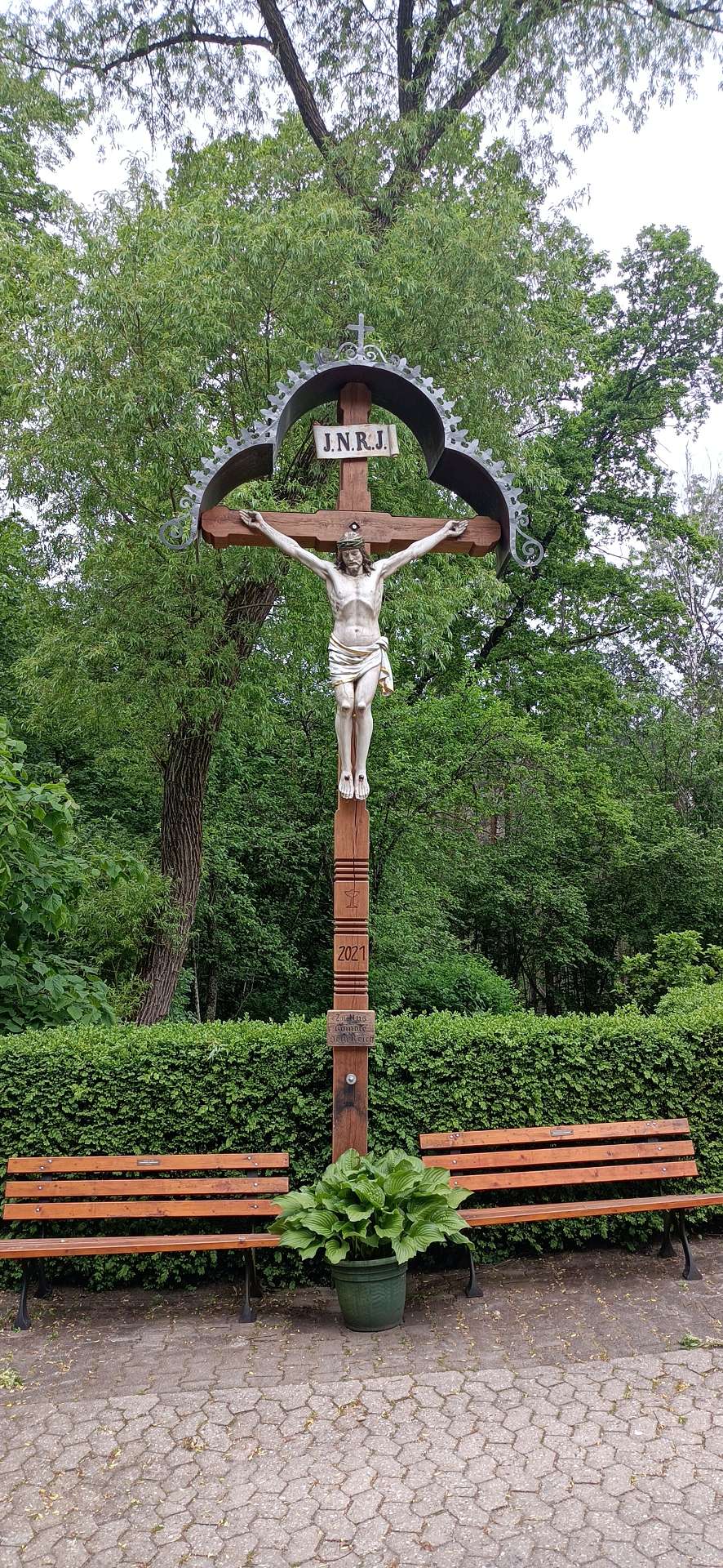 Henry und Achim stießen in Nürnberg, mit der S1 aus Erlangen kommend, in der leeren S5 auf die beiden Mannie‘s und Karsten, die in Erlangen Hbf in einen RE eingestiegen waren. Ohne Verspätung erreichten wir den Hbf-Allersberg, der allerdings Bahnhof Rothsee heißt und außerhalb von Allersberg, bei Altenfelden, lliegt. Von dort ging es über weite Fluren in das Dickicht der Allersberger Wälder, die auch „Allersberger Dschungel“ genannt werden. Die Sonne schien anfangs nicht, aber es war hell und freundlich, bei angenehmen Temperaturen. Die Truppe schritt frohgelaunt durch den Forst, Karsten verzierte Achims Rücken mit Klettpflanzen, was Achim garnicht bemerkte, ihn aber zierte. Bald kamen wir zu einer kleinen trockenen Quellschlucht, unterhalb der darauffolgenden St. Wolfgang-Kirche mitten im Wald. Auf dem Vorplatz stand ein großes Holzkreuz mit dem Gekreuzigten, der leidgeplagt auf uns herabschaute. Die