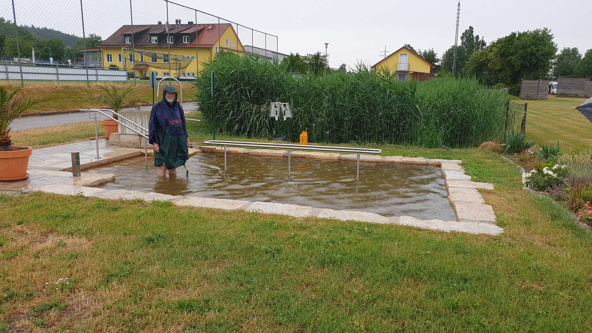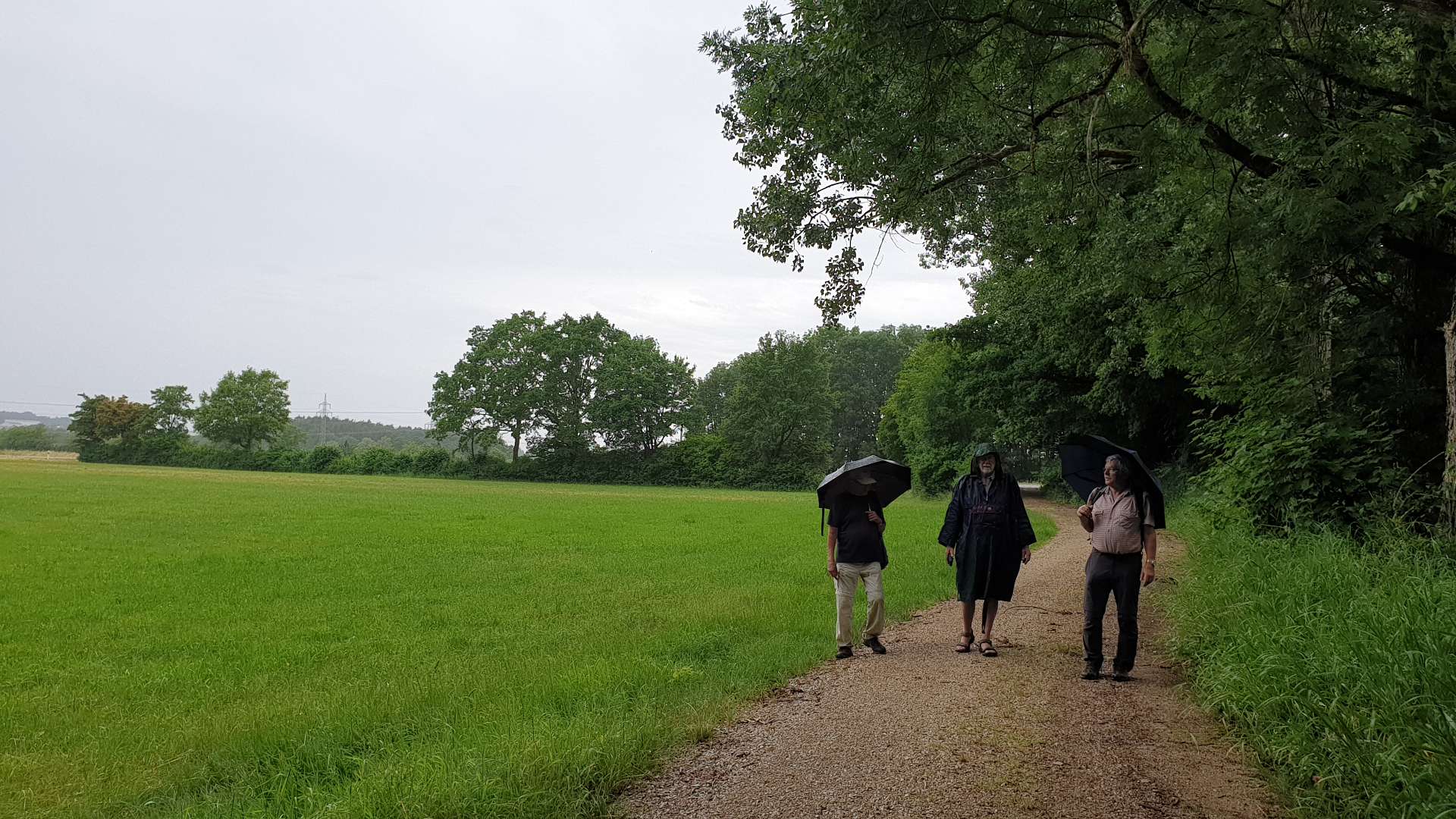 bewundern. Dafür erfreuten wir uns an den schönen Wegen und dem kühlen grünen Wald, den wir teilweise sogar pfadlos durchquerten (auch nop ist nicht perfekt) und der an dem heißen Sommertag für eine angenehme Temperatur sorgte. Die Wege waren immer wieder gesäumt von großflächigen Heidelbeerwiesen, die interessanterweise nicht abgeerntet waren. Teilweise wuchsen sie an den leichten Hohlwegen in Brusthöhe, so dass wir uns beim Pflücken nicht einmal bücken mussten, und der Fuchs(Bandwurm) hatte auch keine Chance, sich in dieser Höhe aufzuhalten. Vor Dillberg mussten wir dann doch ein Stück in der Sonne laufen und Henry gab zum ersten Mal in der Geschichte der Sockenqualmer den Spitzenplatz ab - die Umgebungstemperaturen erreichten nämlich deutlich mehr als 23 °C. Von Dillberg ging es dann abwärts - wofür wir alle sehr dankbar waren - nach Buch, ins Gasthaus Goldene Krone (09188 871). Hier wurden wir, wie immer, hervorragend bewirtet. Doch ... während wir auf unsere Speisen warteten zogen dunkle Wolken auf und wir mussten den schönen grünen Biergarten verlassen. Tatsächlich setzte dann gleich der Regen ein. Die vergebliche Wartezeit auf ein Ende des Regens versüßte uns der Wirt mit einem Congnac, doch richtig trösten konnte uns das nicht, denn irgendwann mussten wir dann doch raus in den Dauerregen. So ging es dann mit Schirm,