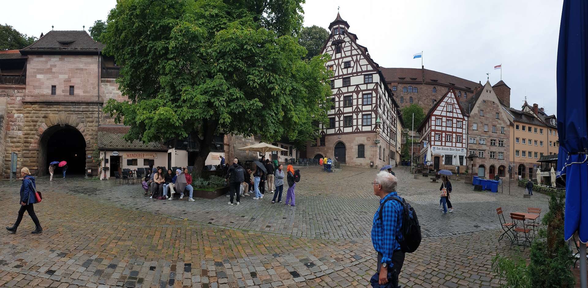 Heute hat (wieder einmal) Petrus Zeitplan, Start und Ziel unserer Wanderung mitbestimmt! Wg. des ab Mittag vorhergesagten Regens wollten wir früh einkehren und sicherheitshalber nahe von Unterstellmöglichkeiten laufen. Nachdem wir schon länger nicht in Nbg waren, haben wir uns für eine Strecke mit möglichst vielen kleinen Parks und Straßen mit Bäumen und kleinen Grünanlagen entschieden. Burggebiet, Sebalduskirche, Hauptmarkt und Lorenzkirche gehören selbstredend immer dazu. Obwohl wir immer wieder mal etwas von unserer (roten) Planroute abgewichen sind, haben wir einige, uns unbekannte, Kleinode entdeckt - wie z.B. den Archivpark mit einem alten Hexenhäuschen. Da lohnt es sich, bei schönem Wetter, noch einmal im nebenan gelegenen Biergarten (bodhi) vorbeizuschauen. Nachdem es viel zu sehen gab, reichte die Zeit lediglich für einen Rundgang in der Sebalduskirche. Außerdem wurde am Weg zwischen Heusteg/ Schuldturm und Lorenzkirche der Regen stärker, die Zeit passte auch und so entschieden wir uns für den direkten Weg (ohne Lorenzkirche) ins Gasthaus: unser passives Gründungsmitglied Peter hatte das O.sha in der Jakobstr. empfohlen - und genau das Richtige für unseren Geschmack, auch bezüglich Portionsgröße und Preisverhältnis, getroffen; Empfehlung: Mittagsmenu. Wohlgenährt gönnten wir uns