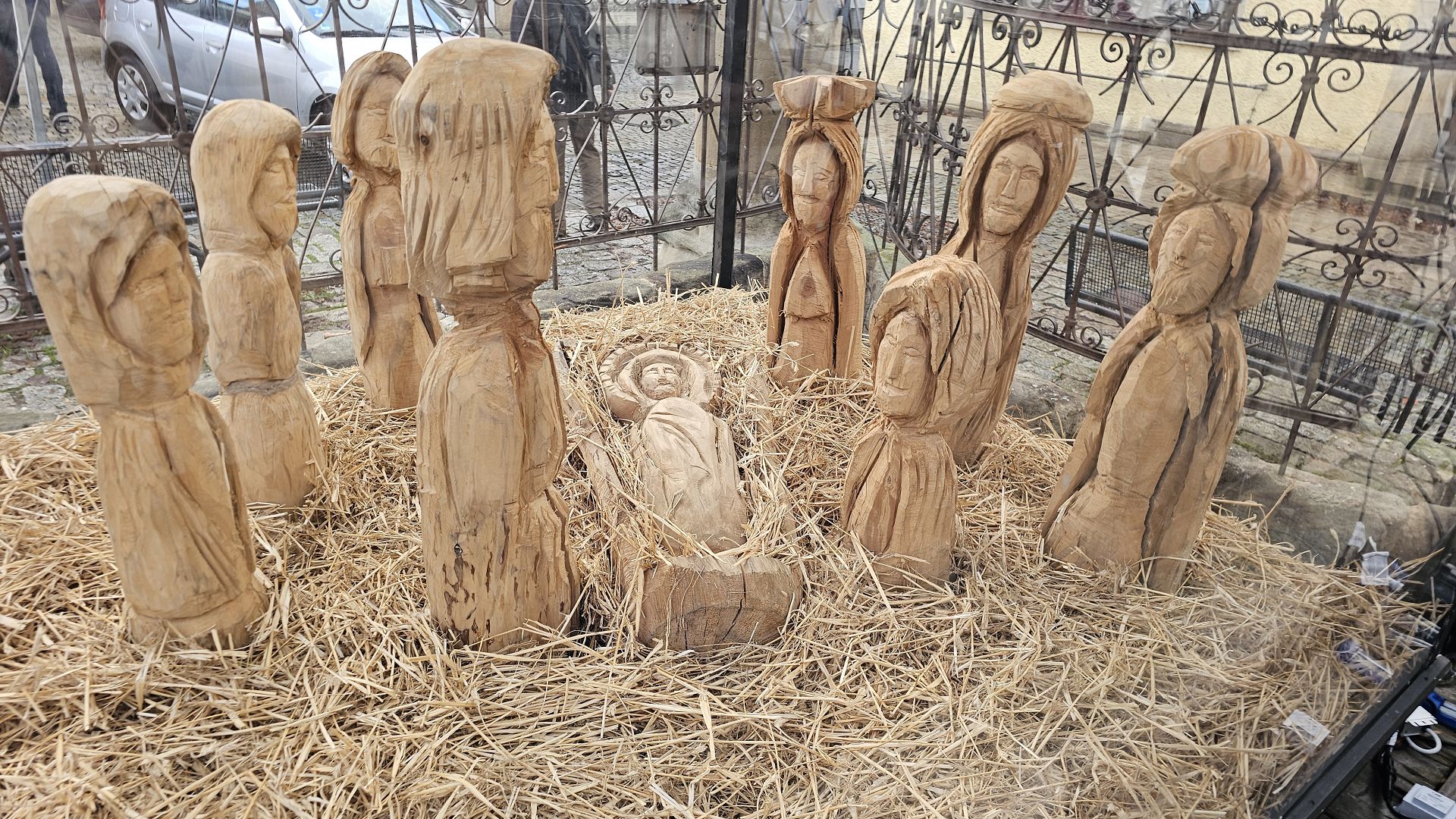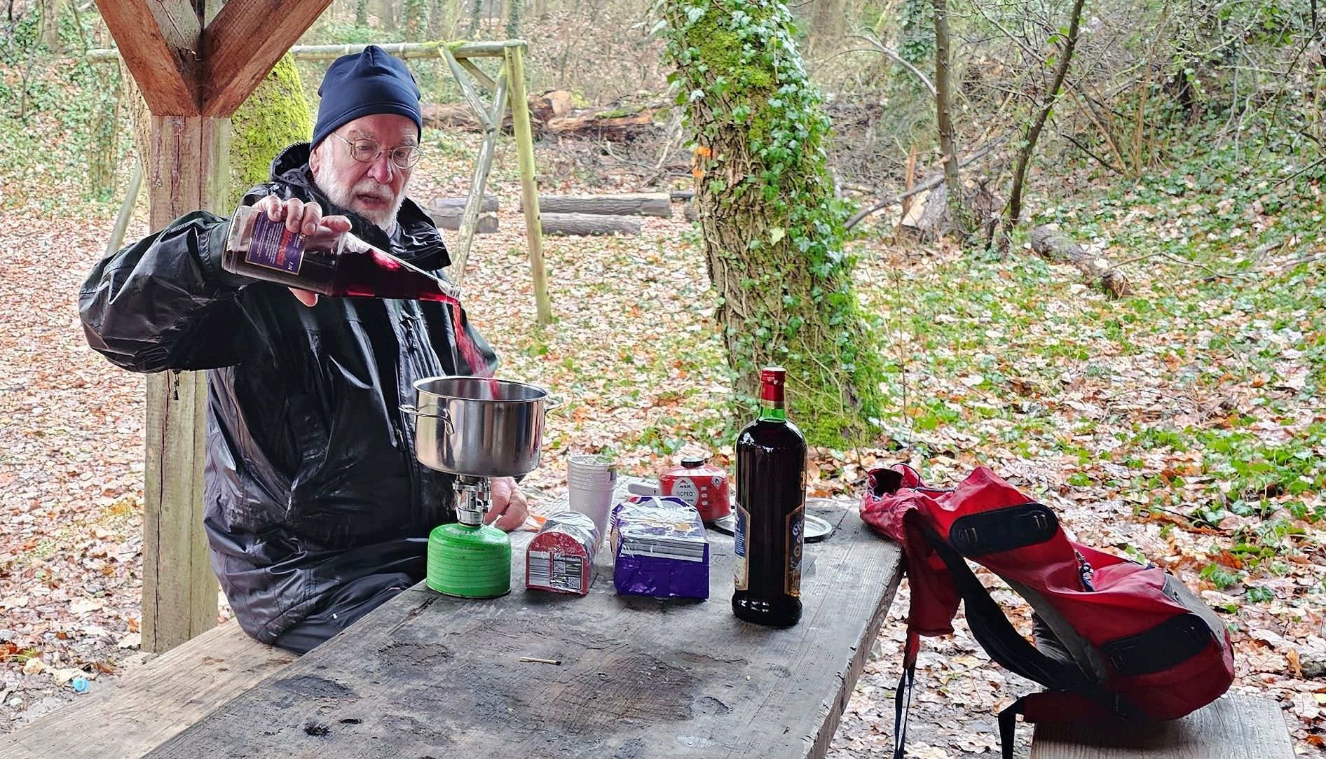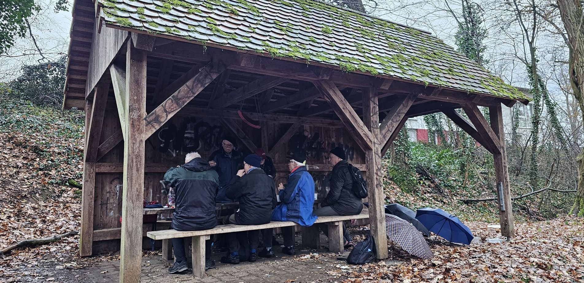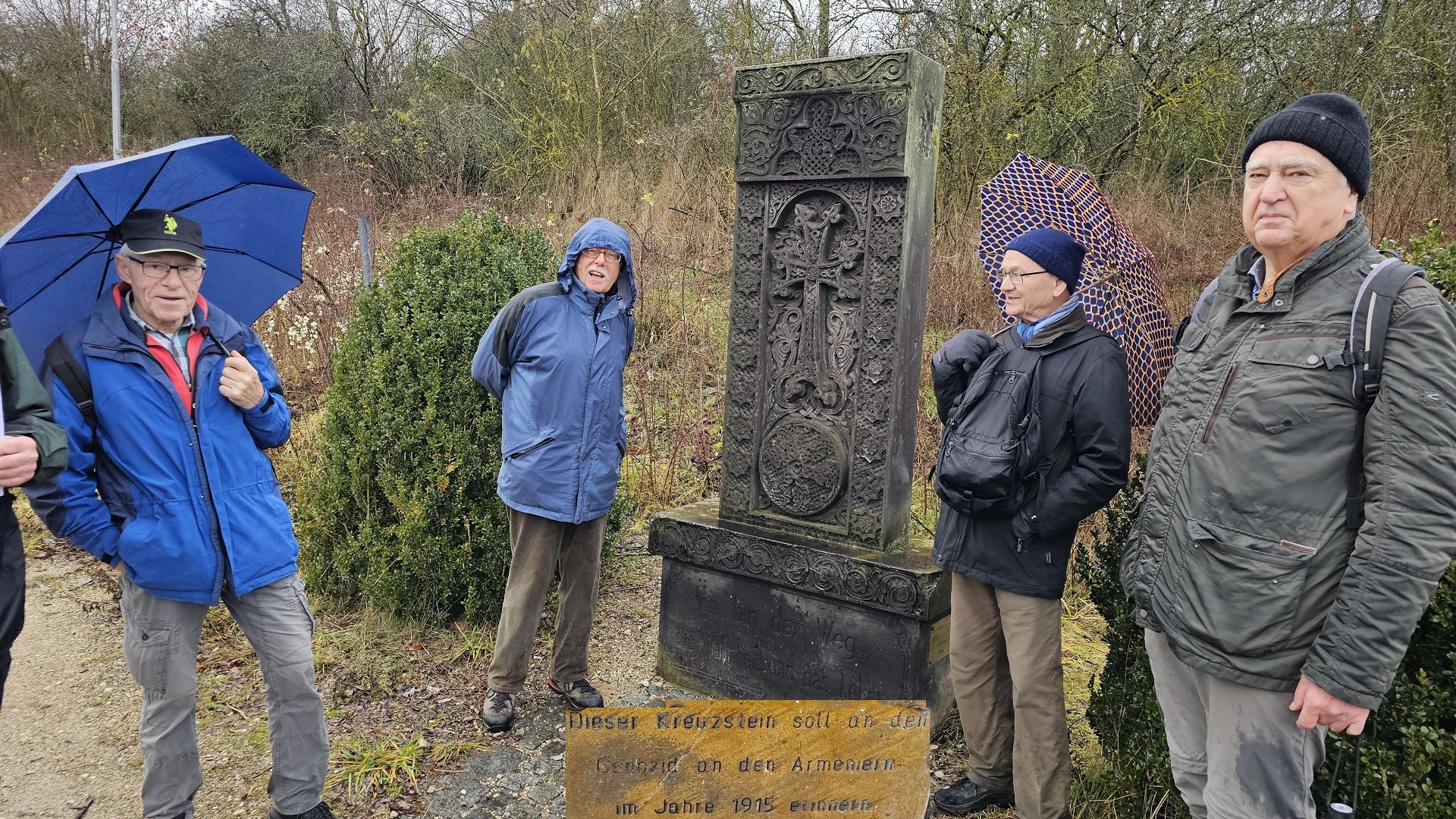 Zusätzlich zu dem von den Interessenvertretern genannten Sehenswertem hatte Karsten noch eine weitere interessante Rarität in petto: ein Chatschkar, ein künstlerisch gestaltetes armenisches Gedächtnis-Monument, ähnlich unseren Marterln. Und er hatte noch eine zweite Überraschung vorbereitet: Zu einem schönen Ritual ist seine jährliche Glühweinzubereitung zu einer unserer Krippenwanderungen geworden. Fast wäre die Prozedur im wahrsten Wortsinn ins Wasser gefallen, regnete es doch schon leicht aber beständig, seit wir den Engelgarten verlassen hatten. Doch Gott seis gedankt, entdeckten wir in einem kleinen Park vor der Jakobuskirche einen Unterstand mit Tisch und Bänken, der wie für uns geschaffen war. So konnten wir uns rechtzeitig, vor dem Besuch der christlichen Anbetungsstätten, in den Zustand versetzen, der es schon frühen menschlichen Kulturen ermöglichte, die transzendente Verbindung von Körper, Geist und Seele zu verstehen. Natürlich alles im Rahmen, denn übermäßiger Weingenuss führt, lt. Epheser 5,18, zu zügellosem Verhalten - und so weit wollen wir es nicht kommen lassen - jedenfalls nicht am hellichten Tag 😉. Resümee: Ein schöner Weg, um