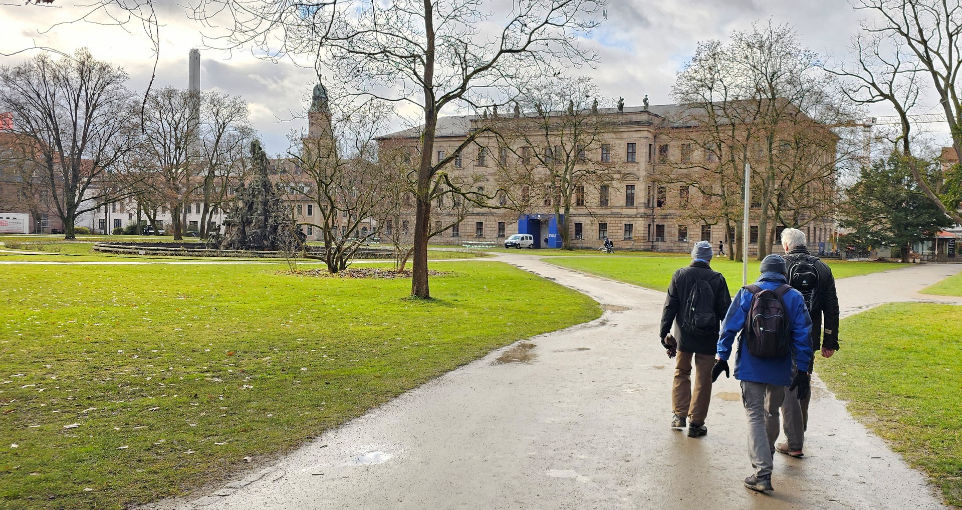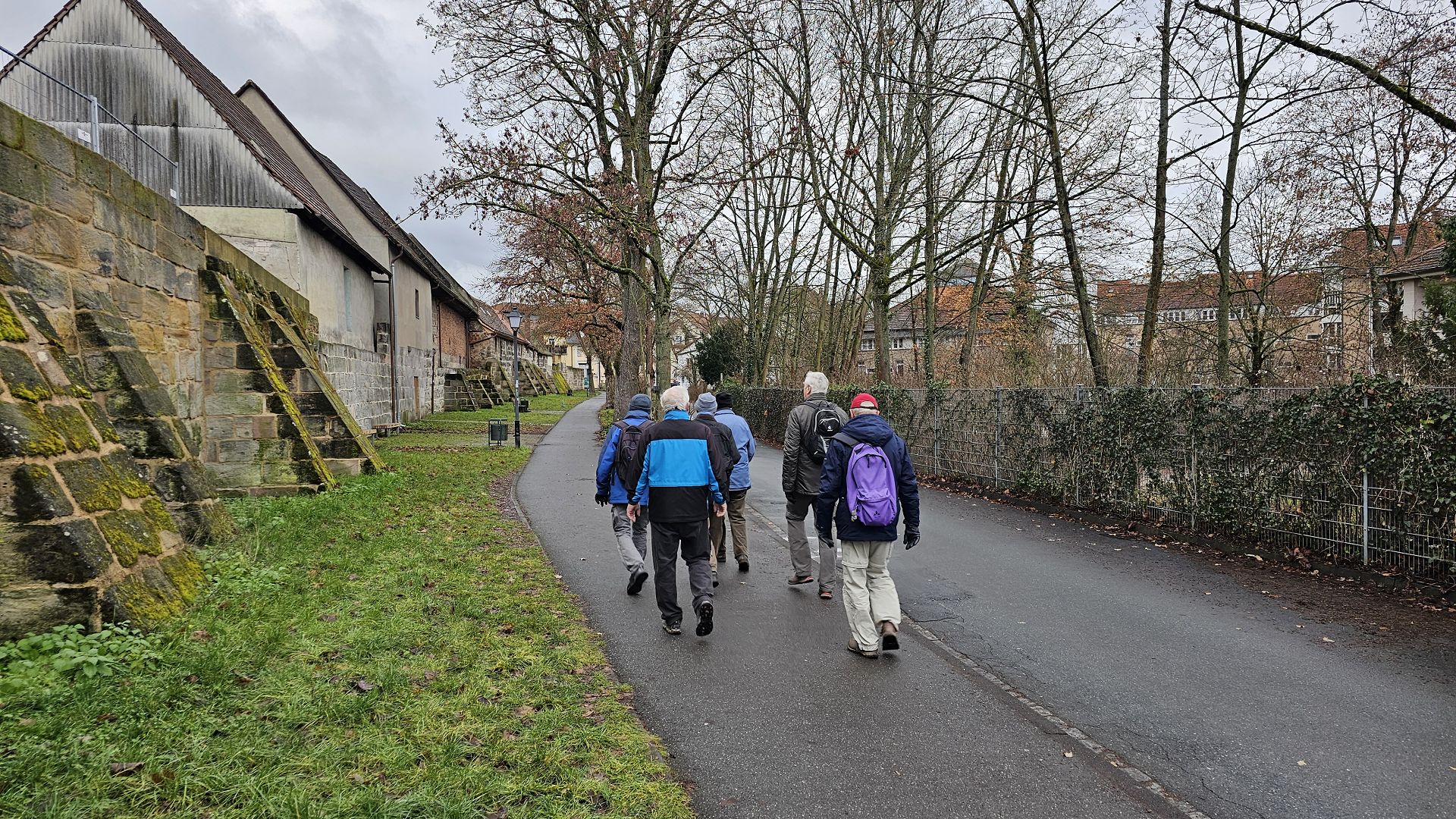 zum gemütlichen Weihnachtsbummel." Einen gemütlichen Weihnachtbummel (und ein paar Gläschen Rolfi-(Gott hab ihn seelig)-Gedächtnis-Glühwein wollten wir uns in der Tat gönnen. Allerdings nicht, ohne vorher ein paar km zu laufen. Wir starteten in Buckenhof bei nasskaltem Wetter und liefen, so lange es ging, an der Schwabach entlang, bis zu Kopfklinik. Schade, dass der Weg an der Schwabach nicht durgängig ist; eigentlich sollte in der Radlerstadt, als die sich Erlangen ja gern ausgibt, sogar ein durchgehender Radweg vorhanden sein! Besonders ärgerlich ist der Übergang an der Sieglitzhofer Strasse. Obwohl der Weg gern und viel genutzt wird, kommt niemand auf den Gedanken, den Weg und vor allem den unfallträchtigen "Aufstieg" für die Allgemeinheit nutzbar zu gestalten! An der Kopfklinik verließen wir die Schwabach und liefen durch ein par verwinkelte enge Gässchen, die nicht jeder kennt, zum Steinbach-Bräu. Dann war es Roland ein Anliegen, uns durch die Nördliche Stadtmauerstraße zu führen und ein wenig Hintergrundwissen über den langen Weg, den die Stadtplaner (hauptsächlich betroffen: die Stadtkasse) zurückgelegt haben, bis die Strasse endlich so aussah, wie sie jetzt aussieht. Edgar hatte sogar seinen Garten geopfert um eine Bebauung zu ermöglichen (Scherz). Dann ging es zum