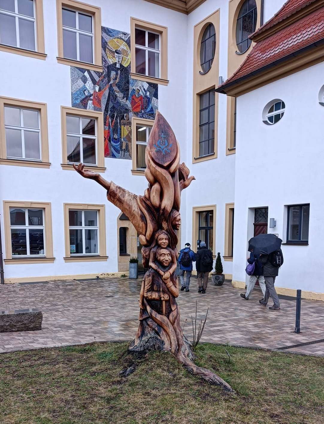 möglich ins Trockene! Udo hat dann vorsichtshalber noch einen Nachtisch spendiert; denn ein altes Sprichwort sagt, man sollte niemals unterzuckert in einen Süßwaren-outlet gehen - und genau das hatten wir nämlich vor. Trotzdem waren alle Rucksäcke prall gefüllt, als wir uns auf den Weg nach Gremsdorf machten. Auch hier nahmen wir, mangels Motivation durch unseren Stern, den kürzesten Weg. Allerdings gönnten wir uns den kleinen Schlenker durch das Gelände des Klosters, das wir alle noch nicht kannten. Es hat sich gelohnt. Wir trafen auf eine freundliche Schwester, die uns etwas über die Einrichtung erzählte und sogar eine kleine Führung für uns machte - vielen Dank. So kamen wir auch ins Innere der Gebäude. Viel Zeit hatten wir allerdings nicht, denn der Bus zurück nach Erlangen war bereits angekündigt. Und - Gottseidank - auch ein Bus nach Adelsdorf kam fast gleichzeitig, so dass Karsten seinen Fahrradschlüssel holen konnte - den er dann im Auto nach Gremsdorf brachte ☻ Anzumerken ist noch: Udo hatte sein Auto in Karstens Garage abgestellt. Dazu musste er den Edeka-Parkplatz überqueren. Der Verwalter schickte daraufhin eine Rechnung für die Zeit zwischen Ein- und Ausfahrt ☹ (die dann aber, nach einigem hin und her, nicht bezahlt werden musste). |