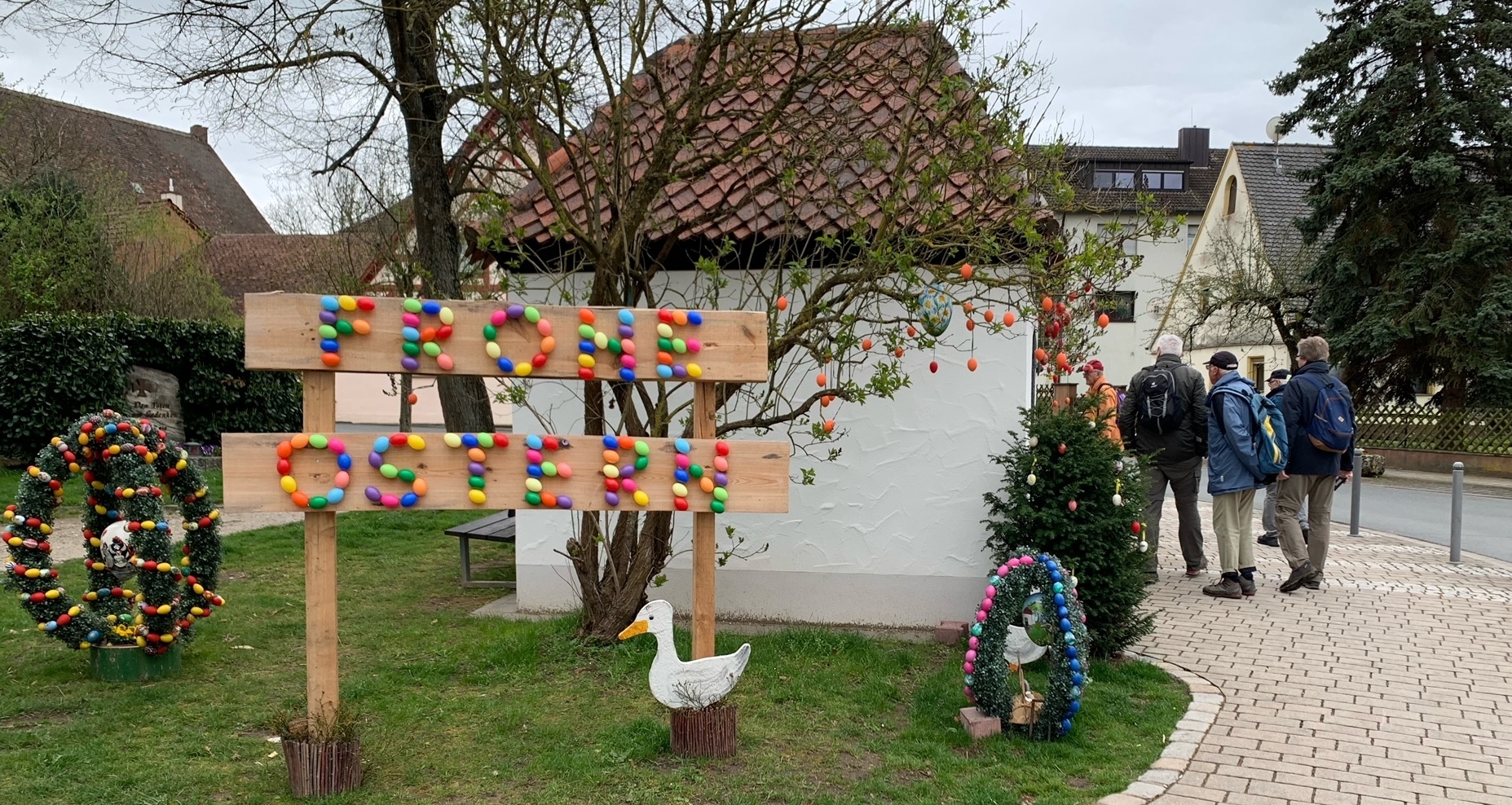 beworbene Osterfamilie in Hauptendorf. Über das Gasthaus schweige ich mich heute aus. Wir freuen uns ja über jedes, das noch geöffnet hat. Aber offensichtlich zeigt die Nähe gut bezahlter Arbeitskräfte aus Herzogenaurach Wirkung. Jedenfalls bezüglich Preisgestaltung. Die Würze der Speisen passt dagegen mehr zur offensichtlichen ideologischen Gesinnung (Definition nach Karl Marx) des Wirtes: eher schal. Beim nächsten mal gehen wir zur Ayle. Sehr zufrieden waren wir dagegen wieder beim Carlo in Herzogenaurach, den wir nach ca. einer Stunde Marsch über Felder, am Schleifmühbach entlang, an den Schefflerwerken vorbei und wieder ein paar Meter an der Mittleren Aurach entlang, erreichten. Zurück ging es dann wieder ab "An der Schütt" mit dem 201er ff nach Erlangen. |