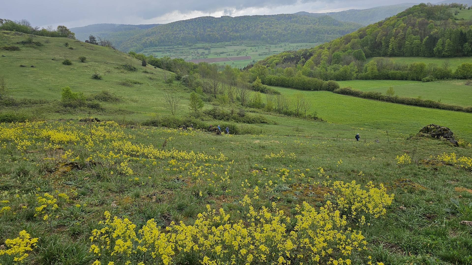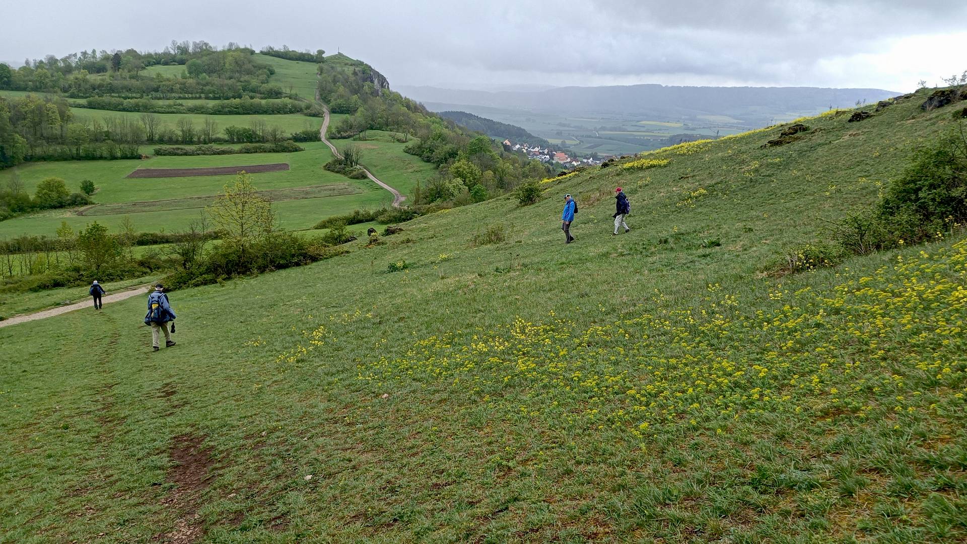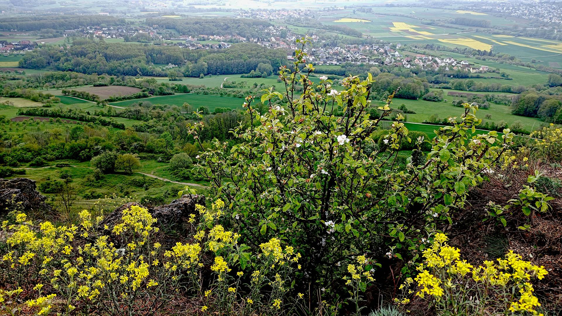 "Vor-Greta-Zeit". Jedoch: Kein Sonnenschein - sondern Nieselregen, und keine Blütenpracht - sondern "Stadium 4 - die Blüten fallen ab"! So blieb uns nichts als die teils doch schöne Aussicht vom Walberla (oder Walberle), trotz wolkenverhangenem Himmel und die Hoffnung, dass "Stadium 5 - die Ernte", nicht auch noch verregnet. Wir starten in