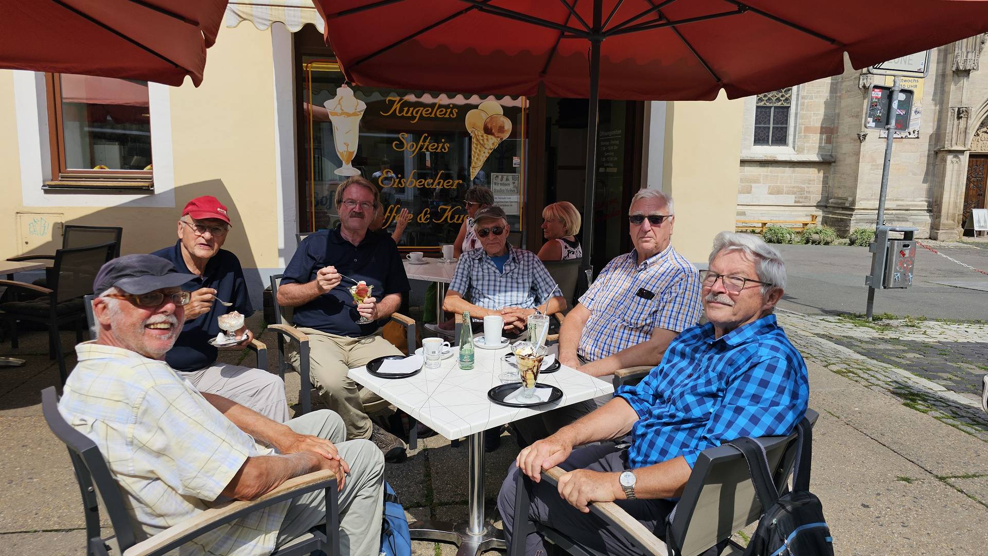 Devons und Karbons im Saxothuringikum.☻) Nach der Mittagsrast ging es dann, immer an der Saale entlang, direkt zu Sarotti und Co. Obwohl wir alle gut gesättigt waren, war die Probierschale fast leer und die Rucksäcke sehr voll, als wir den Werksverkauf verließen 🙂! Etwas müde machten wir uns nun an das letzte Stück Weg. Er führte uns wieder an der Saale entlang und über einen Spielplatz-Park in die Stadt. Der Hirsch, die Probierschale und die Sonne zeigten Wirkung: nur mürrisch folgte der Troß dem Führer von Tor zu Tor, bis sich am Marktplatz die Stimmung endlich wieder besserte: ein Eiscafe war in Sicht! Nach einer weiteren genüsslichen Pause folgte noch der Besuch der Johanneskirche (benannt nach Johannes dem Täufer) und ein kurzes Stück des geplanten Rundganges (interaktiver Stadtrundgang) zum Blankenburger-, Darr- und Saaltor. Das Loch und die ehemalige Stadtapotheke haben wir nicht gefunden (und es fehlte der Elan zu suchen) - aber wir wollen ja wieder kommen. Am Heimweg im Zug wurde nach langer Zeit wieder einmal Skat gespielt. Ein vorsichtiges Abtasten in einer neuen Runde mit Roland ... mit Lust auf mehr. |