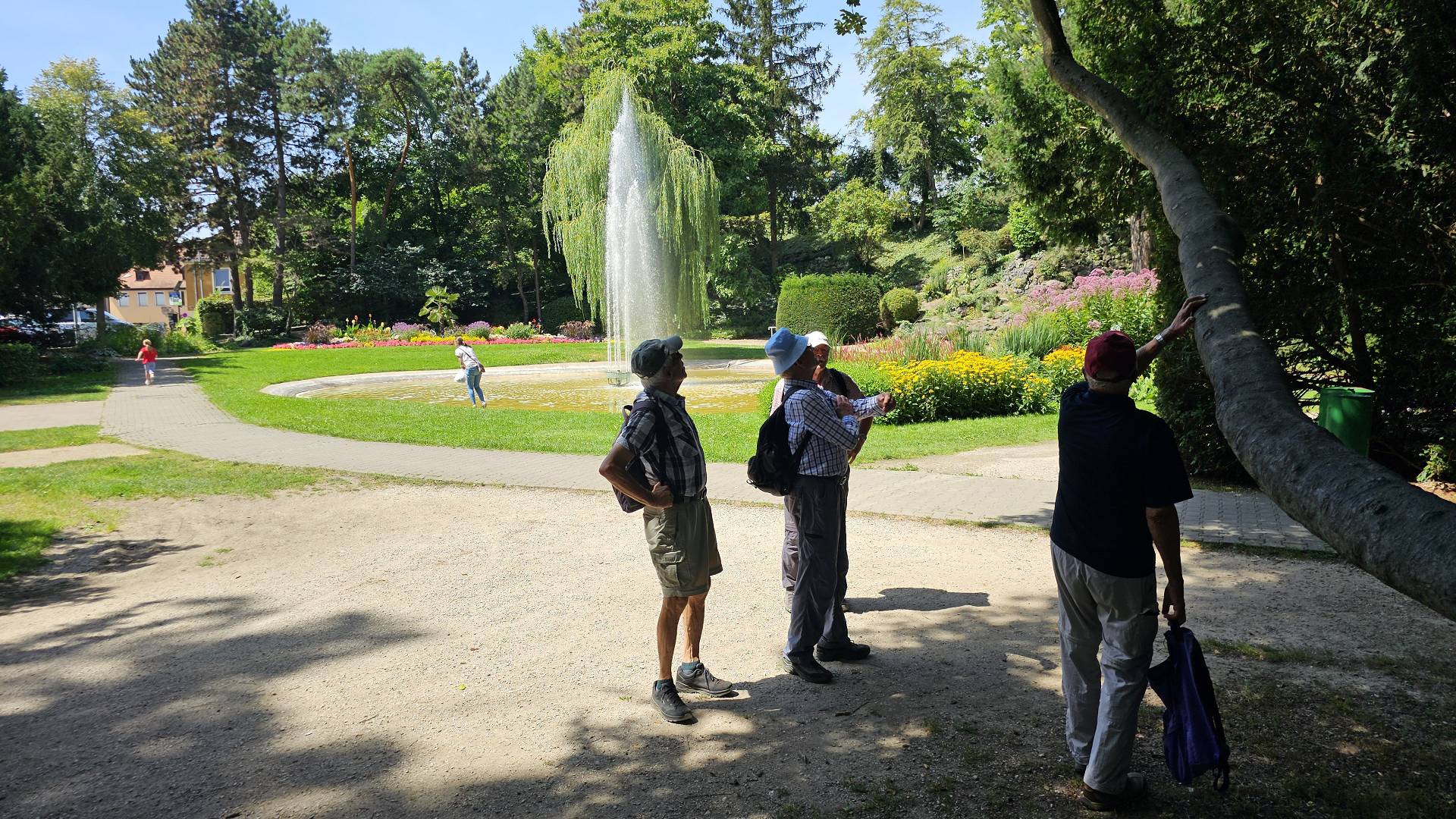 die Innenstadt. Wir liefen über die Piastenbrücke, auf der einige ein paar Tränchen vergossen, weil es den Werksverkauf nicht mehr gibt, passenderweise dann über den Friedhof (an der Birkenfelderstr.) und dann durch den Stadtpark mit seinem Springbrunnen und den schönen alten Bäumen. Nach ein paar 100 m durch die Hauptstr., vorbei am Rathaus, nahmen wir dann durch die Apothekenstr. den kürzesten Weg zu unserem "Standard-Eiscafe" Garda in der Hornschuch-Allee: und der Wirt bekommt wieder ein ausdrückliches Lob für Qualität, Preisgestaltung und Freundlichkeit! Als wir gerade bezahlt