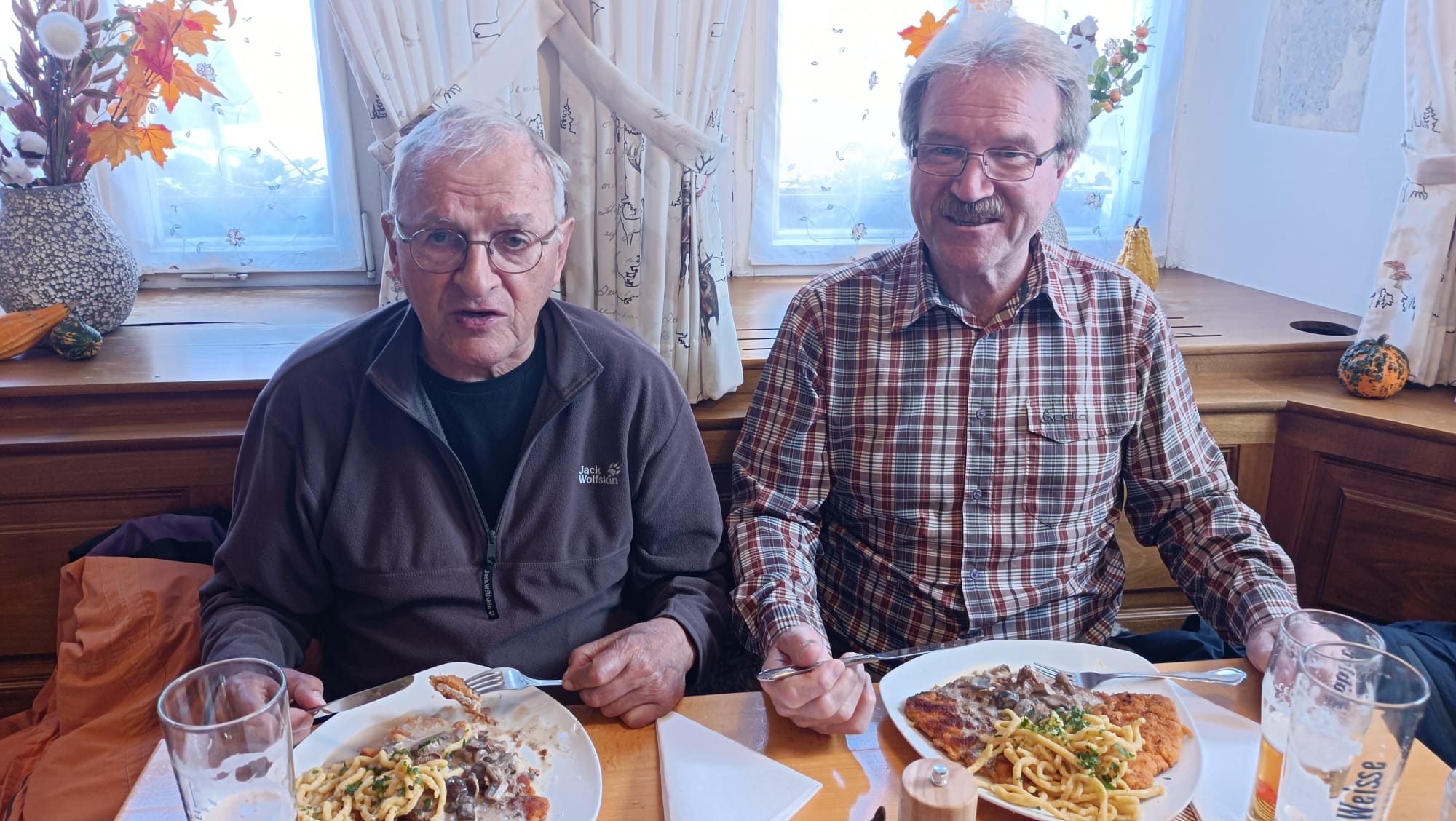 Wanderung am 23. Oktober 2024 - Wanderstrecke ca. 7,2 km, 49 Hm AchimG, Henry, Karsten, Pit, Udo Speisekarte vor Wanderkarte - Riesenschnitzel im Gasthaus Zum Hirschen |
