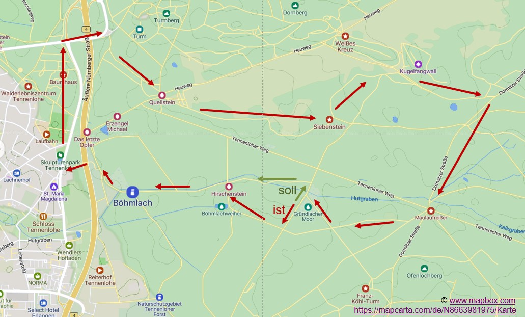 Überschrift). Dieses schöne Stück Natur haben wir sicher nicht zum letzten Mal besucht. Beim nächsten Mal ev. aus Richtung Süden kommend. Höhepunkte: Quellstein - Siebenstein - Steinernes Brücklein, Maulaufreißer, Gründlacher Moor - Hirschenstein - Hutgraben ------------------------------------------------------------------------------------------------------------------------------------------------------------ Weitere Kunstwerke, Flur- und Gedenksteine bei Tennenlohe am 20.11.2024 und 05.03.2025 und im Knoblauchsland - Bemerkenswerte Orte im