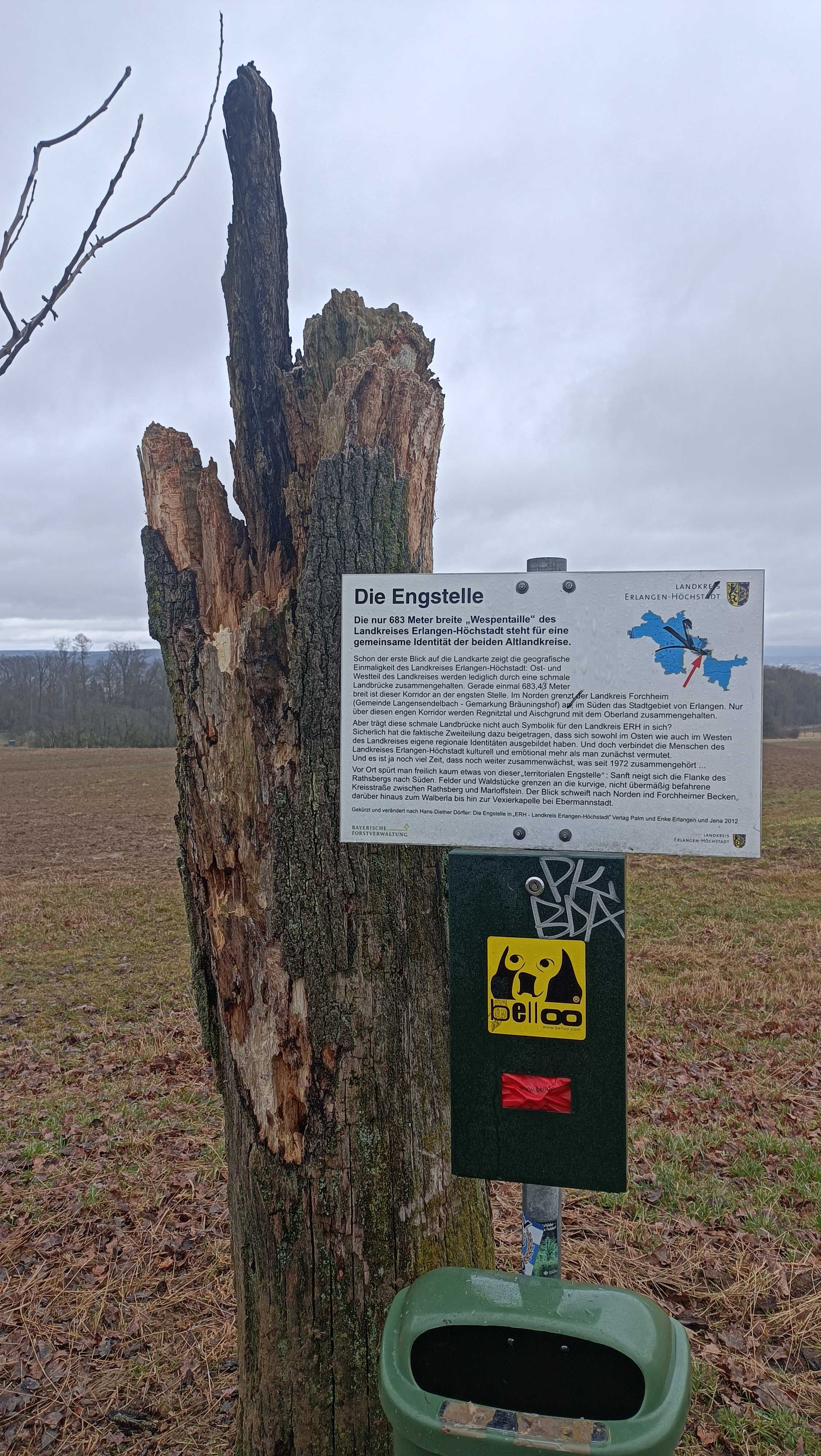 Steiermark und Mettmann. Der Weiterweg führte uns dann vor die Tore Rathsbergs. Auf halbem Wege fiel uns das Schild auf, das auf die Engstelle, die sogen. Wespentaille des Landkreises Erlangen-Höchstadt hinwies. Von dort ging es weiter bis bald wir die Rathsberger Str. kreuzten und endlich die richtige Richtung zum Lokal einschlugen. Derweil diskutierten Achim und Manfred über die Anwendung und Wirksamkeit von Pferdeäpfeln - die „zuhauf“ am Weg lagen - in Beeten, z.B. für Tomaten. Immer am Waldrand entlang, mit einem kleinen „Inwaldschlenker“, kreuzten wir die Atzelberger Str. und suchten eine Möglichkeit den Hang zu dem greifbar nahen Schloss Restaurant zu gelangen. Durch den Obstbaumgarten erreichten wir in zwei getrennten Gruppen das Lokal und wurden sofort bedient. Es wurden „Drei auf Kartoffelsalat“, Sülze, Roulade und Beilagensalat bestellt, dazu natürlich Bier. Allen hat‘s geschmeckt und die Menge war mehr als ausreichend. Nach dem Aufbruch verabschiedete sich Roland, der über seine alte Heimatstrecke, den Burgberg, nach Erlangen lief. Die Anderen folgten Udos Weg bergab nach Bubenreuth. Der Pfad war anfangs etwas „hakelig“ und ich hörte öfter die Wörter „Udo“ und „was für ein Weg“, aber das Stück war nicht so lang. Frohen Mutes und noch voller Elan durchschritten wir Bubenreut, in dem uns Pit für kurze Zeit verließ, um für seine Tochter in einem Kosmetikladen ein Geburtstagsgeschenk zu kaufen. Am