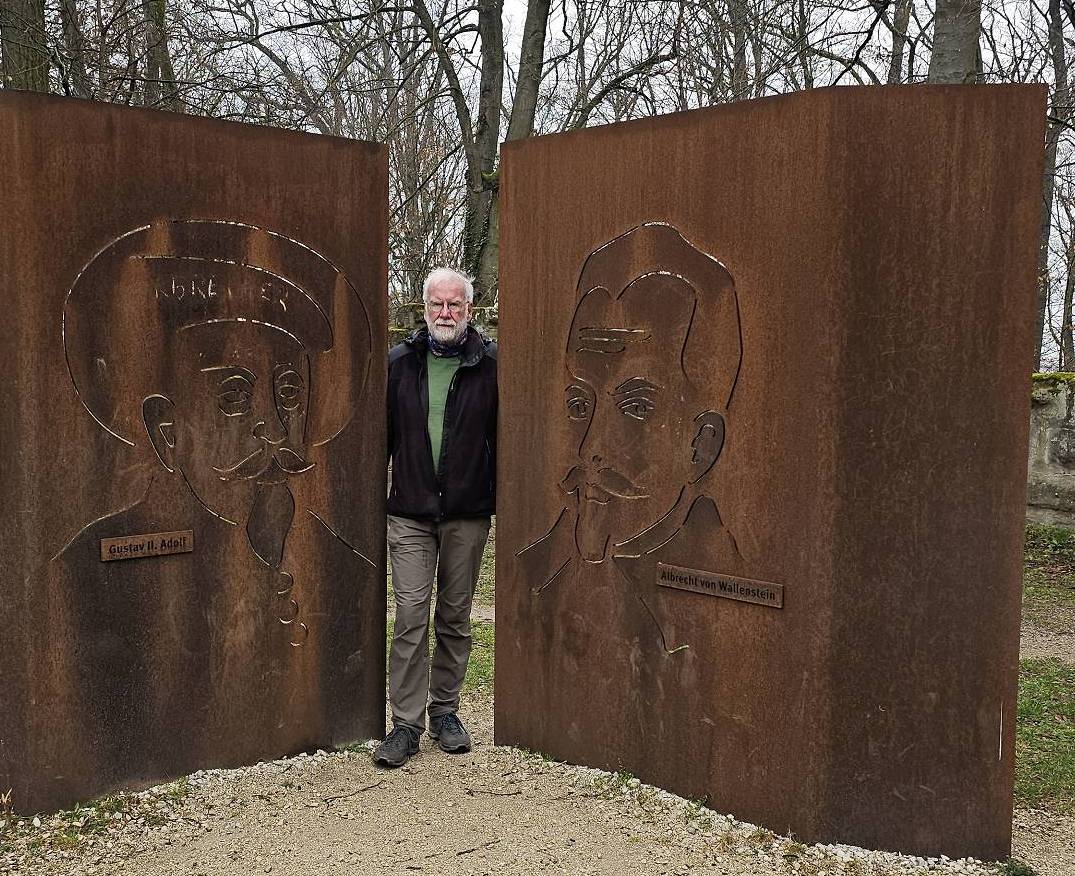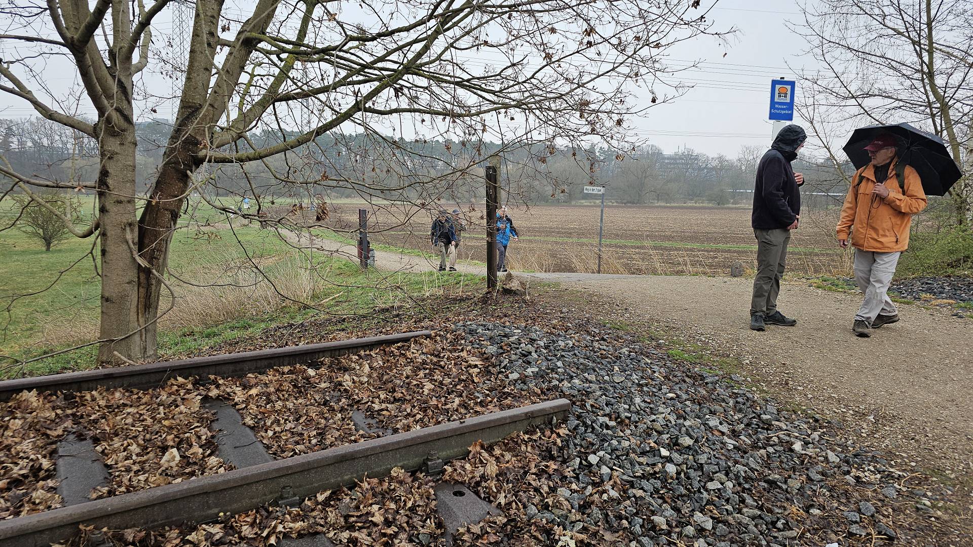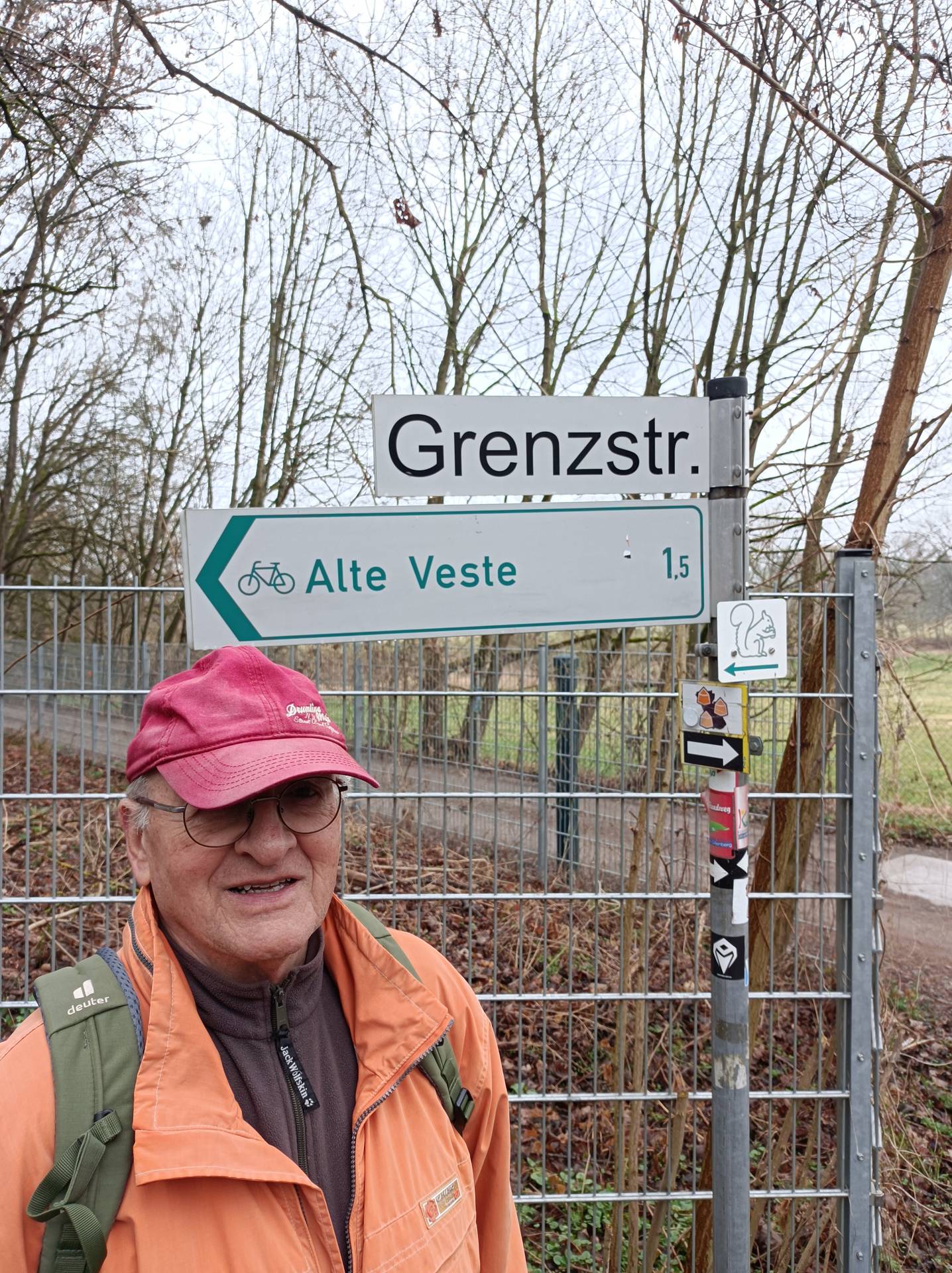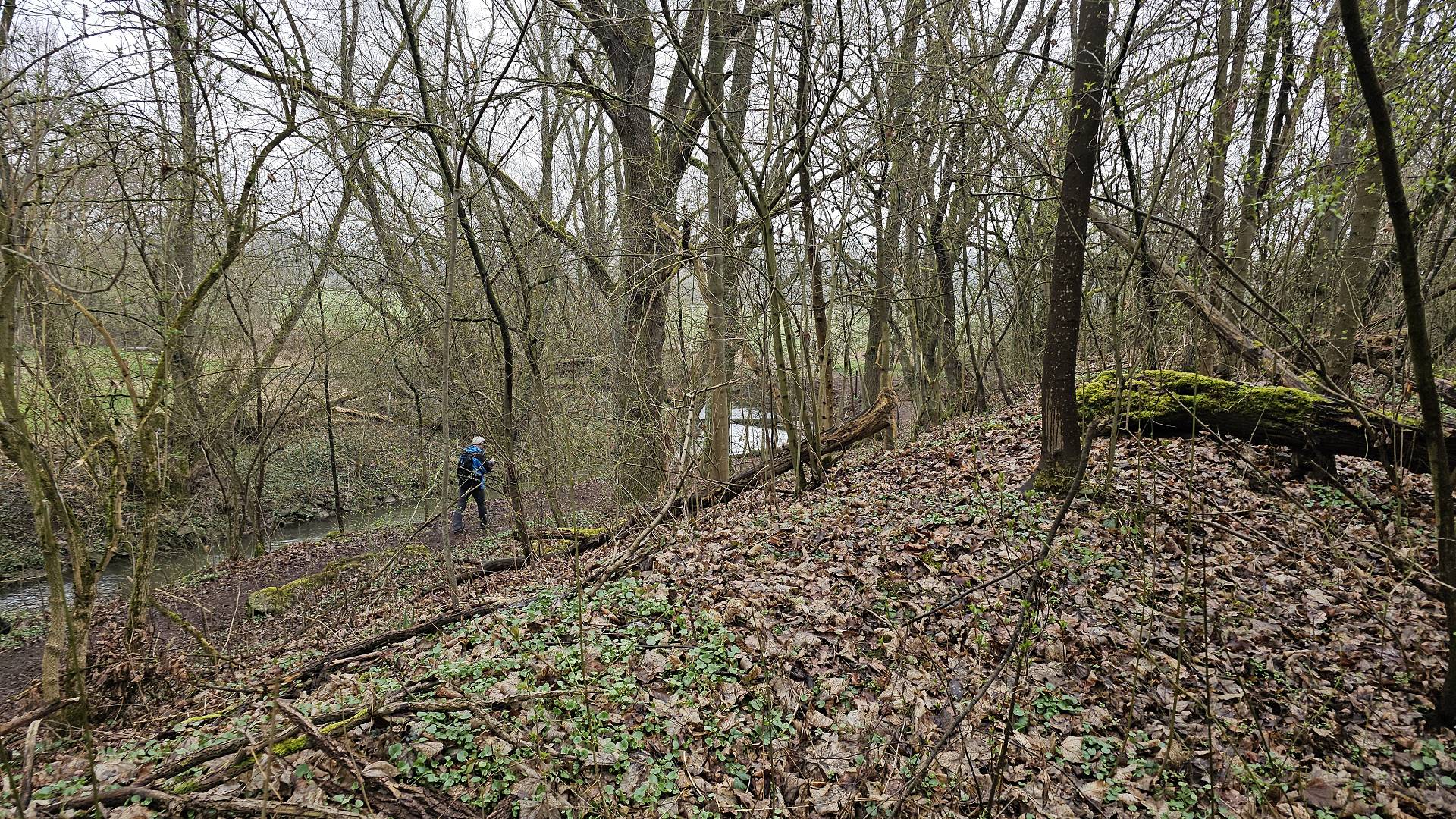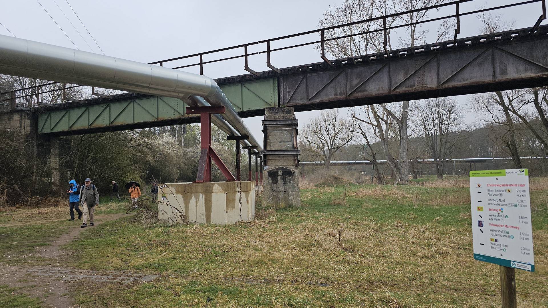 Heute war es nun so weit. Gestartet sind wir an der Bahnhaltestelle Fürth-Dambach. Nach wenigen 100 Metern Richtung Westen überquerten wir die Südwesttangente und den Main-Donau-Kanal - und waren auch schon im Grünen. Ein Stück parallel zum Dambach, dann, im Wald, am Grundigpark mit seinem langen Eternit?Asbest?zaun entlang, bis nach ca. 2 km der Vestner Turm vor uns durch die noch unbelaubten Bäume zu erkennen war. Nun ging es nach oben: Ca. 38 ziemlich steile und, nach leichtem Nieselregen, etwas rutschige Meter. Oben empfing uns eine gepflegte, nüchterne Anlage mit ein paar Informationstafeln - natürlich zu Wallenstein und Gustav Adolf, und der besagte Vestner Turm. Nach einer kurzen Pause, Karsten aktualisierte unser Geschichtswissen, ging es, auf wieder etwas rutschigen Pfaden, wieder runter, Richtung Osten. Wir durchquerten eine kleine Siedlung auf der (nicht Achim-) Grenzstraße und erreichten schnell den Rednitzgrund. Jetzt folgte ein schönes Stück Natur an der Bibert und an der alten Bibertbahn-Trasse entlang. Einige kamen richtig ins schwärmen ob der schönen Pfade in den Wiesen, der Frühlingsblütler, der Büsche mit den frischen Knospen und der von den Bibern noch stehengelassenen Bäume inmitten eines Verhaues von "gefällten" Bäumen. Das war es dann allerdings mit der schönen Natur ..., denn jetzt folgten 2 1/2 km Rothenburger- und Sigmundstraße, links und rechts Industrie und dazwischen Autos, Autos, Autos. Die schönen 6 km waren schnell vergessen und der Streckenplaner überstand dieses letzte Stück wohl nur deswegen (seelisch) unbeschadet, weil er bis zum Ziel in einem so großen Abstand vornweg marschierte, dass ihn das Stimmengewirr hinter ihm nur noch als leises Gesumse erreichte 🤣. Und dann waren wir am Ziel,