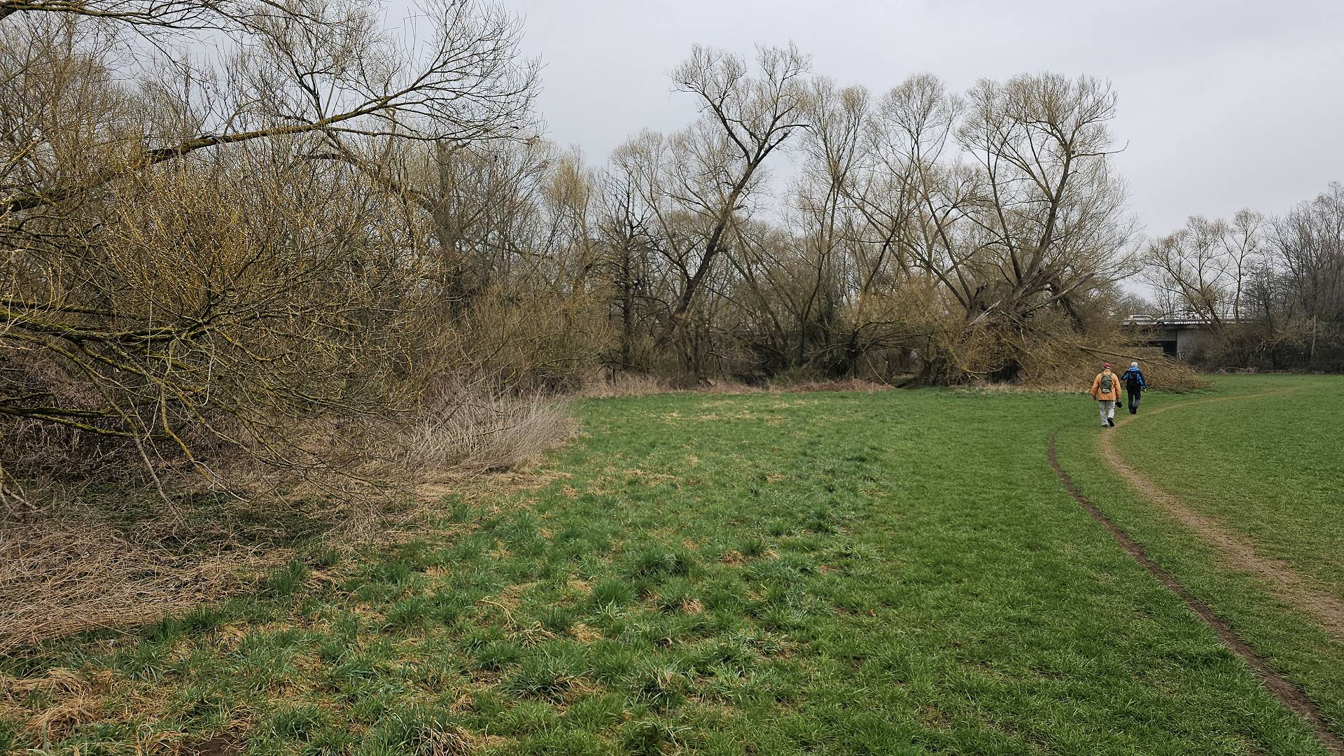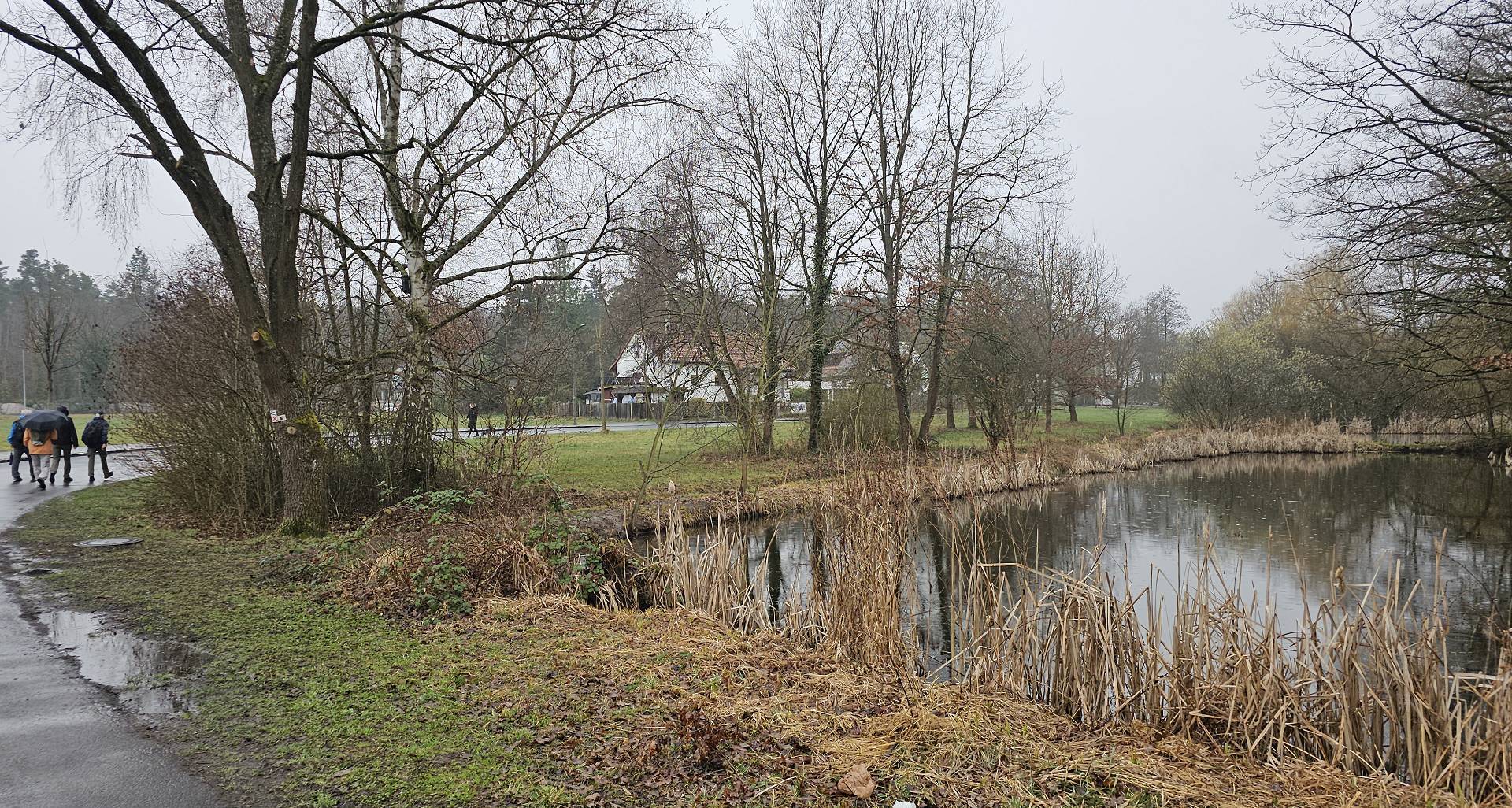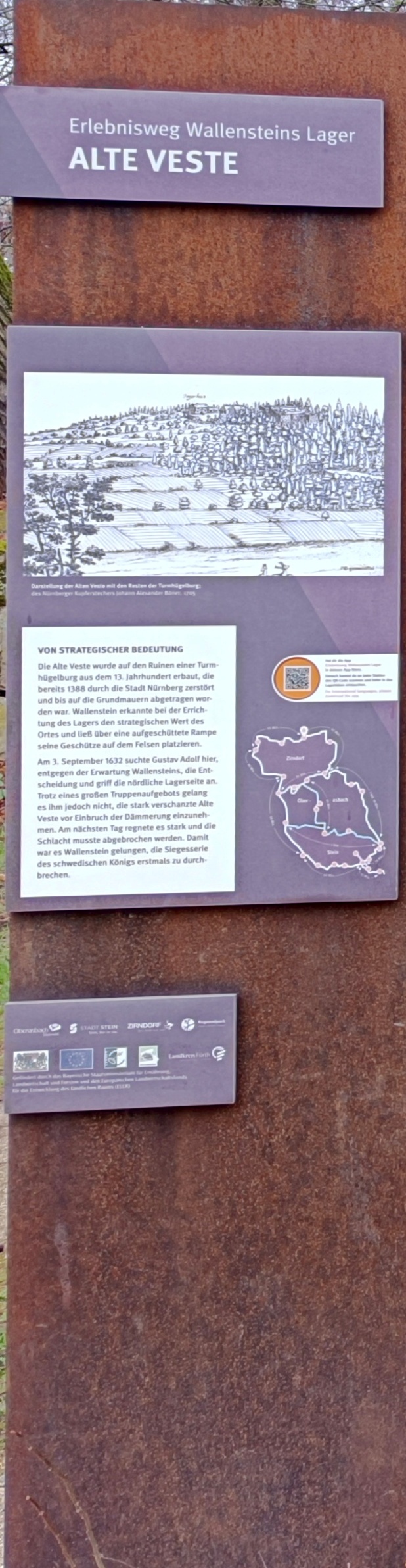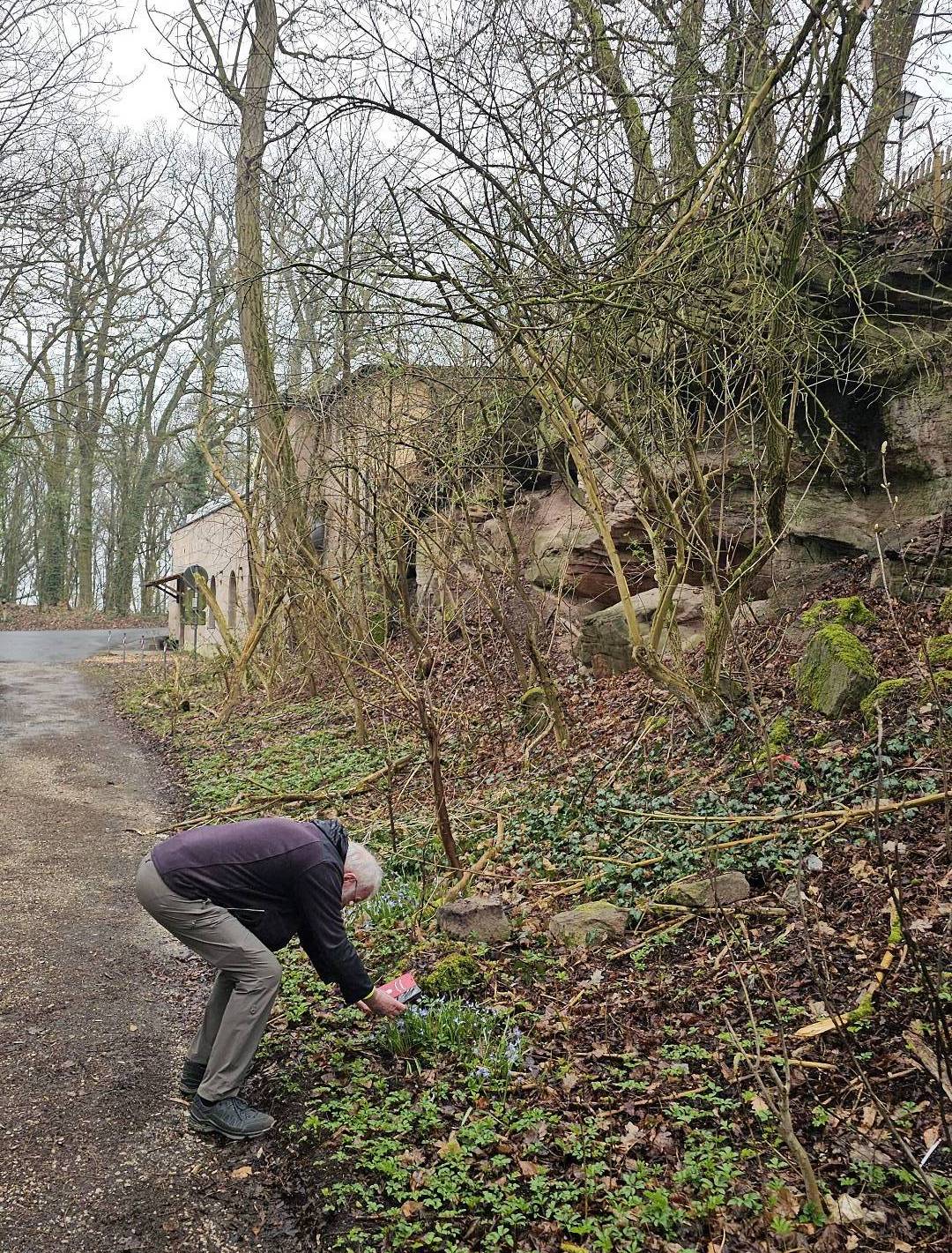 Heute war es nun so weit. Gestartet sind wir an der Bahnhaltestelle Fürth-Dambach. Nach wenigen 100 Metern Richtung Westen überquerten wir die Südwesttangente und den Main-Donau-Kanal - und waren auch schon im Grünen. Ein Stück parallel zum Dambach, dann, im Wald, am Grundigpark mit seinem langen Eternit?Asbest?zaun entlang, bis nach ca. 2 km der Vestner Turm vor uns durch die noch unbelaubten Bäume zu erkennen war. Nun ging es nach oben: Ca. 38 ziemlich steile und, nach leichtem Nieselregen, etwas rutschige Meter. Oben empfing uns eine gepflegte, nüchterne Anlage mit ein paar Informationstafeln - natürlich zu Wallenstein und Gustav Adolf, und der besagte Vestner Turm. Nach einer kurzen Pause, Karsten aktualisierte unser Geschichtswissen, ging es, auf wieder etwas rutschigen Pfaden, wieder runter, Richtung Osten. Wir durchquerten eine kleine Siedlung auf der (nicht Achim-) Grenzstraße und erreichten schnell den Rednitzgrund. Jetzt folgte ein schönes Stück Natur an der Bibert und an der alten Bibertbahn-Trasse entlang. Einige kamen richtig ins schwärmen ob der schönen Pfade in den Wiesen, der Frühlingsblütler, der Büsche mit den frischen Knospen und der von den Bibern noch stehengelassenen Bäume inmitten eines Verhaues von "gefällten" Bäumen. Das war es dann allerdings mit der schönen Natur ..., denn jetzt folgten 2 1/2 km Rothenburger- und Sigmundstraße, links und rechts Industrie und dazwischen Autos, Autos, Autos. Die schönen 6 km waren schnell vergessen und der Streckenplaner überstand dieses letzte Stück wohl nur deswegen (seelisch) unbeschadet, weil er bis zum Ziel in einem so großen Abstand vornweg marschierte, dass ihn das Stimmengewirr hinter ihm nur noch als leises Gesumse erreichte 🤣. Und dann waren wir am Ziel,