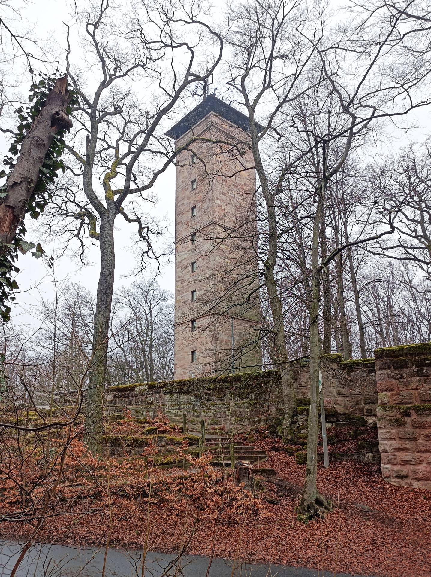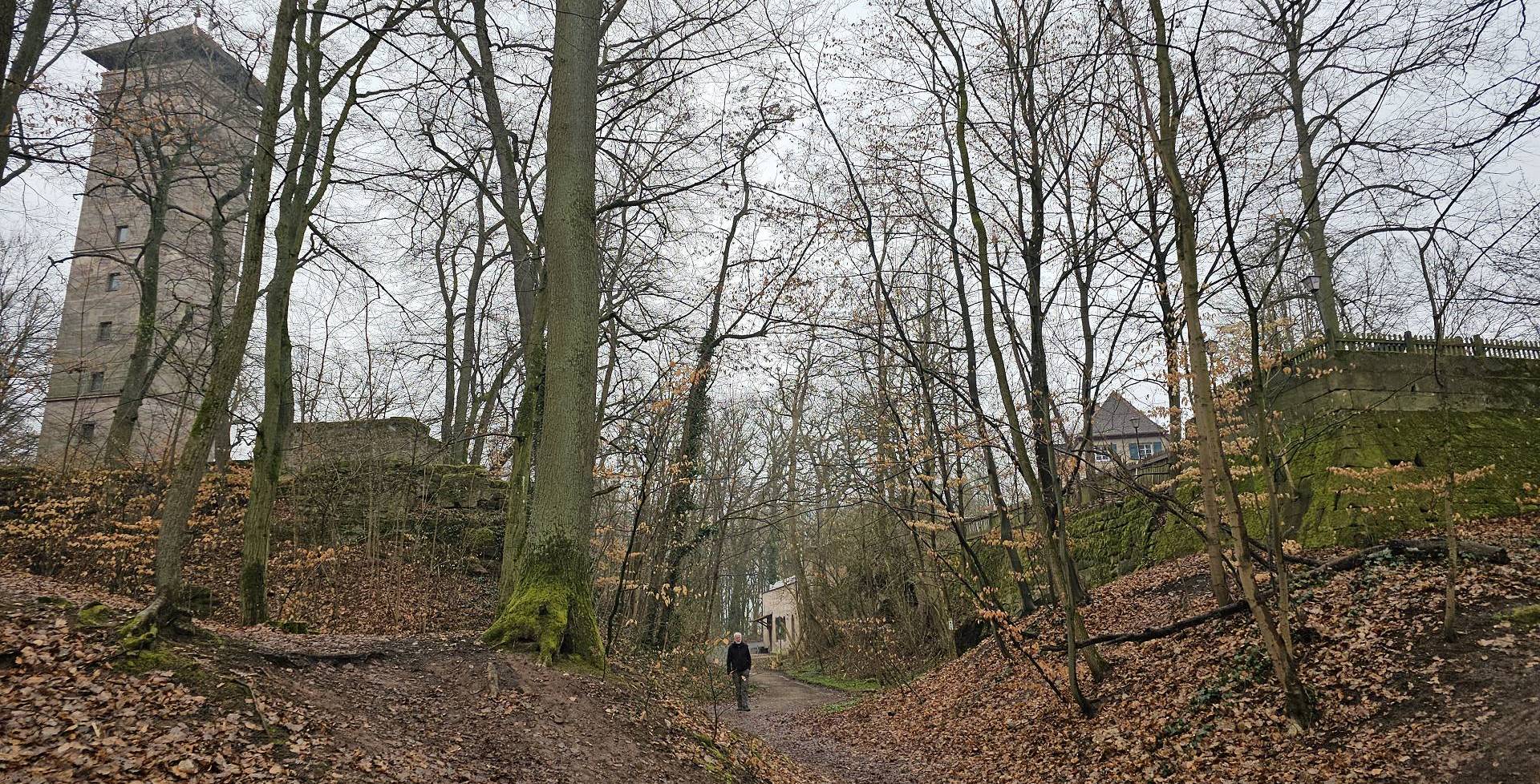 plötzlich taucht zwischen den noch unbelaubten Bäumen ein Turm auf |
