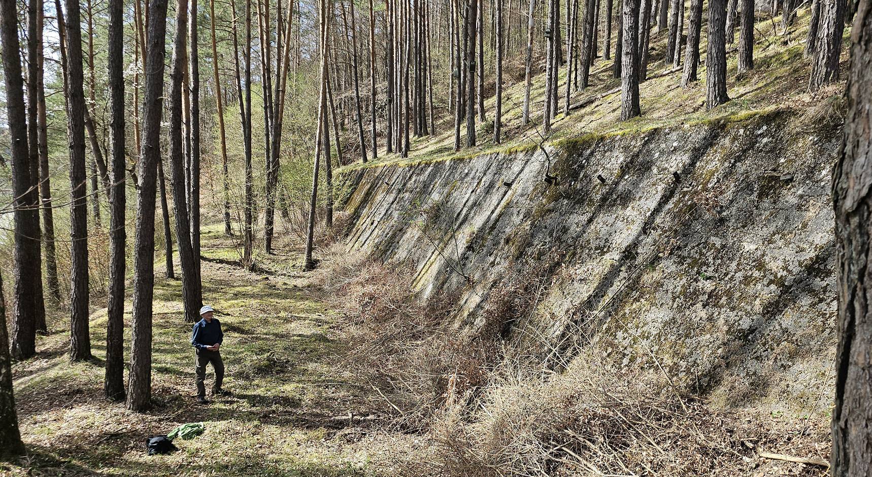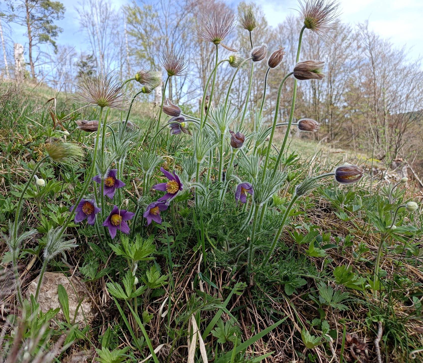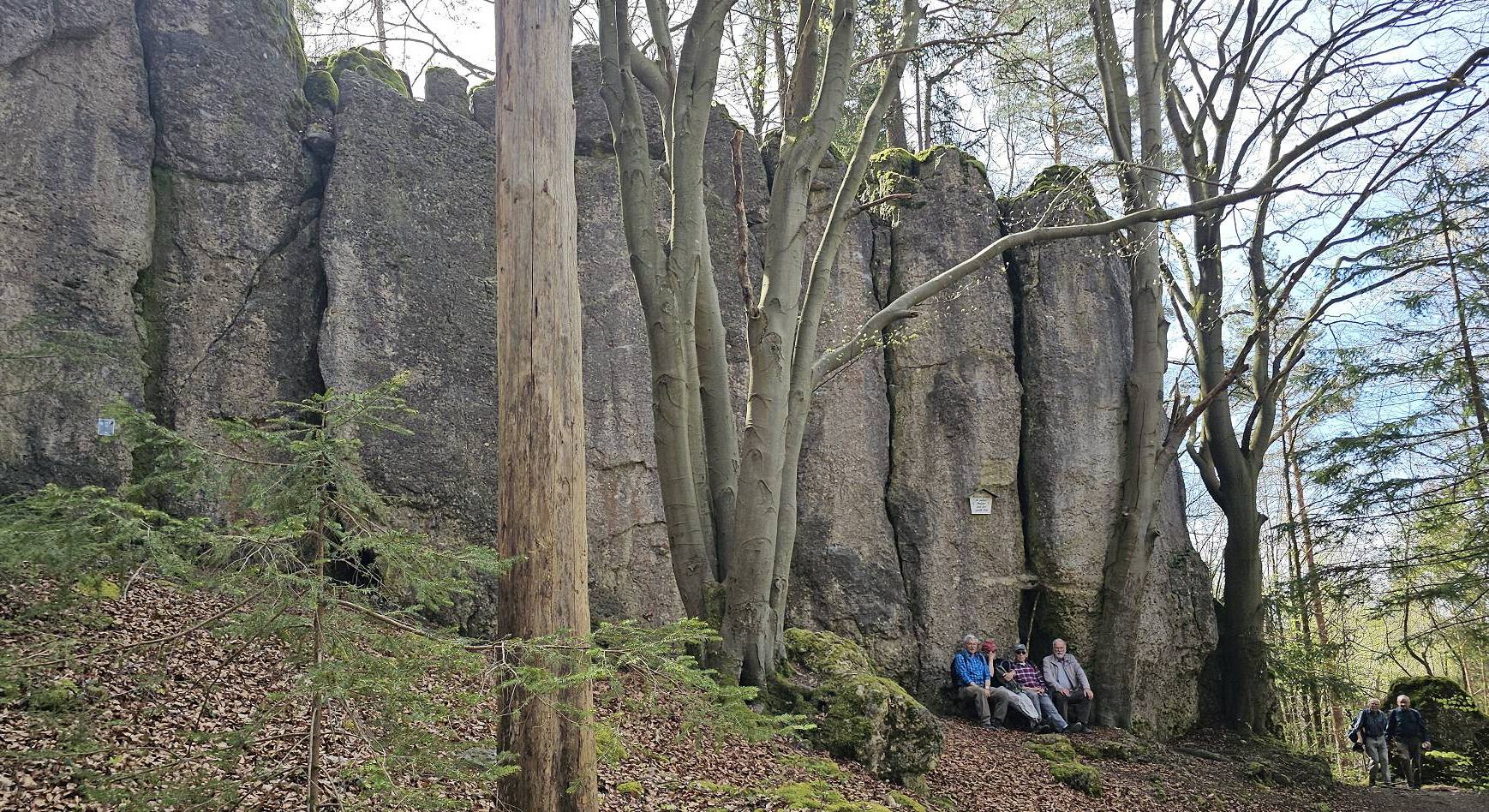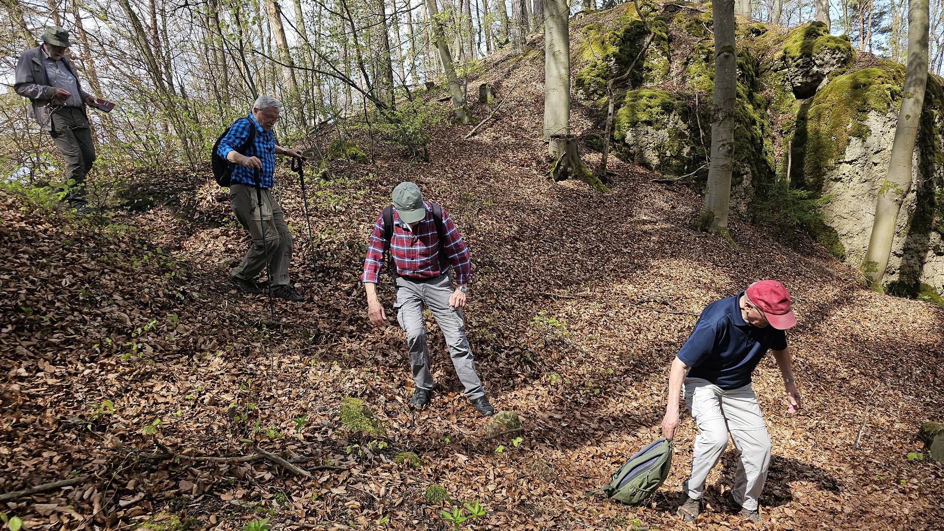 nach Hersbruck. Trotz dieser Erkenntnis quälen sich Karsten und Udo nach oben, Manfred ist vernünftiger und bricht nach einer Inspektion der unteren Fundamente ab. Oben wird man dann durch eine fulminanten Ausblick über die verschiedenen Formen der Fundamente belohnt, kann sich aber, trotz der ebenfalls reichlich vorhandenen Küchenschellen und vieler bunt blühenden Blümchen, Büsche und Bäume, nicht so richtig freuen, wenn man an den Größenwahn dieses "Versuchsmodells" und an den Wahnsinn des Ganzen denkt - und man denkt unweigerlich daran! |