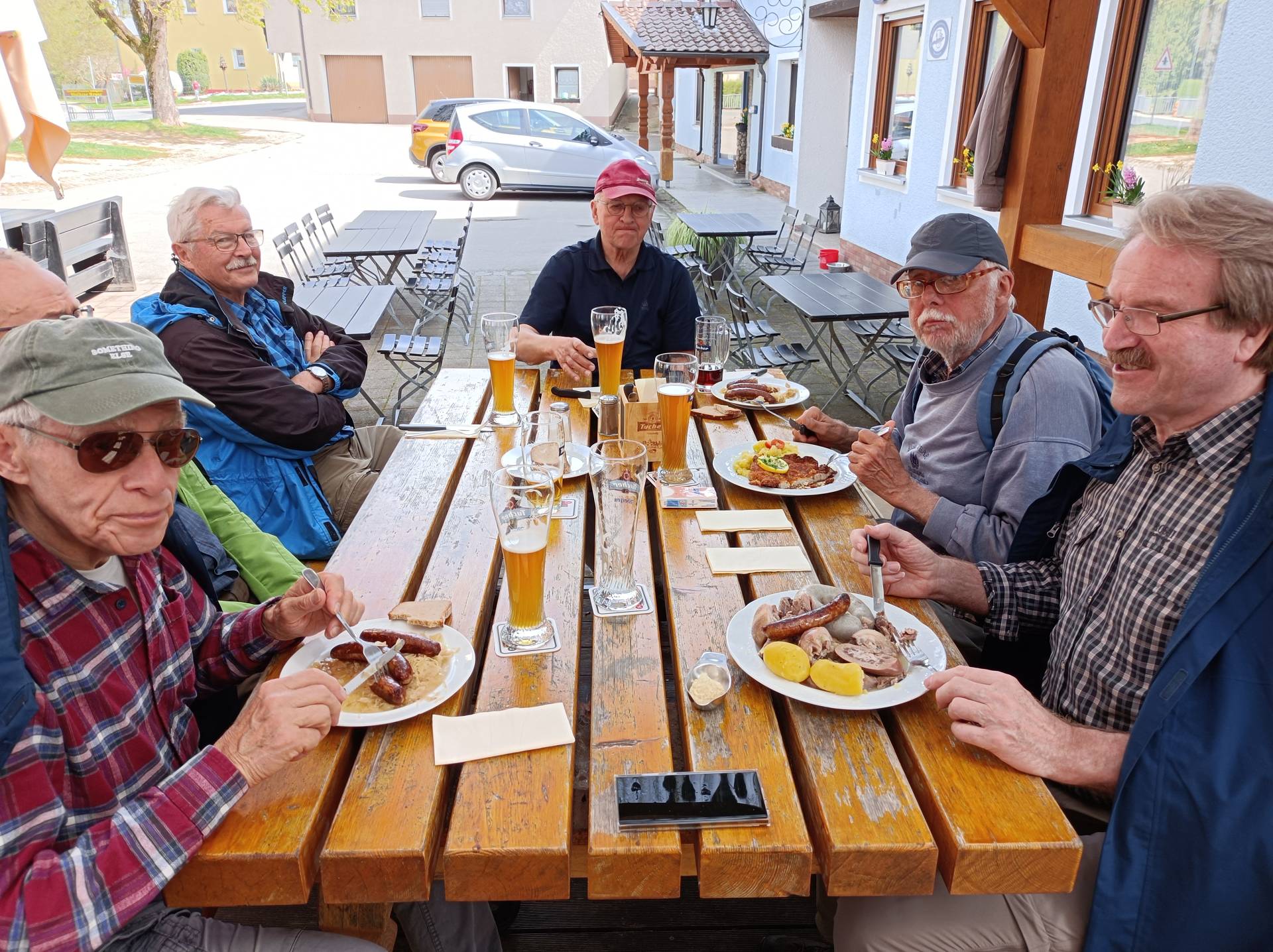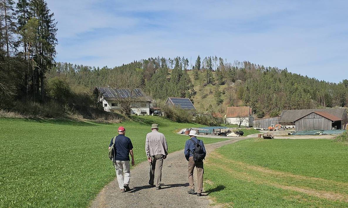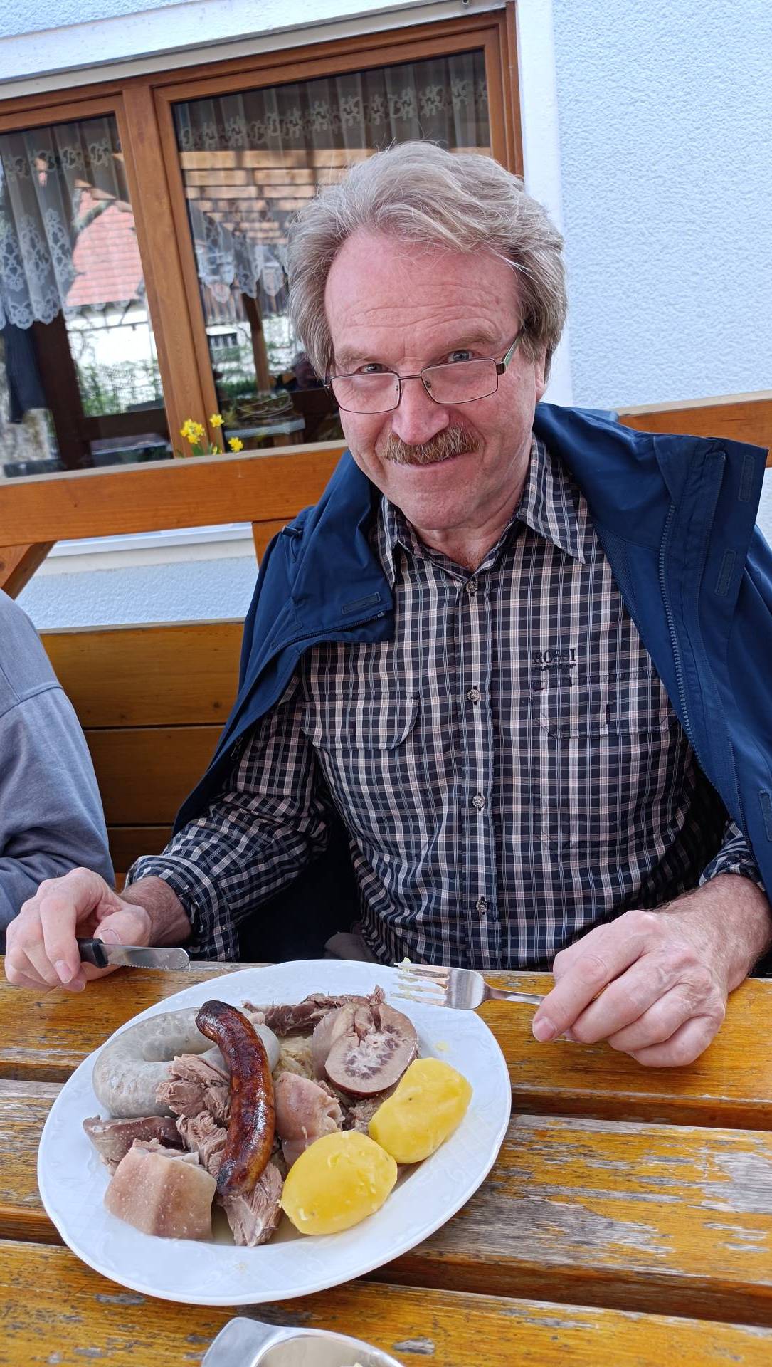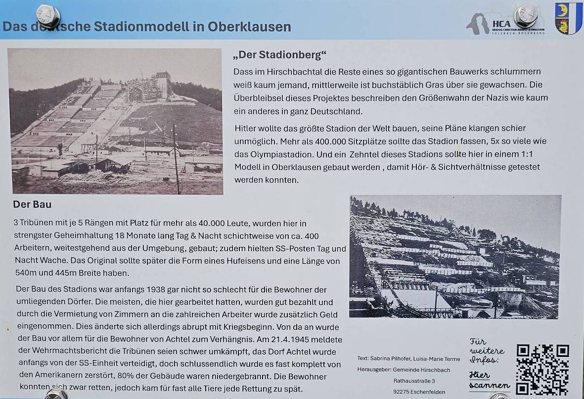 Und in dem kleinen Dorf, in dieser Abgeschiedenheit, gibt es doch tatsächlich noch zwei Gasthäuser, die der allgemeinen Wirtshausschließeritis trotzen! Die "Gaststätte Glöckner" oder "Goldener Stern" hat heute Ruhetag, also kehren wir ein in der "Goldenen Krone". Hier gibt es Mittwochs Schlachtschüssel - und Portionsgröße und Preisniveau sind so, dass man gern wiederkommt! Nach einer ausgiebigen Rast führt unser Weg direkt in die "Simultankirche St. Ulrich". Wir haben das dringende Bedürfnis nach einem inneren Dankesgebet. Dann geht es wieder in die Natur - und wieder nach oben! Gottseidank nicht so steil wie am Vormittag. Zuerst auf einem Feldweg, dann über eine (Wald-) Wiese in schöner Umgebung und durch München 😉, bis vor uns das Dörfchen Oberklausen auftaucht und wir das heutige Ziel, riesige Betonklötze, auf der anderen Seite des Tales erkennen können: die "Geistertribünen" am immer noch sogenannten "Stadionberg".