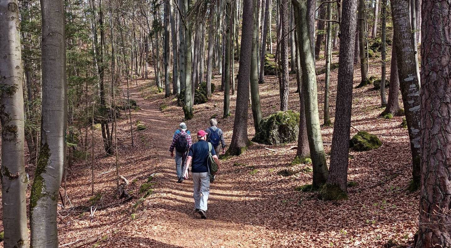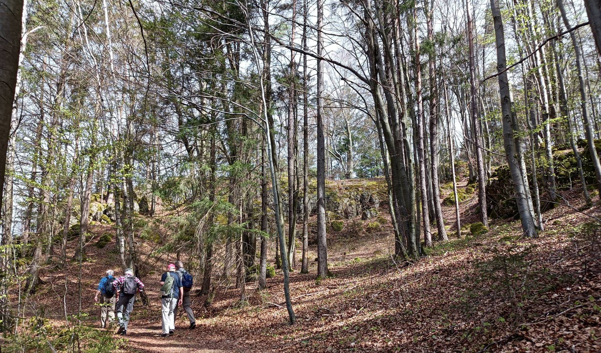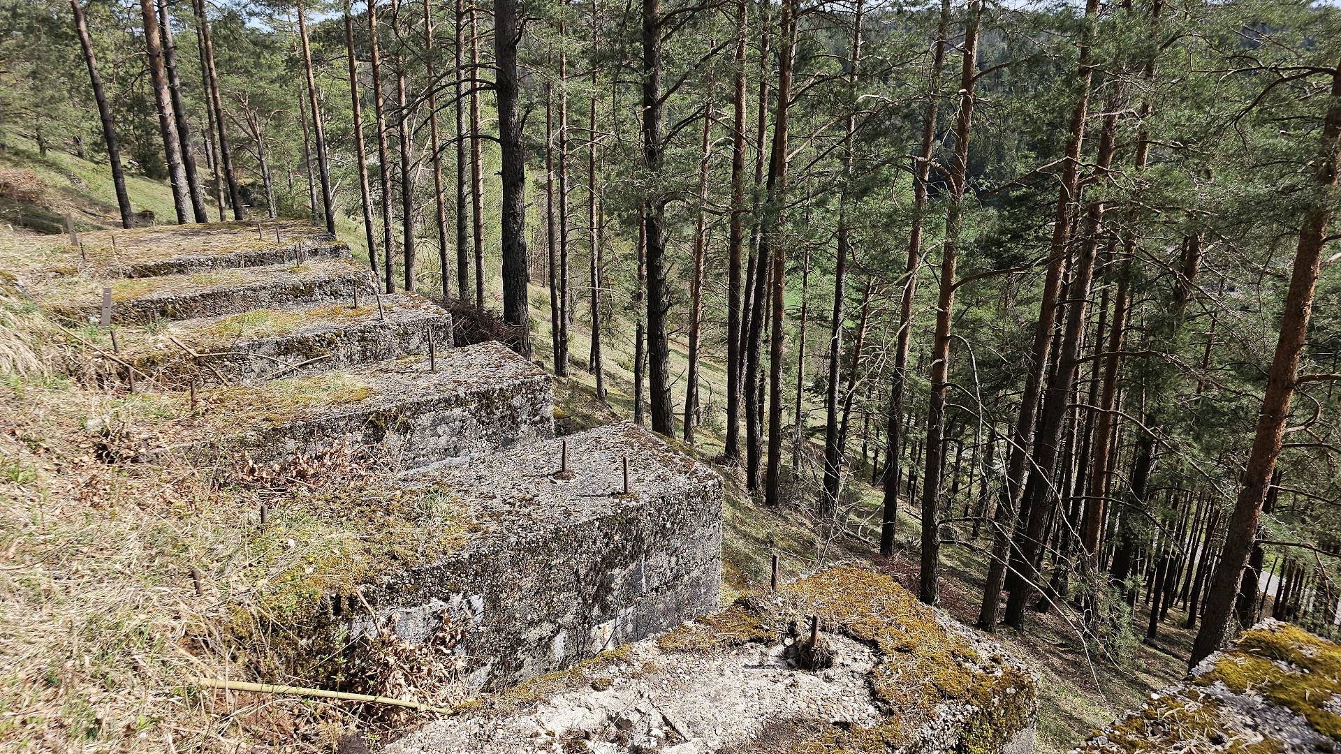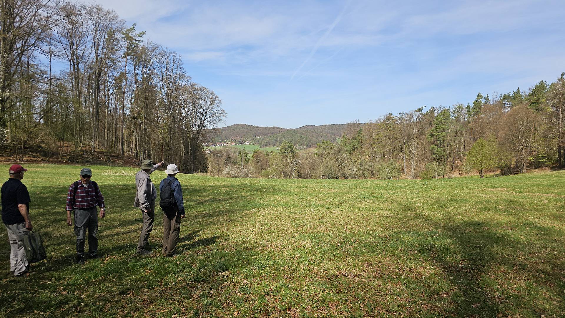 Und in dem kleinen Dorf, in dieser Abgeschiedenheit, gibt es doch tatsächlich noch zwei Gasthäuser, die der allgemeinen Wirtshausschließeritis trotzen! Die "Gaststätte Glöckner" oder "Goldener Stern" hat heute Ruhetag, also kehren wir ein in der "Goldenen Krone". Hier gibt es Mittwochs Schlachtschüssel - und Portionsgröße und Preisniveau sind so, dass man gern wiederkommt! Nach einer ausgiebigen Rast führt unser Weg direkt in die "Simultankirche St. Ulrich". Wir haben das dringende Bedürfnis nach einem inneren Dankesgebet. Dann geht es wieder in die Natur - und wieder nach oben! Gottseidank nicht so steil wie am Vormittag. Zuerst auf einem Feldweg, dann über eine (Wald-) Wiese in schöner Umgebung und durch München 😉, bis vor uns das Dörfchen Oberklausen auftaucht und wir das heutige Ziel, riesige Betonklötze, auf der anderen Seite des Tales erkennen können: die "Geistertribünen" am immer noch sogenannten "Stadionberg".