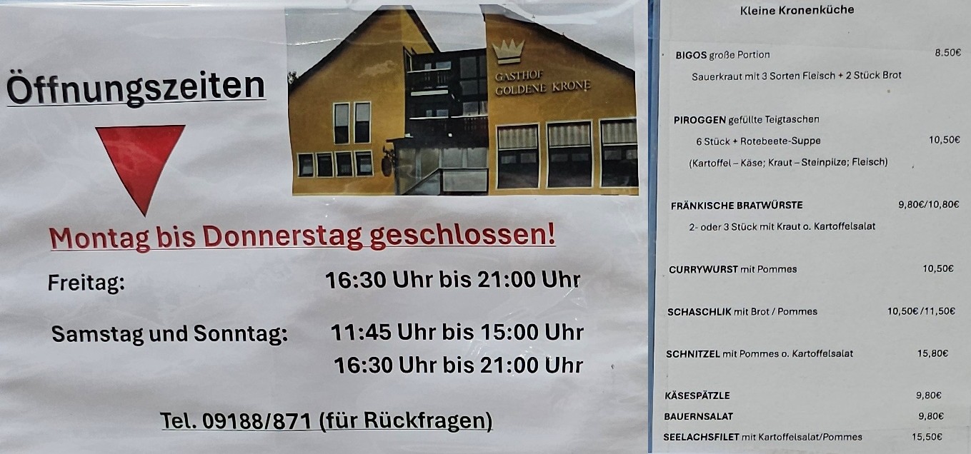alles viel schöner gewesen ... Schön auch, dass der Wirt der Goldenen Krone in Buch (+49 176 566 00100 / +49 9188 871) extra für uns geöffnet hat. Gern machen wir ein wenig Werbung für ihn - es wäre doch wirklich schade, wenn auch er schließen müsste - trotz des schönen Wandergebietes um Postbauer-Heng mit dem Dillberg, dem Goldkegel/-hut, dem Silbersand- und Poesieweg, den Bucher Höhlen und eben der Kaltenbachquelle.