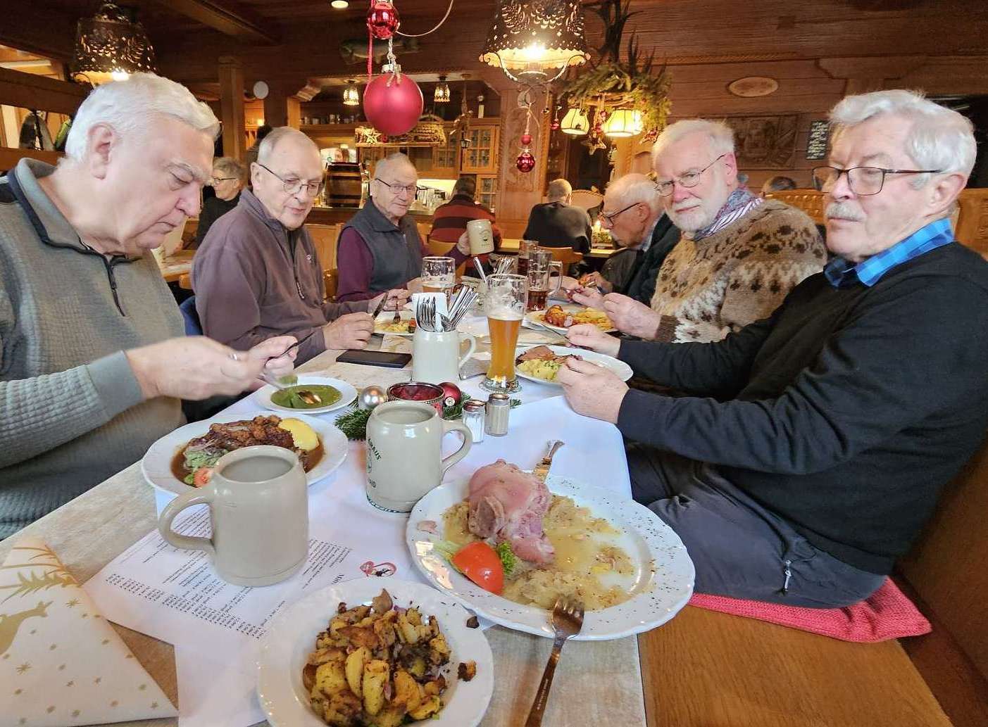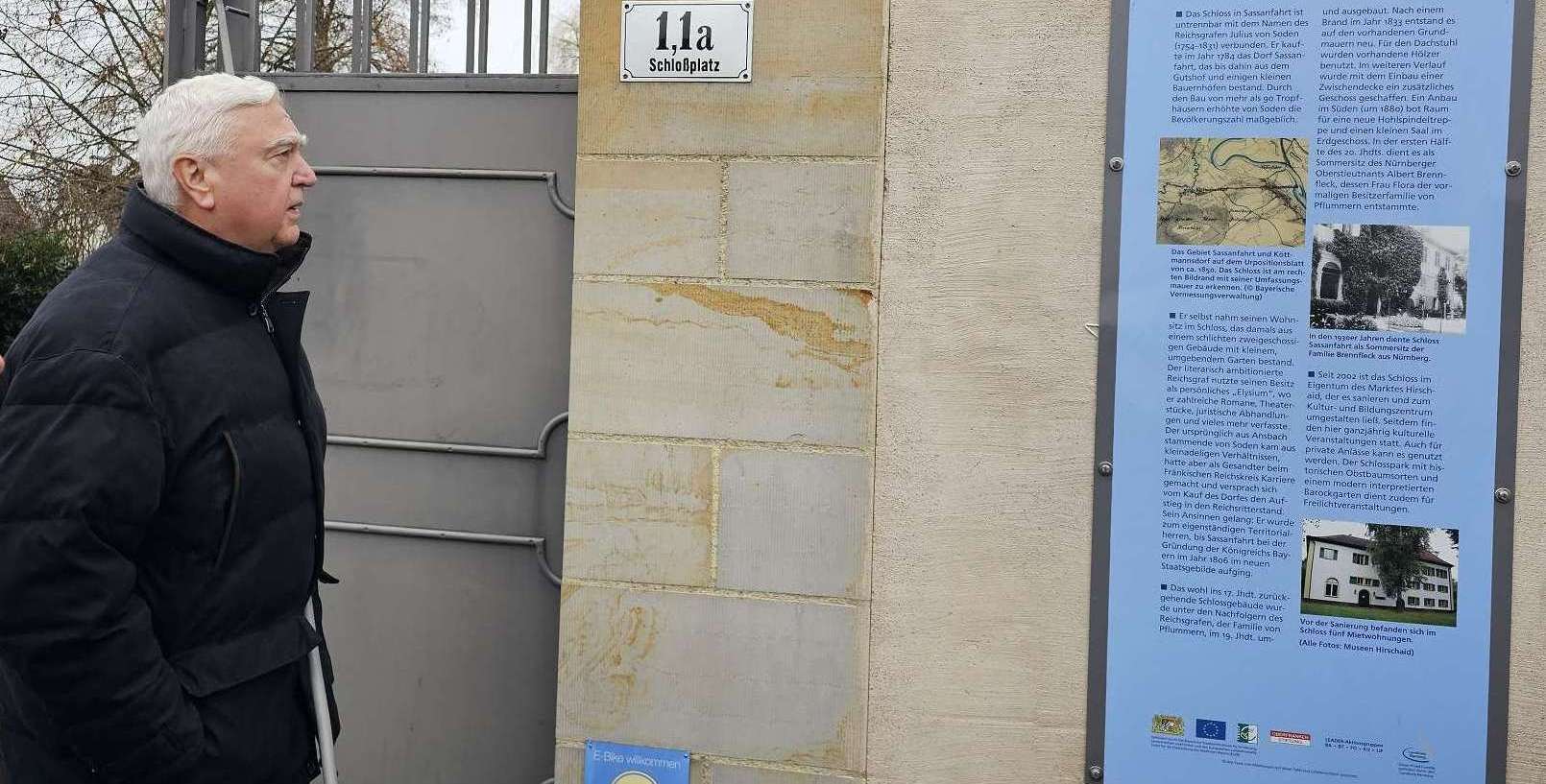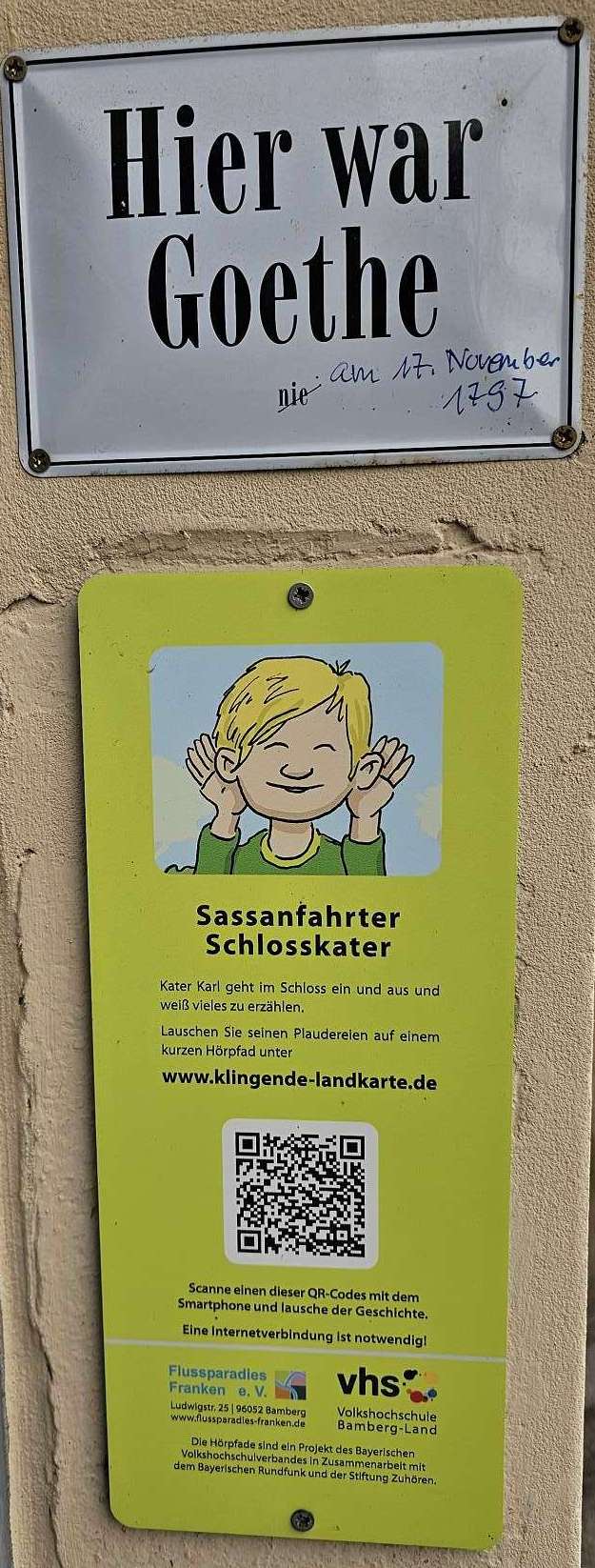 Darstellung" im Tempel). Schnell erreichen wir Sassanfarth, gehen durch den Schlosshof und werfen einen kurzen Blick auf das Schloss. Auch Goethe soll das getan haben - und offensichtlich hat er sich hier ordentlich benommen, im Gegensatz zu seinem Besuch in Tübingen 😂; Jedenfalls ist nichts Gegenteiliges bekannt. Weiter geht es (wieder zurück) über die Regnitz und über den Kanal, der hier ca. doppelt so breit ist, wie in Erlangen (warum so breit?). Wir schaffen die lange Brücke aber ohne Mühe und freuen uns trotzdem, dass sich der Brauerei-Gasthof Kraus gleich dahinter, am Ortseingang von Hirschaid befindet. Wie immer sind wir sehr zufrieden und hätten beinahe unseren extra vorverlegten Termin verpasst, weil ManniKe, mit dem Stichwort "Siemens-Gerätewerk", die kohärente Logorrhoe der Wirtin aktiviert hat. Als Dankeschön für den Austausch alter Erinnerungen hat sie ihm ein Tragerl Bier spendiert, dass er, Kamerad wie er ist, sofort an seine Mitwanderer verteilt! Tatsächlich wartet Herr
