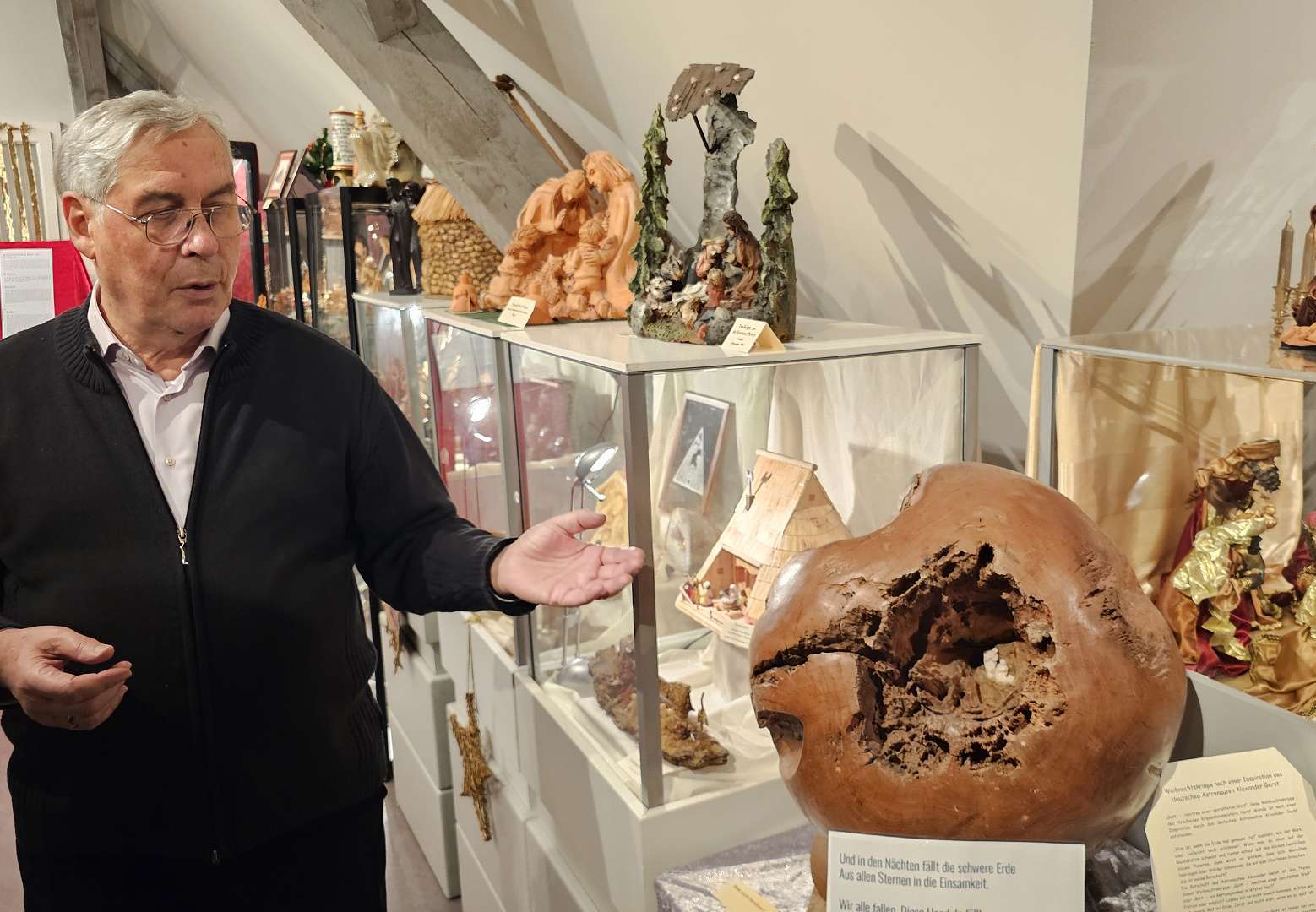 Nun aber folgt der Höhepunkt - der wahrlich einer ist: Das Krippenmuseum mit seinen ca. 450 Krippen aus über 40 Ländern aus 4 Erdteilen. Liebevoll und mit viel Fleiß in über 50 Jahren zusammengetragen vom 2014 verstorbenen Ehepaar Ingeborg und Hubert Patzelt, gepflegt und ergänzt durch das Ehepaar Bergmann, das von ihren Reisen immer wieder neue, besondere Krippen, Skulpturen und Bilder, die zur Weihnachtsgeschichte passen, mitbringt. Obwohl Kunst bei uns,
