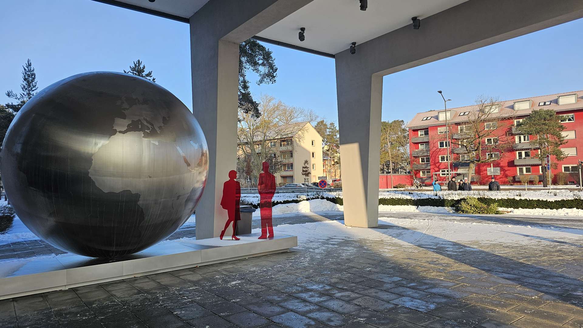 erstreckt, zu erkunden. Dann stehen wir auch schon vor dem ersten Heileit des heutigen Ausfluges: "The Wings ", ein ca. 10 Meter hoher und 15 Tonnen schwerer Koloss des Architekten Daniel Libeskind. Aber warum englisch "The Wings"? Weil man sich für die deutsche Sprache schämt? oder möchte man den ausländischen Besuchern, die zwar nach Deutschland gekommen sind, um etwas deutsches zu sehen, zu lernen, nicht zumuten, sich mit der deutschen Sprache zu beschäftigen? Oder sollte der Betrachter nur im Unklaren darüber gelassen werden ob es sich hier um Flügel oder um Tragflächen handelt? Vielleicht kann ein Besuch am späten Abend zumindest Aufschluss darüber geben, denn dann kann das Werk mit in die Oberfläche eingelassen LEDs beleuchtet werden - was eher auf den zweiten Begriff hindeutet.Das Gelände auf der anderen Seite der Günter-Scharowsky-Staße ist nun tatsächlich komplett zugänglich, die neuen Gebäude können alle "umrundet" werden - ob man in alle auch hinein kann, haben wir nicht getestet. Hier gibt es mehrere Lokale, ein Büro der IGM und das Health-Care-Center, das ehemalige Gesundheitszentrum - offensichtlich auch für englisch sprechende Kundschaft gedacht Zwischen den Gebäuden steht die bunte, ca. 4 m hohe 'in eine offene Zukunft scheibenschleudernde Figur "The Entwurf'". Seine Internationalität erhält sie aus dem Artikel; Leider sagt der nichts über das Genus aus, weswegen "Inges Idee" wohl eine gendergerechte "Figur" beschreibt, bei der sich durch den gewählten Artikel sogar das "...*in" erübrigt.