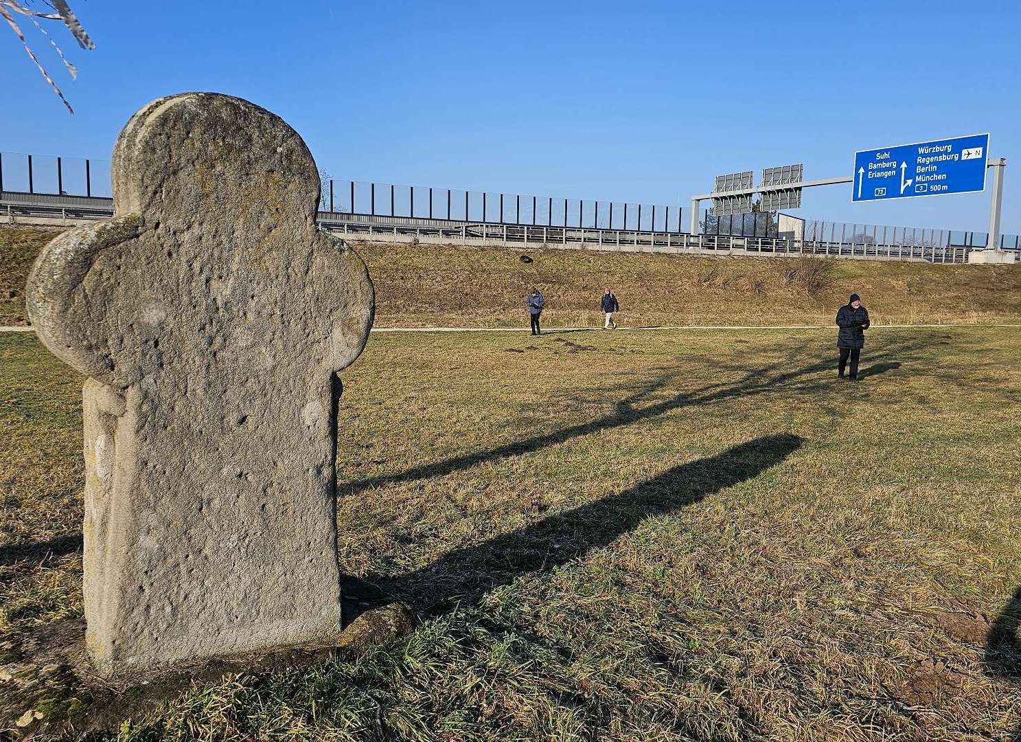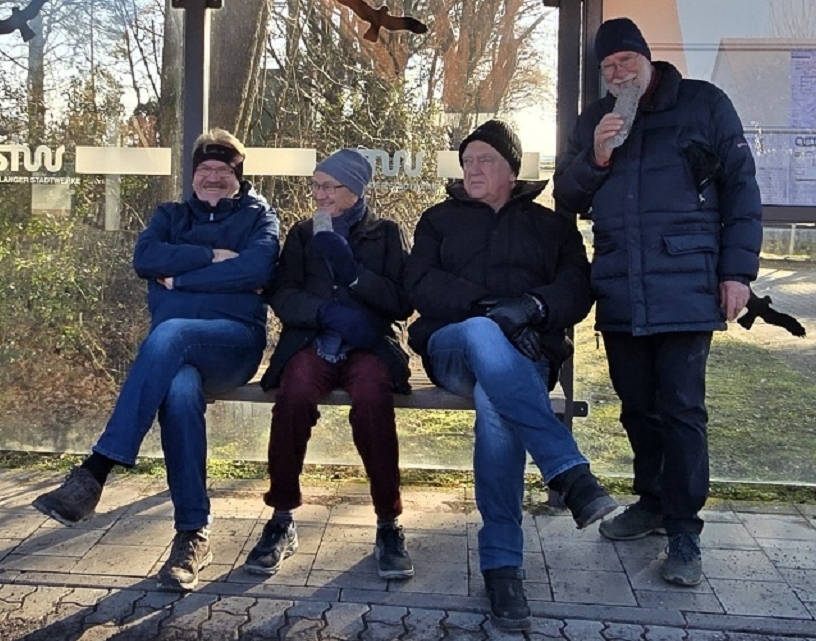 Wir gehen neue Wege und erkunden die südliche Umgebung von Eltersdorf Der Popp steht schon seit längerem wieder mal auf der Wunschliste unserer Gourmets und Gourmands. Und auf der Suche nach neuen Wegen zu schon oft besuchten, da beliebten, Zielen, stach die Gegend südlich von Eltersdorf ins Auge. Das Gebiet ist relativ unbekannt für uns und da über die in diesem Gebiet liegende "Königsmühle" noch vor kurzem viel zu lesen und zu hören und unsere Neugier noch wach war, war eine neue Strecke schnell gefunden. Wir starten an der S-Bahn-Haltestelle Eltersdorf und laufen an der westlichen Seite der Bahn, am Ortsrand zwischen Bahn und A73, nach Süden. Gleich am Ortsende entdecken wir ein Flurdenkmal - Karsten ist begeistert, da er es noch nicht auf seiner Liste hat. Pit und Manni starten sofort eine Bildsuche: