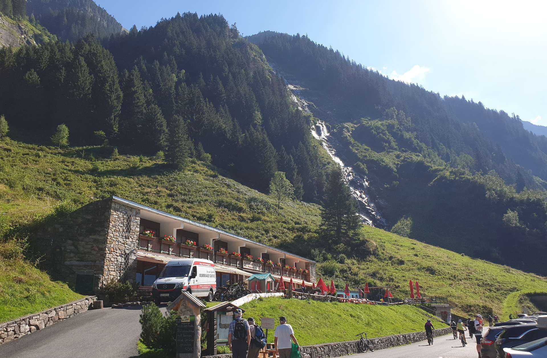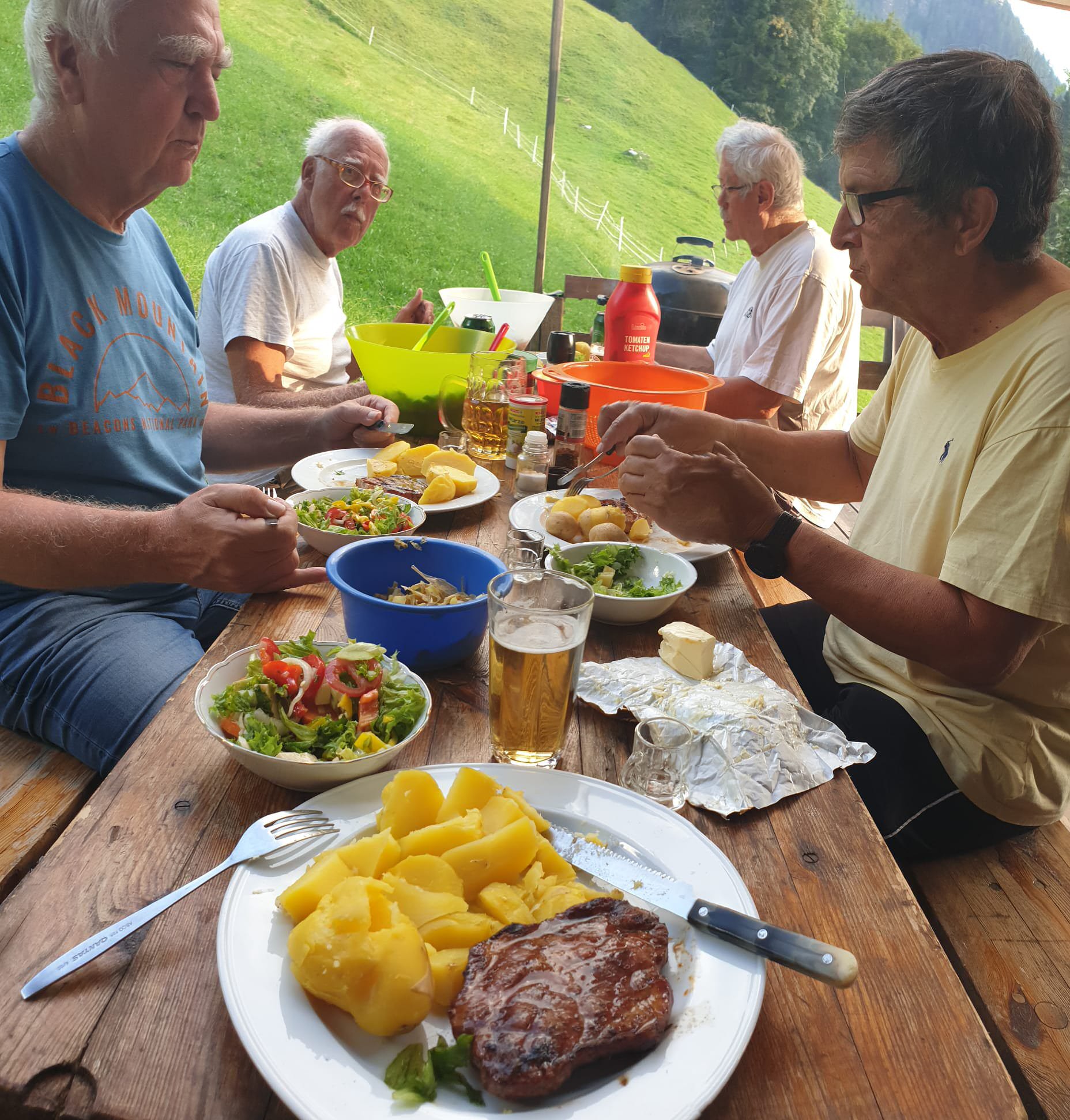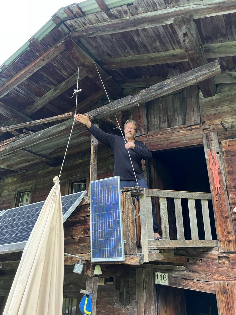 Tegernsee. Nächster Halt war beim Hofer - schon im Zillertal: Dort versorgten wir uns mit dem Wichtigsten für die kommenden 3 Tage: Bier, Wein, etwas zum Verdauen und ein bisschen zu Essen. Die niedrige Teilnehmerzahl wirkte sich übrigens kaum auf die Menge des Einkaufes aus. So starteten wir unseren Hüttenaufenthhalt mit Kaffe und Kuchen auf der neuen Terrasse (merken: Tiramisu-Menge im nächsten Jahr verfünffachen). Vorher wurde natürlich die Infrastruktur aufgebaut und in betrieb genommen. Nicht nur die Terrasse ist nun wieder trittsicher, dank Henry und seiner fleißigen Söhne ist nun auch der Wasserverteilungs- und -erwärmungskomfort kaum noch zu toppen und für die Strom- und Lichtverteilung gibt es ***. Gefehlt hatte lediglich ein Siemens-Lufthaken fürs Sonnensegel. Ein wenig Wind hat regelmäßig die improvisierten Befestigungen geknickt. Nun hatte Udo die rettende Idee (siehe letztes Bild) und wir konnten das Nachtessen an frischer Luft ohne einen Sonnenbrand zu riskieren im Freien einnehmen.