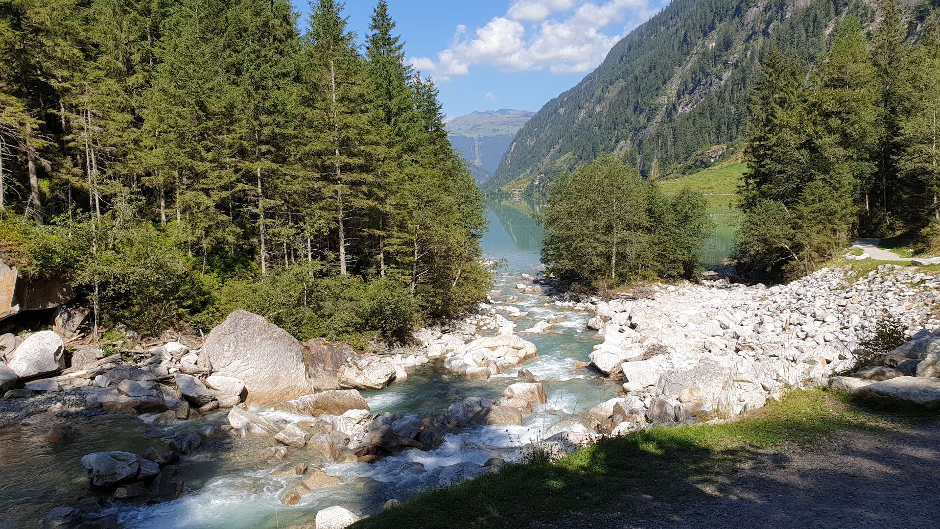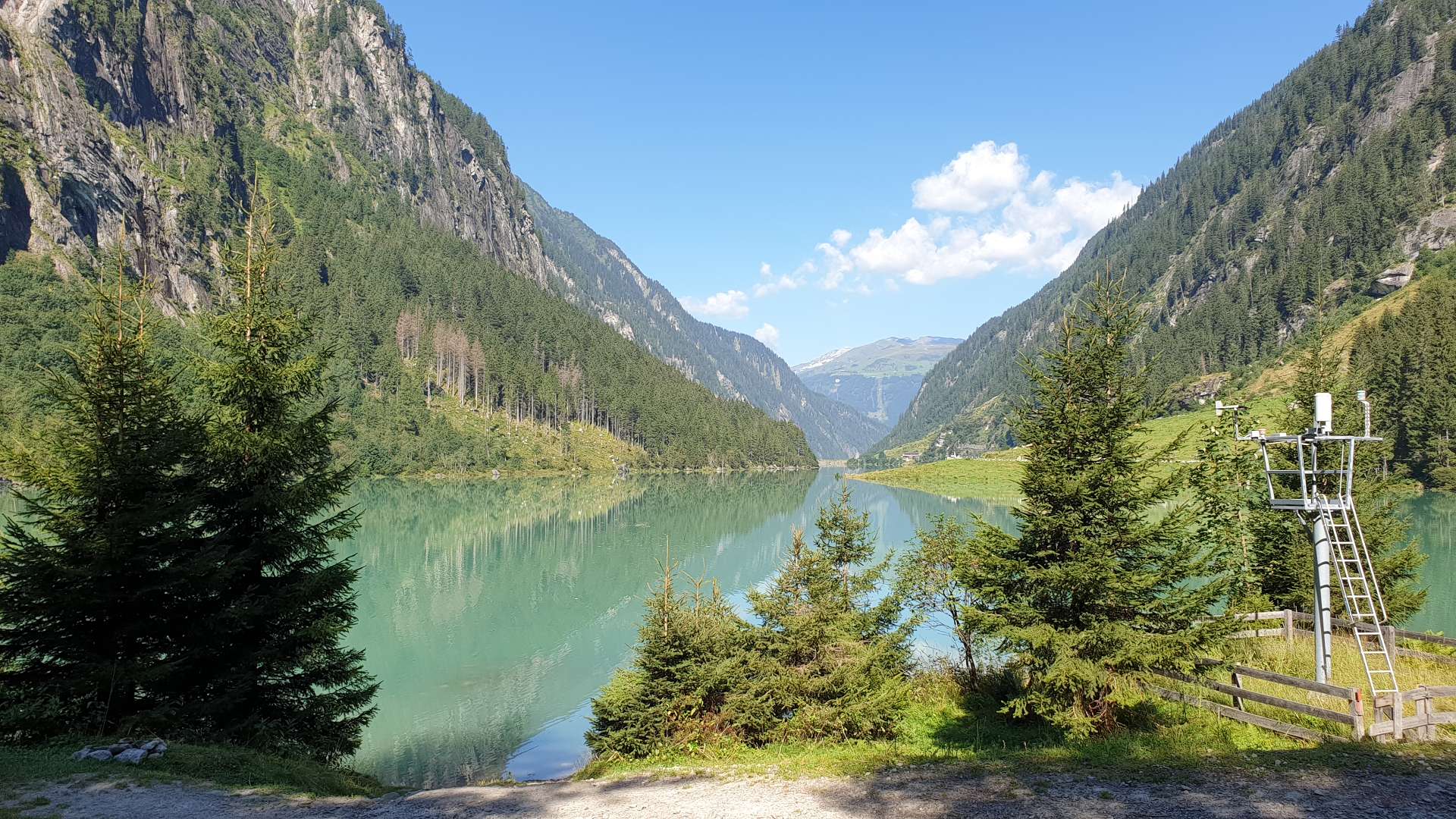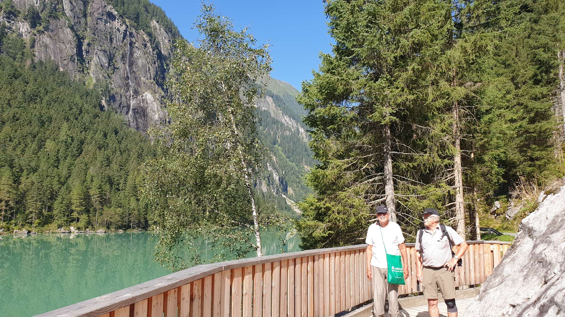 Tegernsee. Nächster Halt war beim Hofer - schon im Zillertal: Dort versorgten wir uns mit dem Wichtigsten für die kommenden 3 Tage: Bier, Wein, etwas zum Verdauen und ein bisschen zu Essen. Die niedrige Teilnehmerzahl wirkte sich übrigens kaum auf die Menge des Einkaufes aus. So starteten wir unseren Hüttenaufenthhalt mit Kaffe und Kuchen auf der neuen Terrasse (merken: Tiramisu-Menge im nächsten Jahr verfünffachen). Vorher wurde natürlich die Infrastruktur aufgebaut und in betrieb genommen. Nicht nur die Terrasse ist nun wieder trittsicher, dank Henry und seiner fleißigen Söhne ist nun auch der Wasserverteilungs- und -erwärmungskomfort kaum noch zu toppen und für die Strom- und Lichtverteilung gibt es ***. Gefehlt hatte lediglich ein Siemens-Lufthaken fürs Sonnensegel. Ein wenig Wind hat regelmäßig die improvisierten Befestigungen geknickt. Nun hatte Udo die rettende Idee (siehe letztes Bild) und wir konnten das Nachtessen an frischer Luft ohne einen Sonnenbrand zu riskieren im Freien einnehmen.