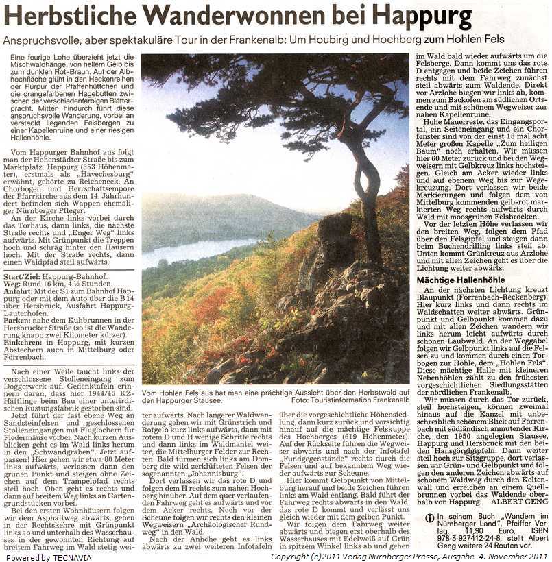 - Herbstliche Wanderwonnen bei Happurg, 16 km mit Karte, (Artikel), auch mit dem VGN