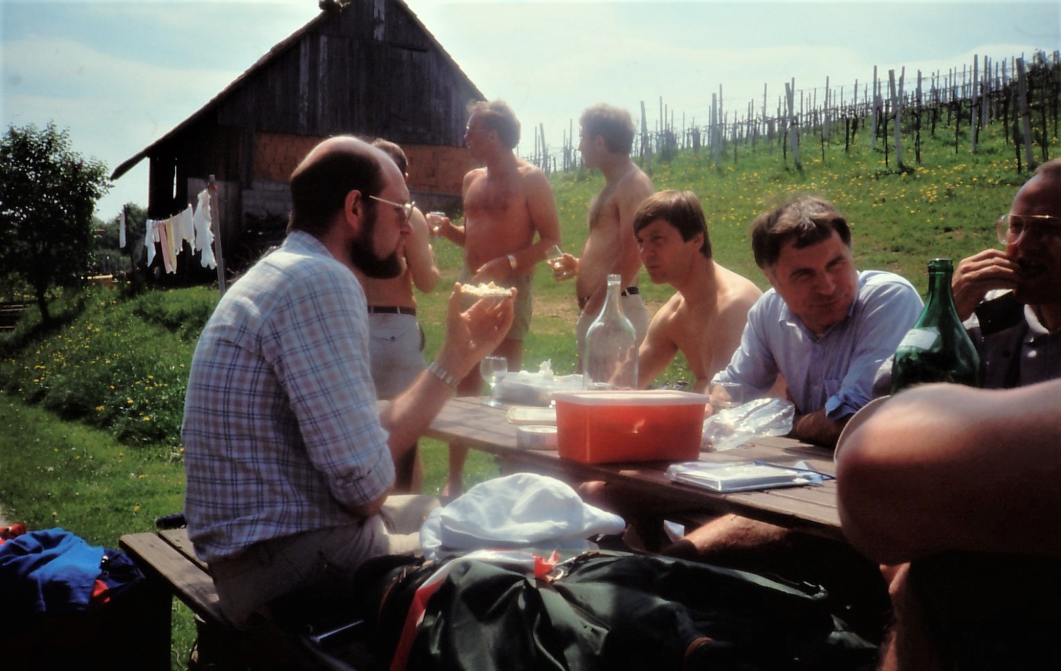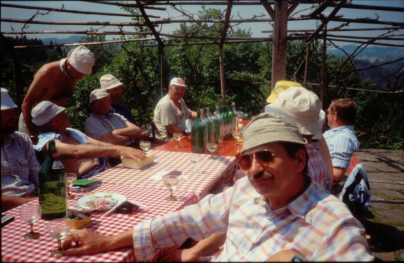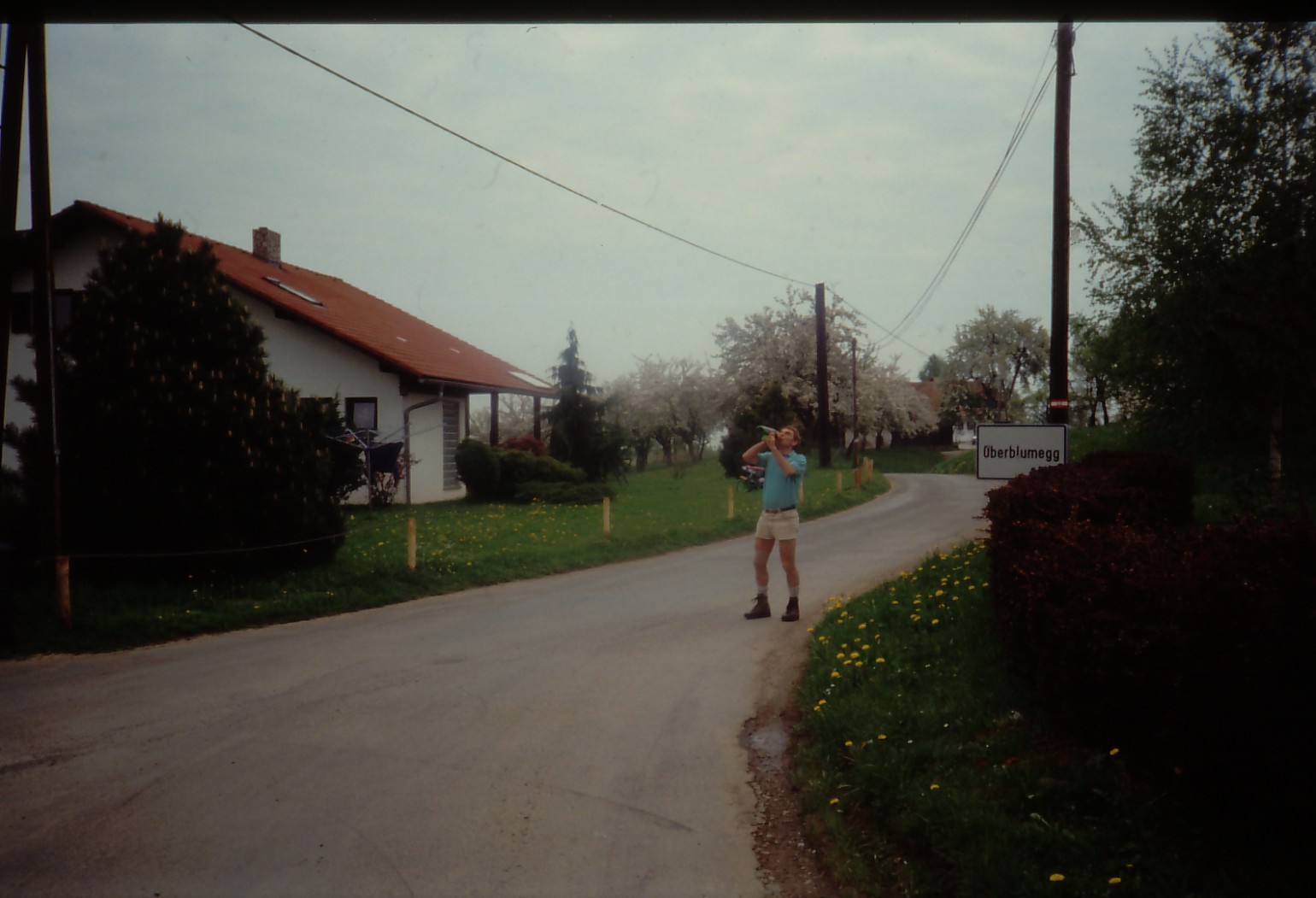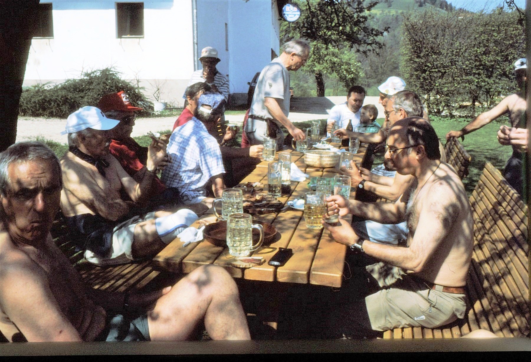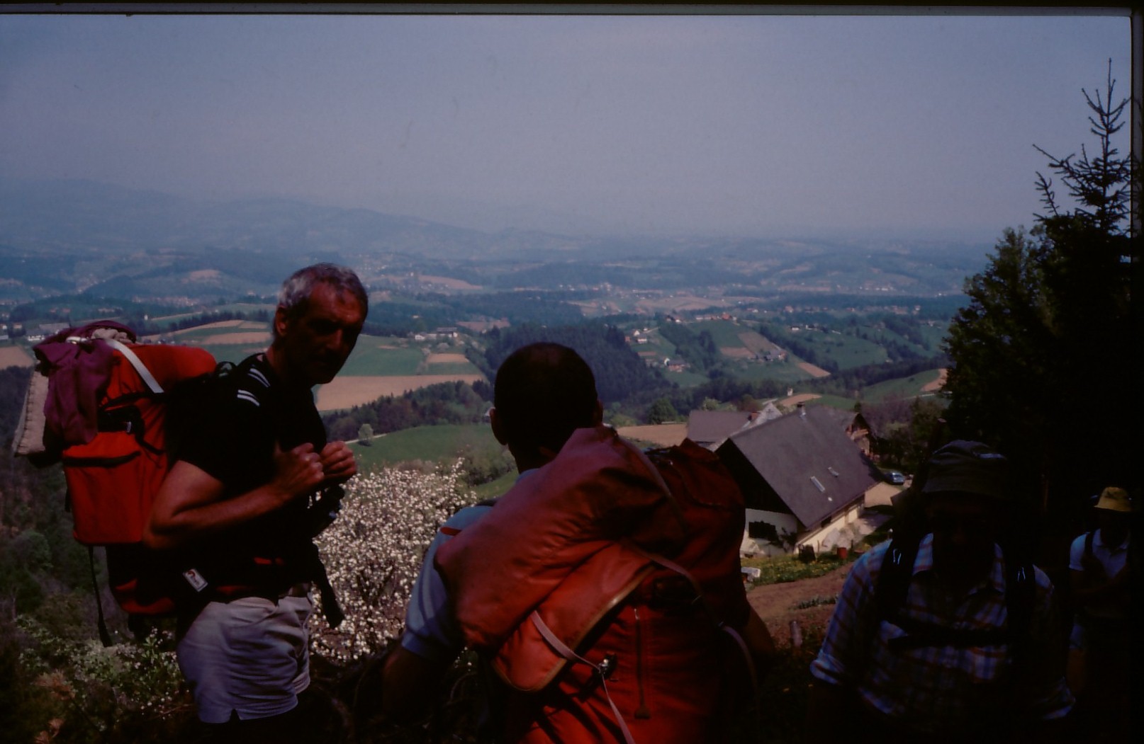 | o | Auf dem Weg von Remschnigg hinunter nach Leutschach. Horst-Dieter schimpft 'mal wieder auf das Rauchen: "Auf der einen Seite riechen die (die Raucher) ja auch ganz schön". Darauf Rudi: "Auf der anderen Seite riechen die ganz anders" |