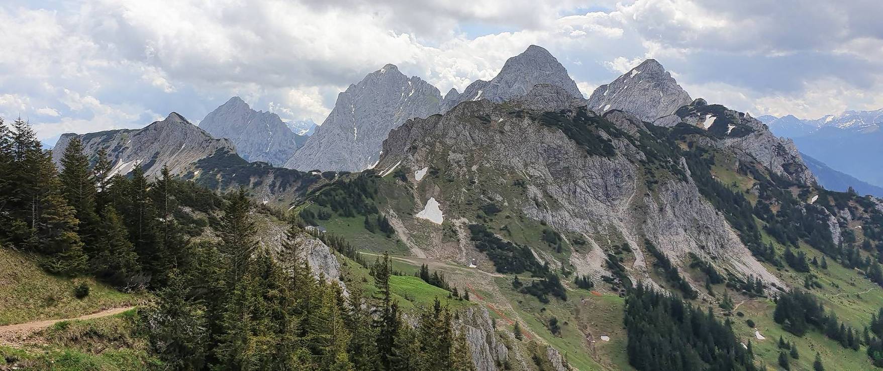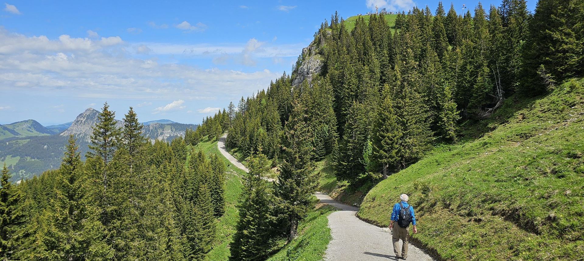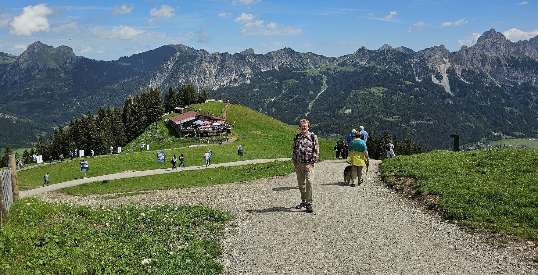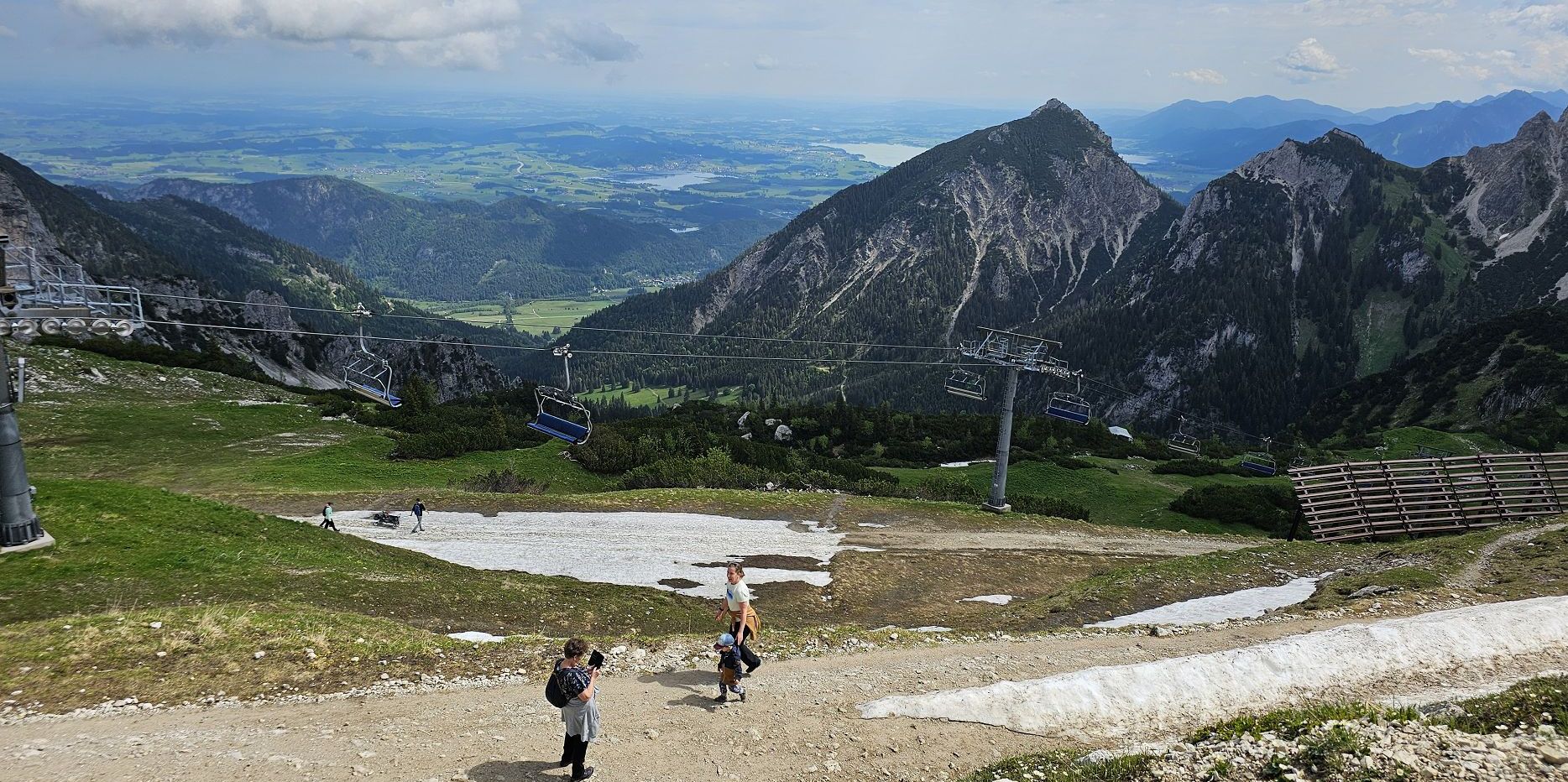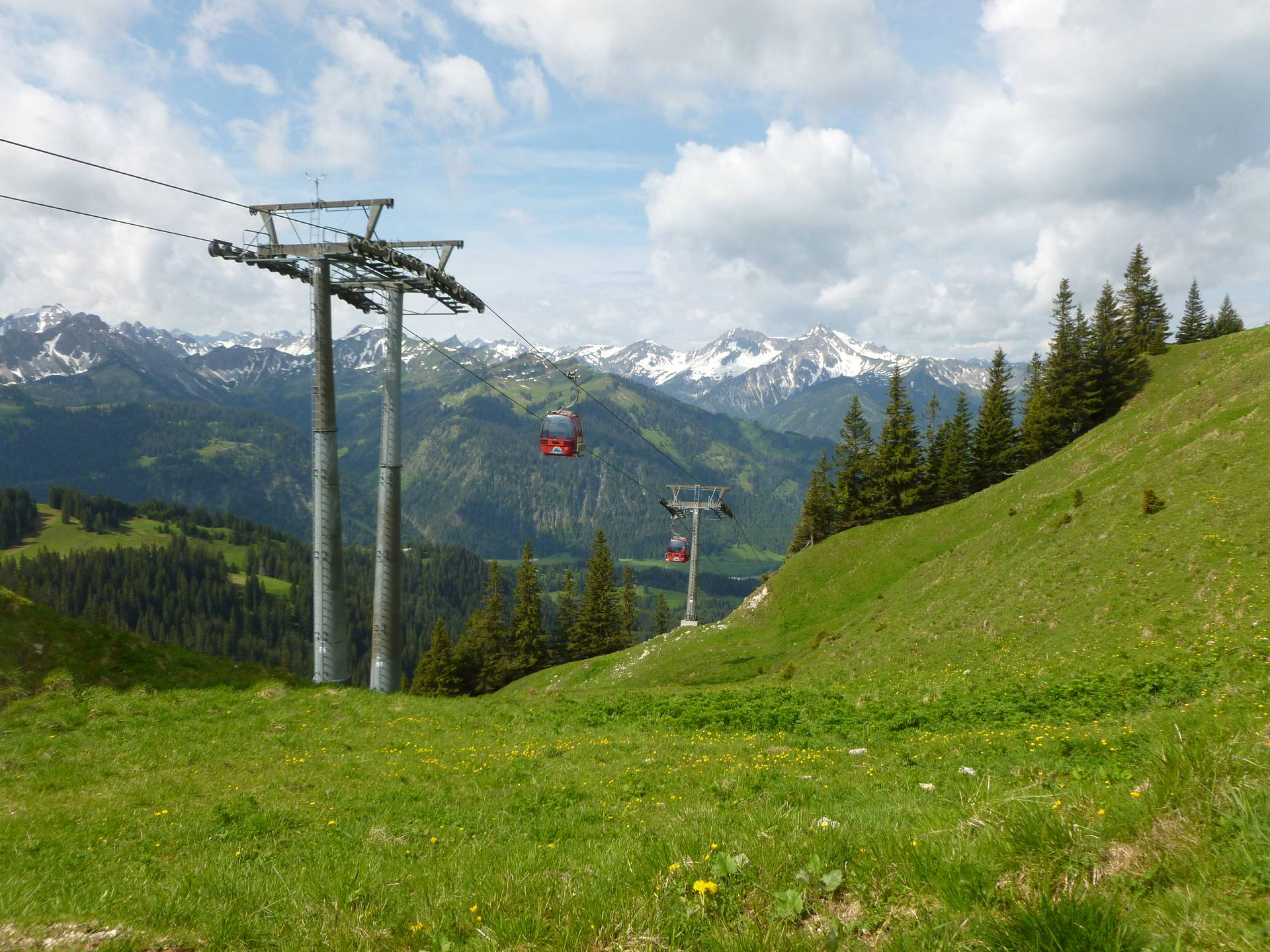 ![]() oben: am Heimweg zwischen Tannheim und Haldensee - links die Gondel zum Füssener Jöchle Tag 6, Samstag, 8.6.24: von Tannheim mit der Gondel aufs 9er-Köpfle |